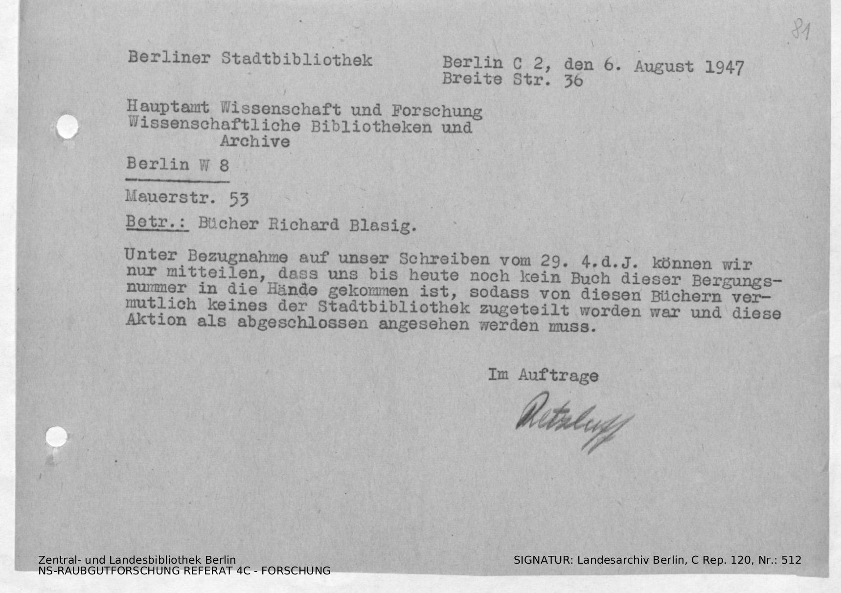 Antwortschreiben zu Suchergebnissen nach Bibliothek des Herrn Blasig