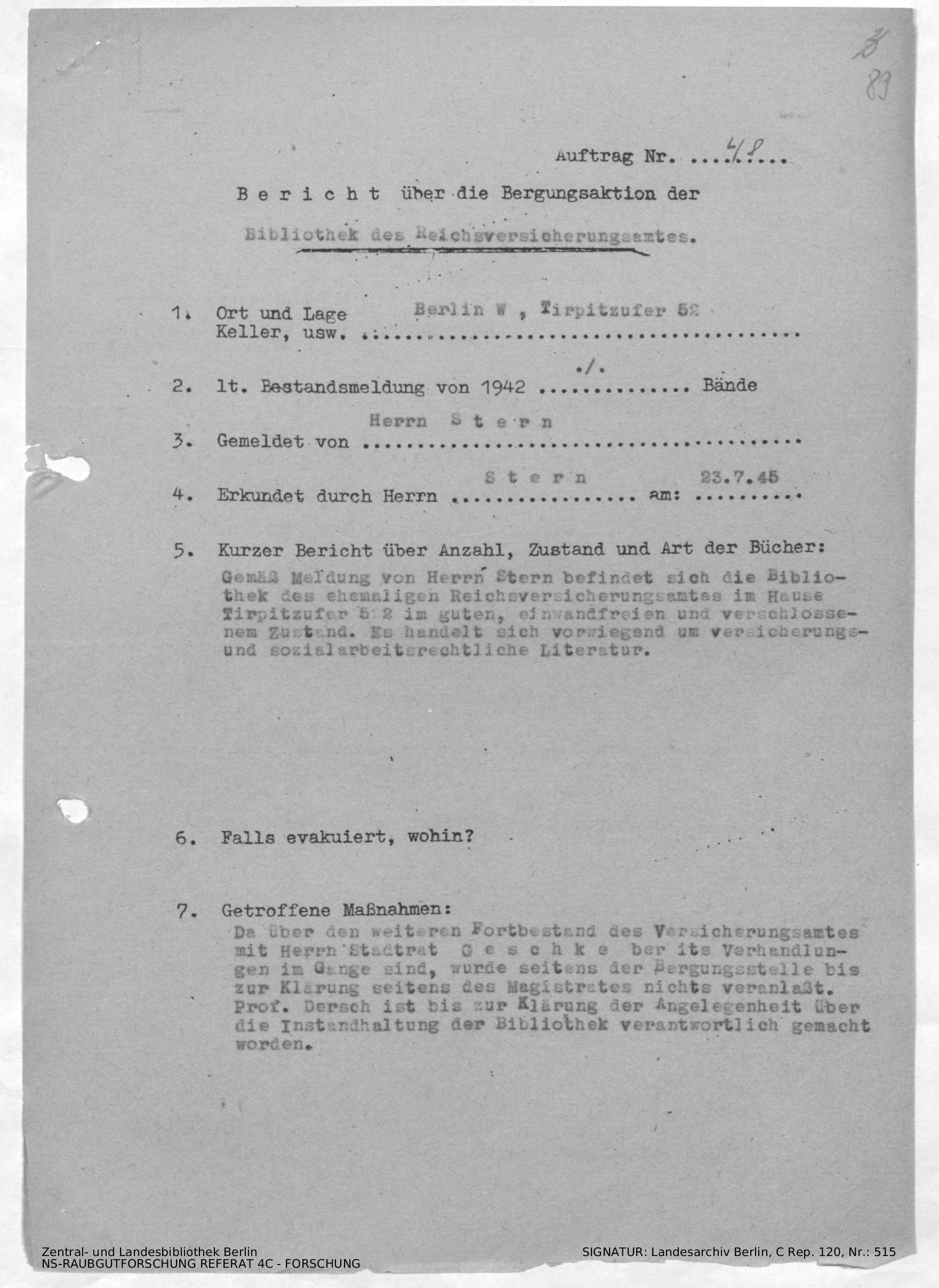 Bericht über die Bergungsaktion der Bibliothek des Reichsversicherungsamtes