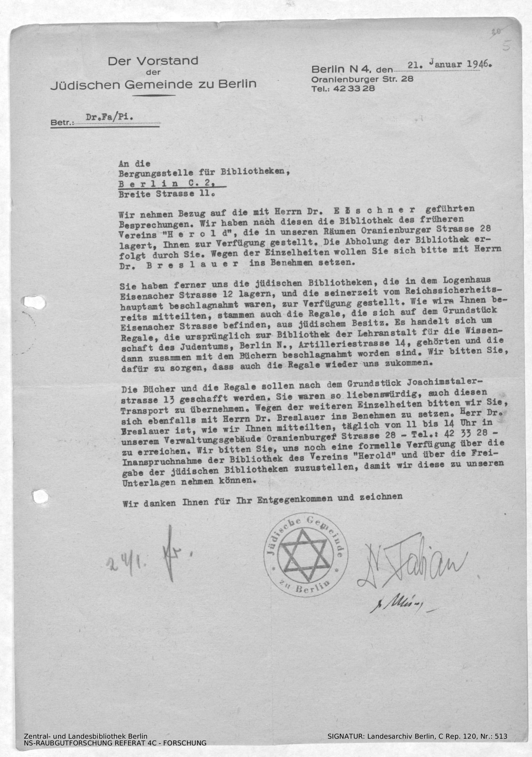 Brief der Jüdischen Gemeinde zu Berlin zur Organisation von Transporten jüdischer Bibliotheken