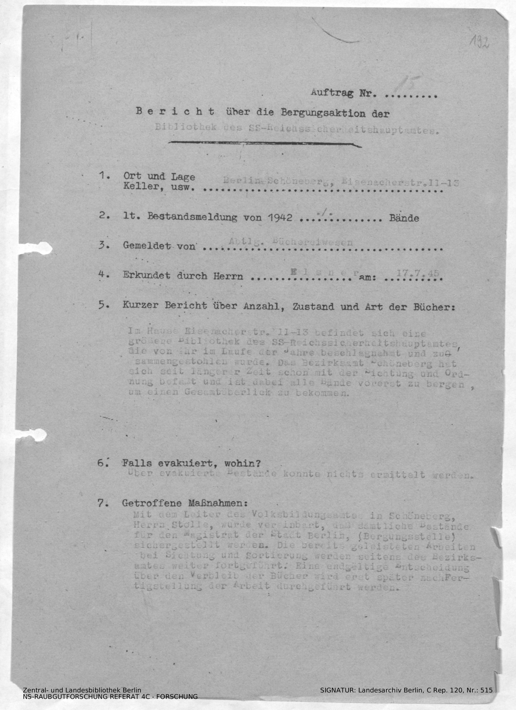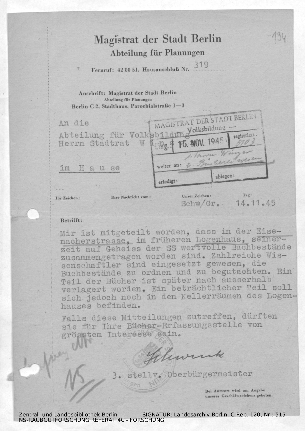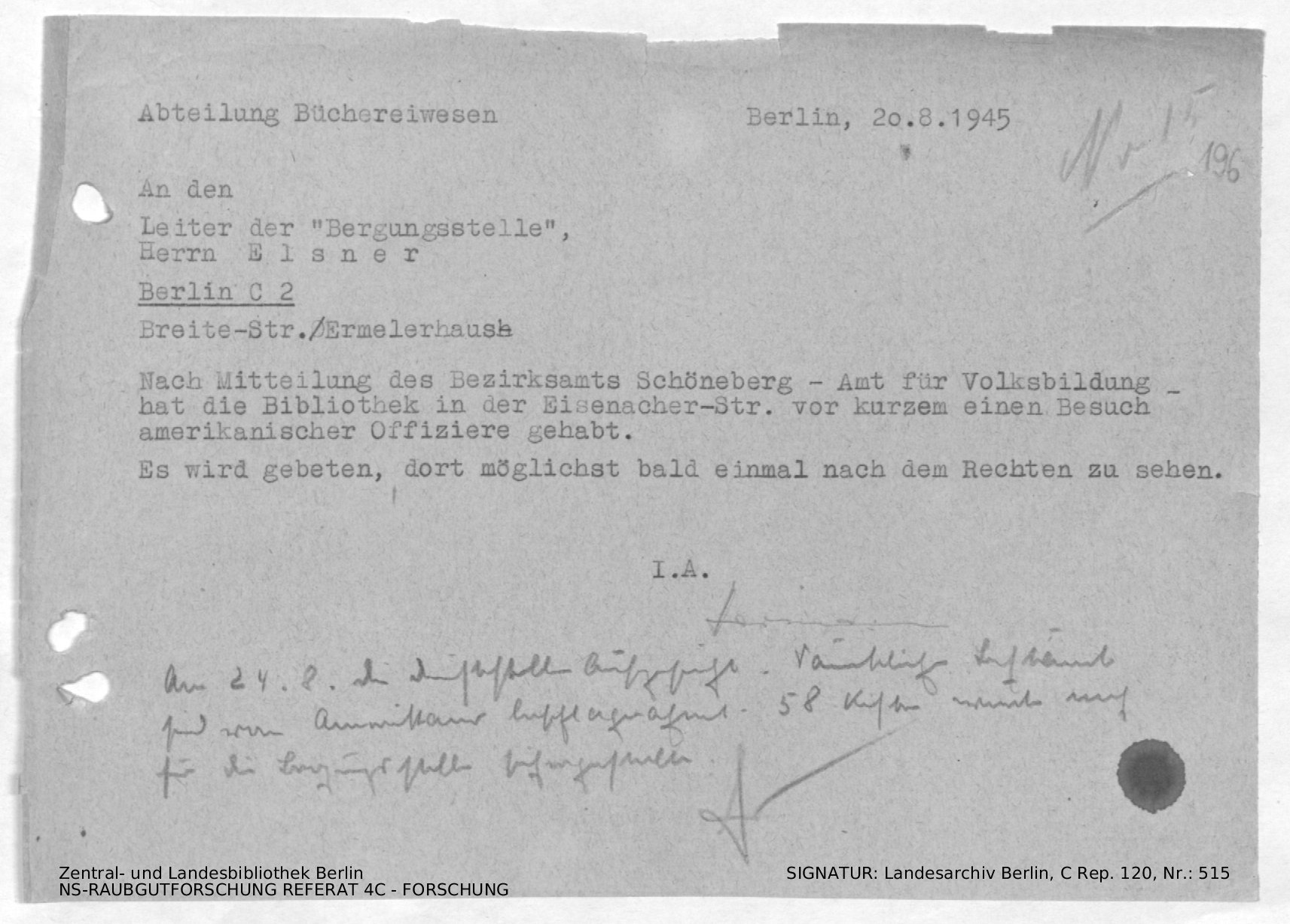 teilw. Sollten über die Bergungsstelle zurück an die Beraubten (jüdische Gemeinde, Loge, Bischof), Volksbüchereien