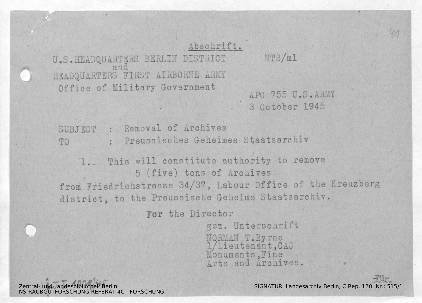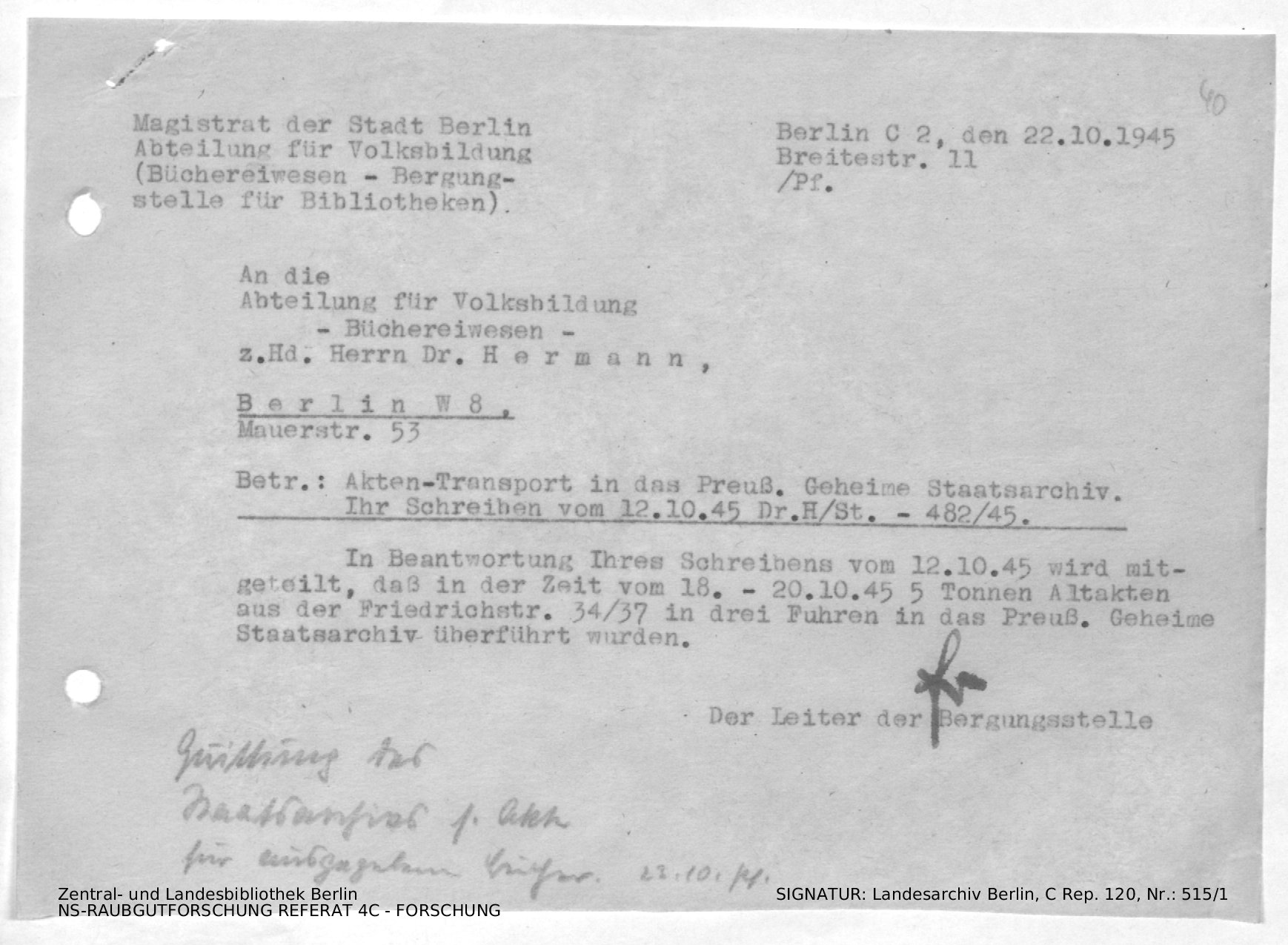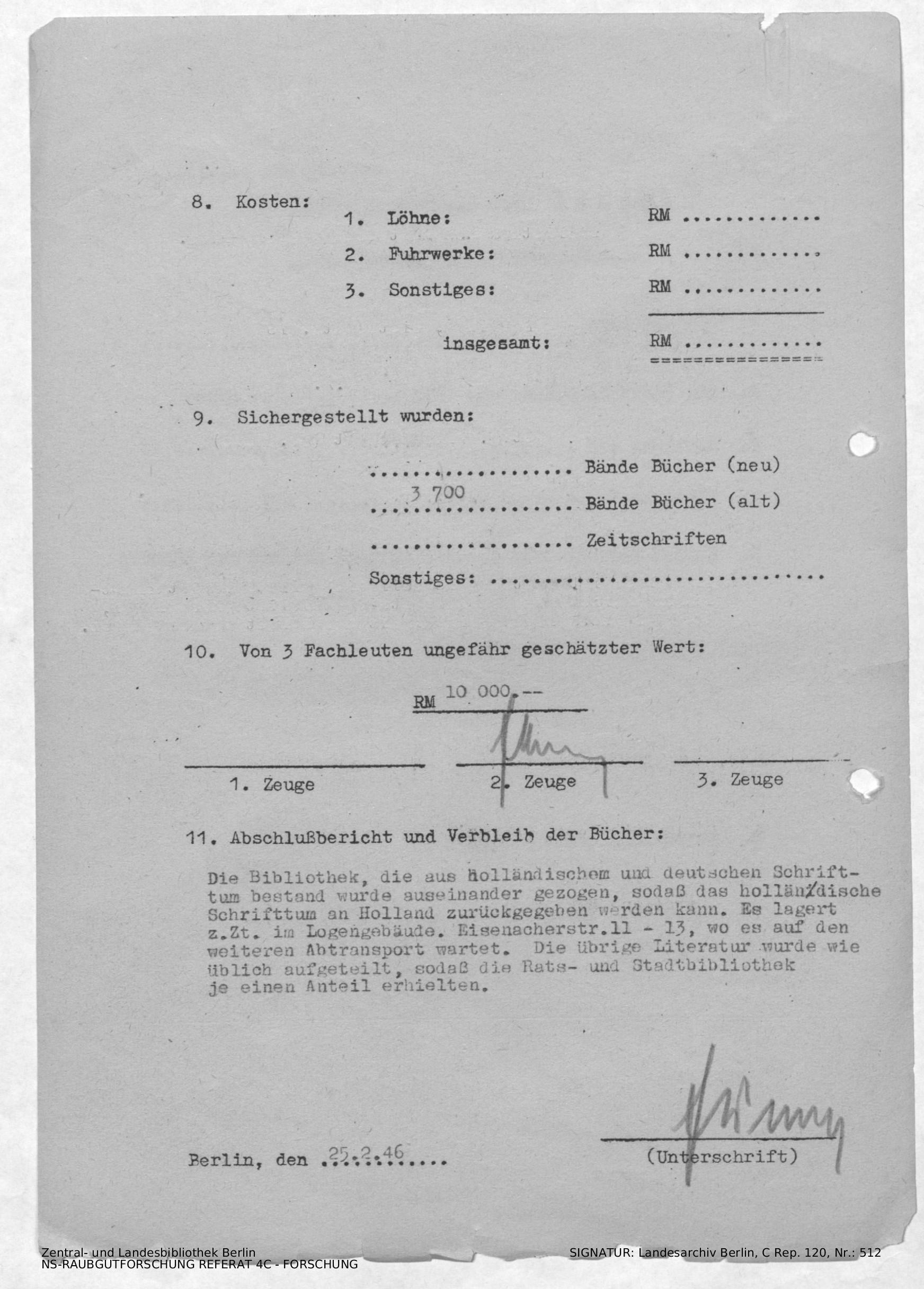 "Bibliothek wurde auseinander gezogen, sodaß das holländische Schrifttum an Holland zurückgegeben werden kann"
