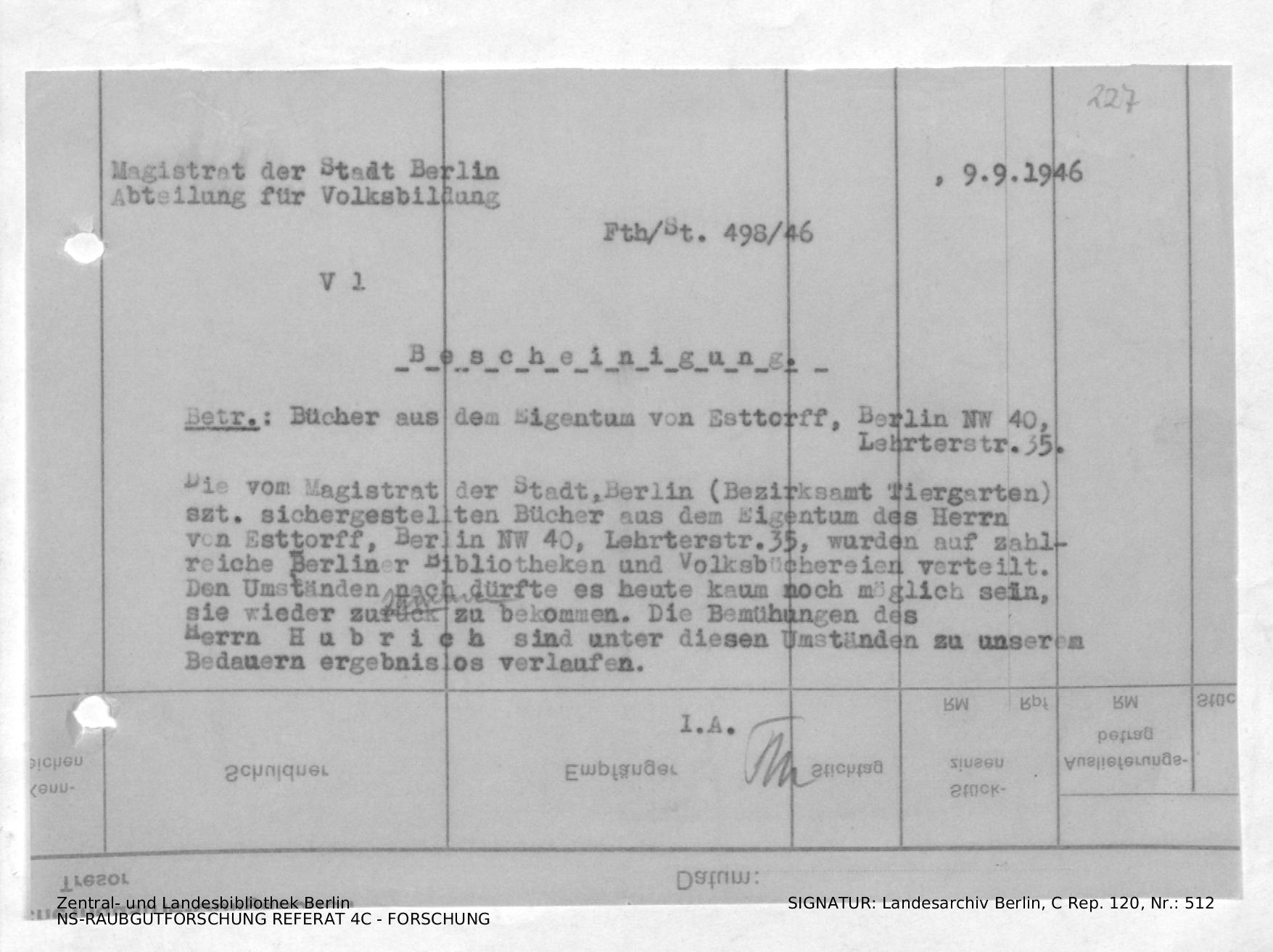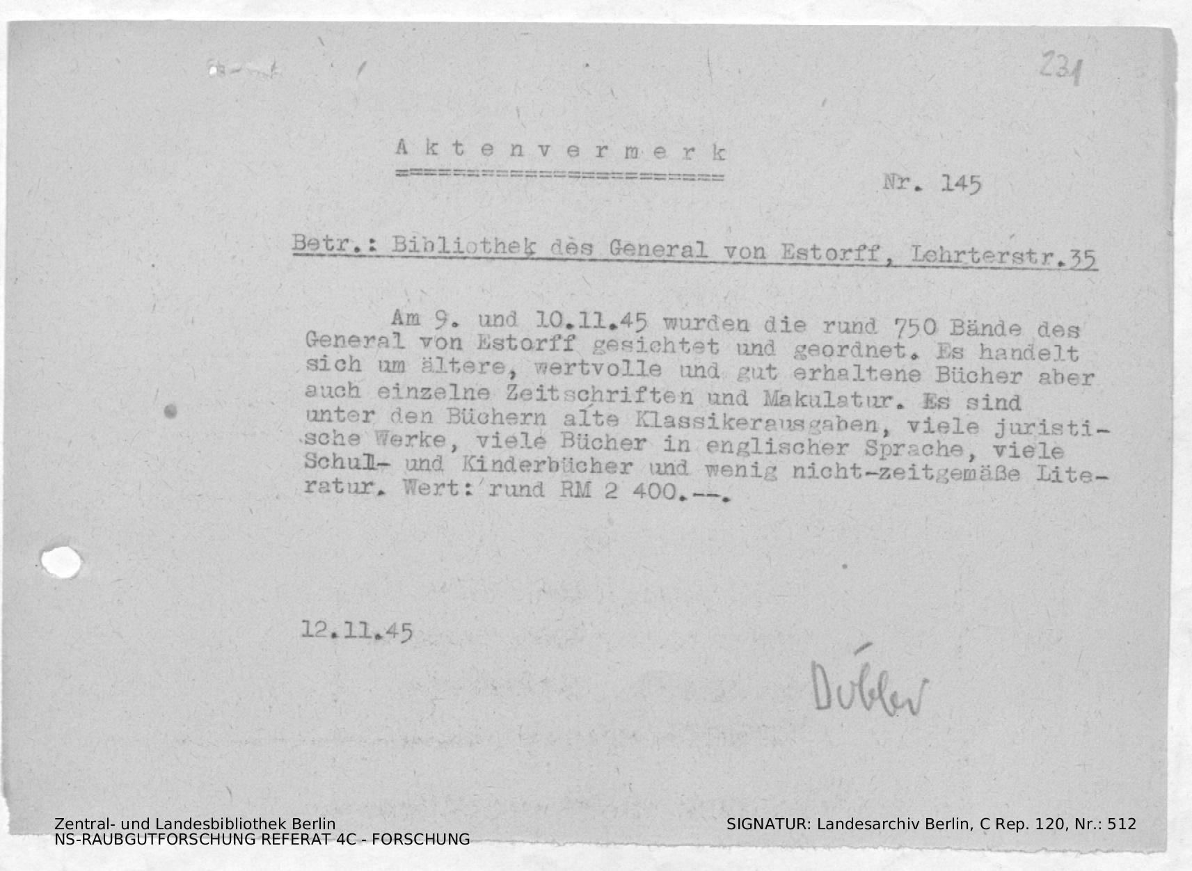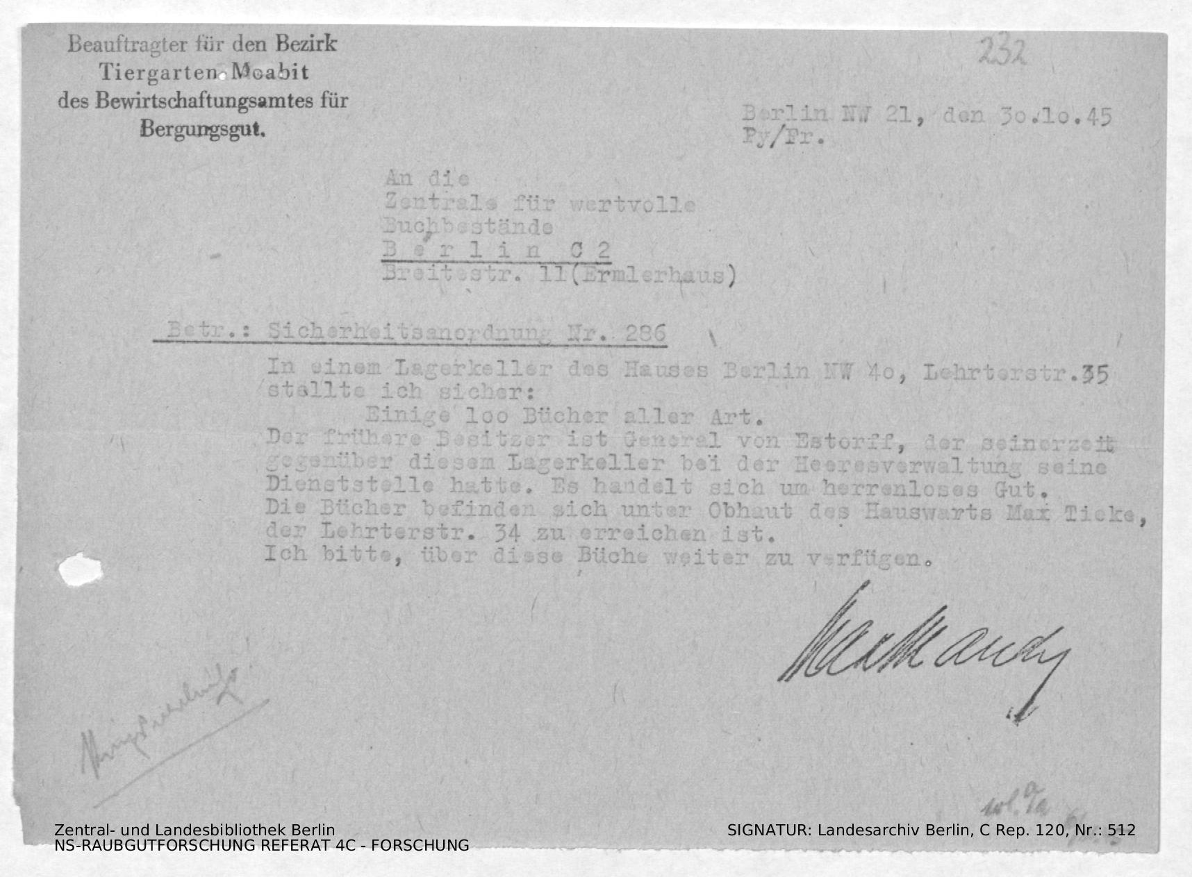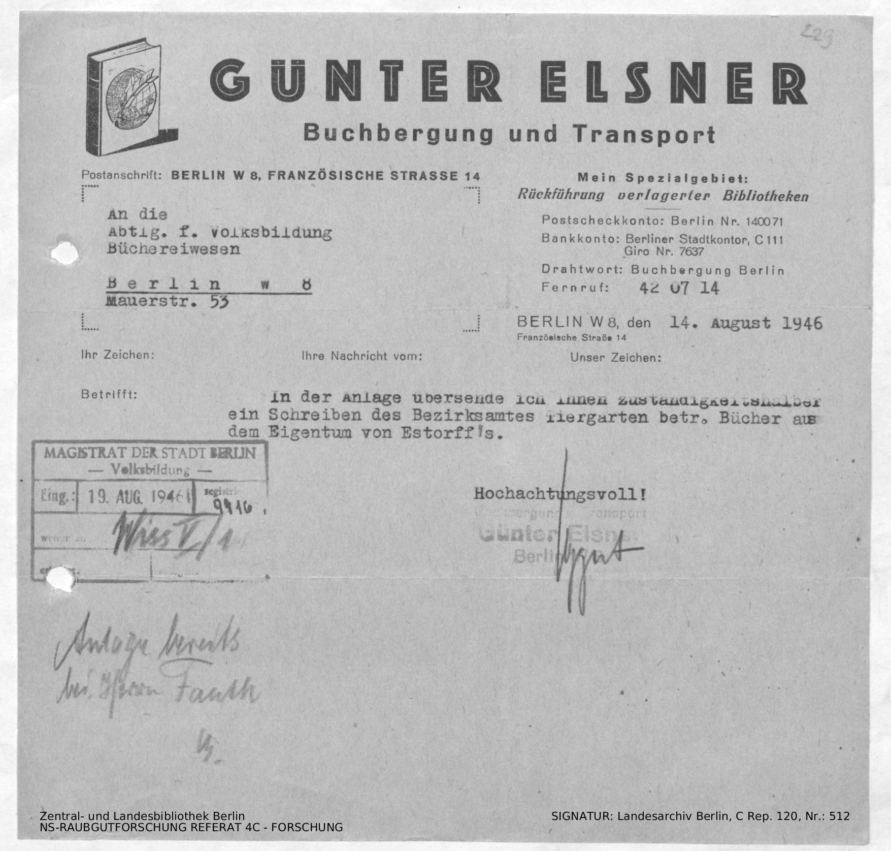 Anschreiben von Elsner mit Anlage: Brief zur Freigabe der Bücher von General von Estorff