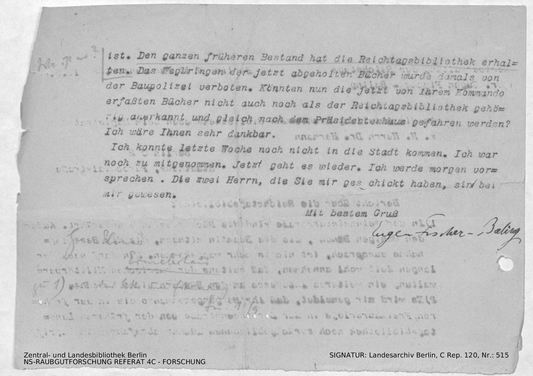 Schriftwechsel und Berichte zur Bibliothek des Reichstages