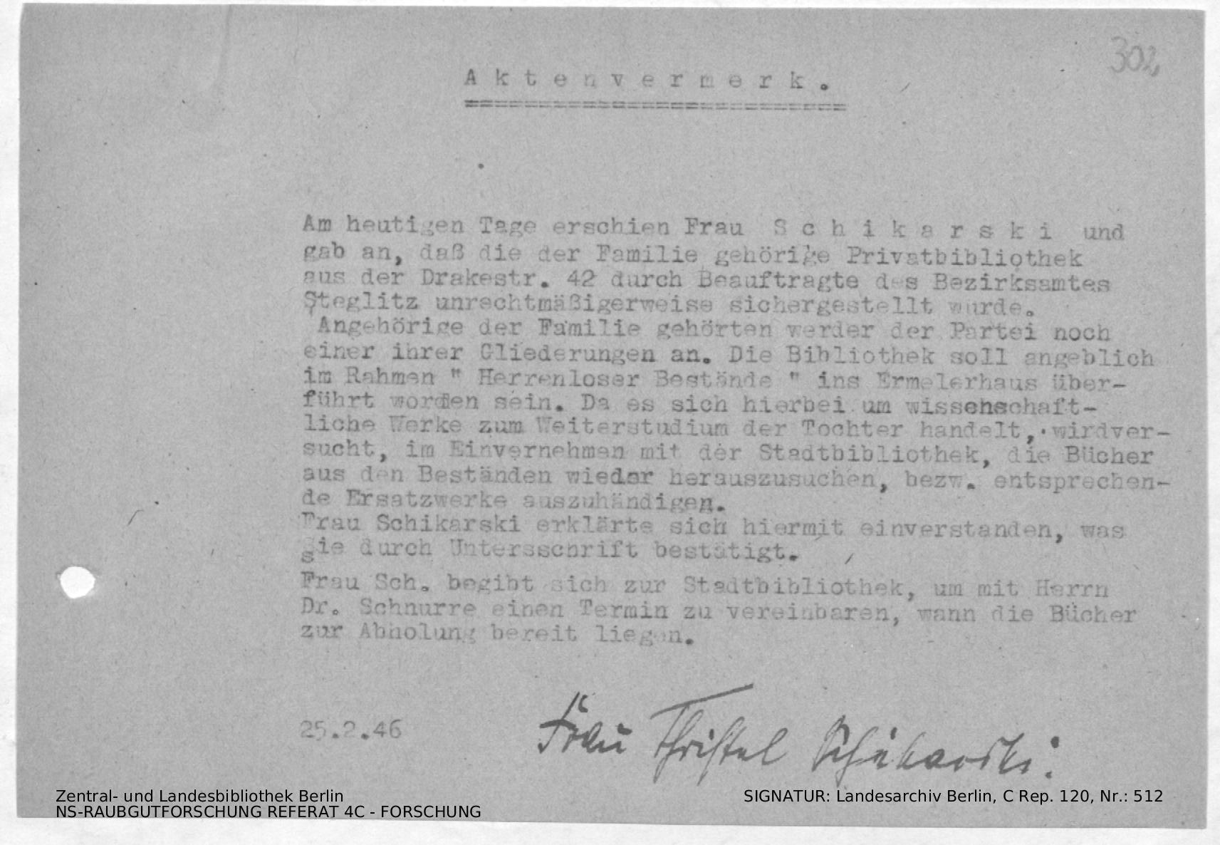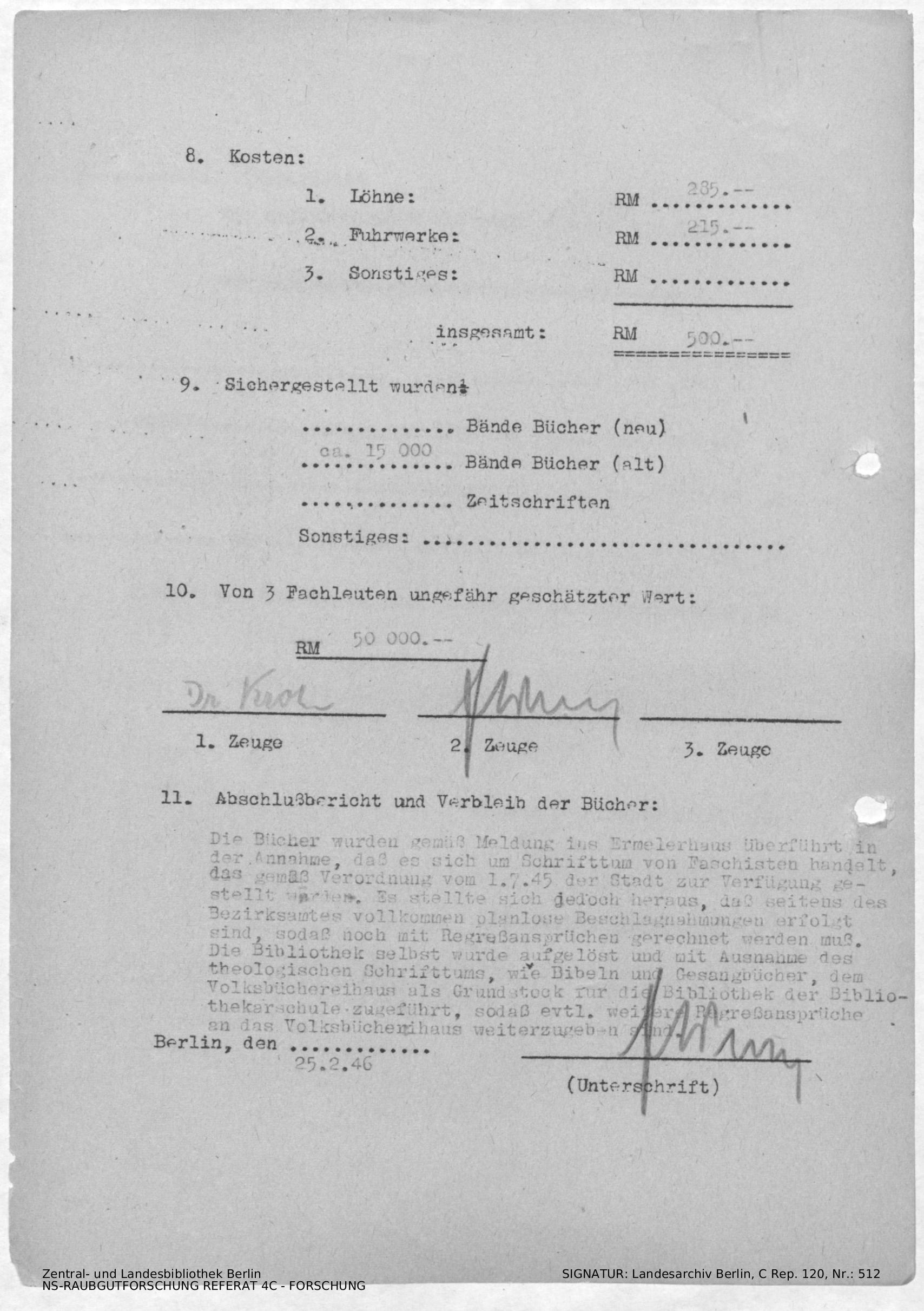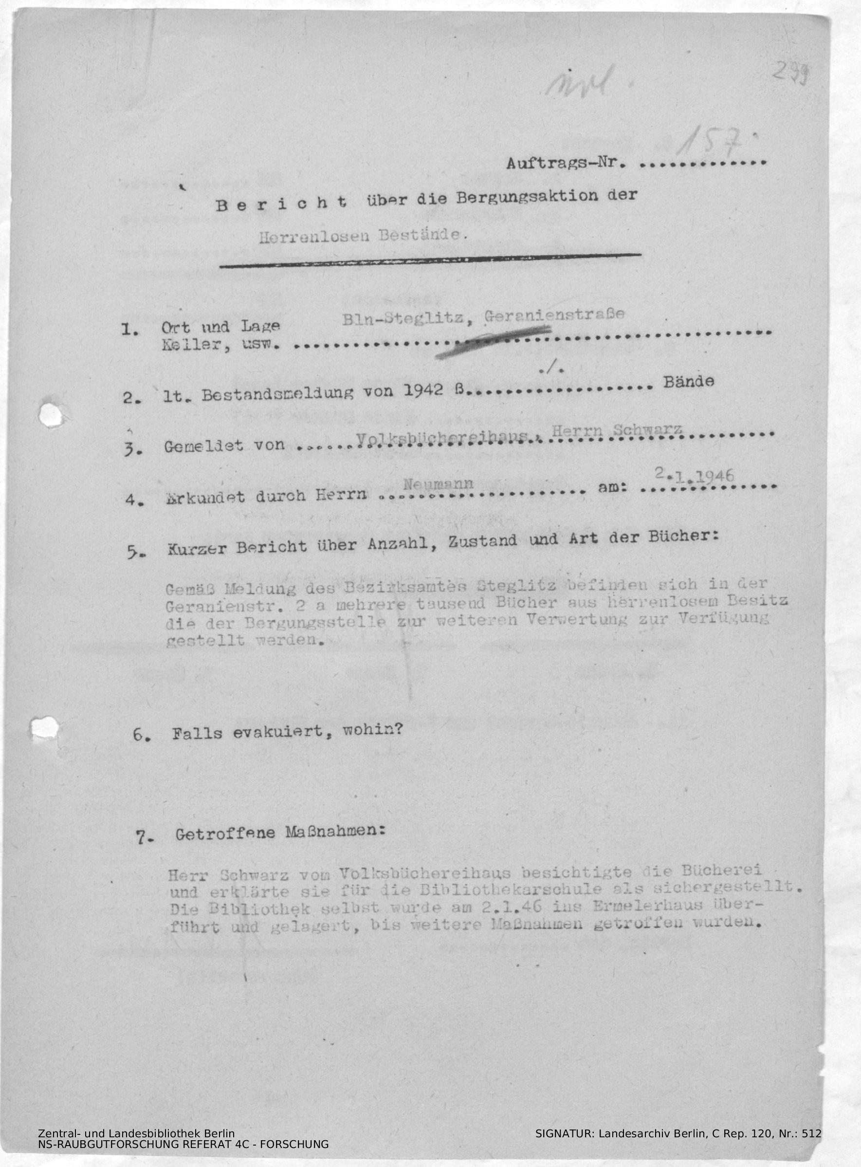 Bericht über die Bergungsaktion der herrenlosen Bestände (Steglitz, Geranienstr.)