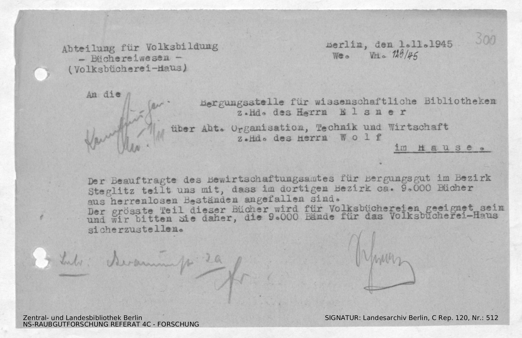 Anforderung 9.000 Bücher aus Steglitz für Volksbücherei-Haus sicherzustellen