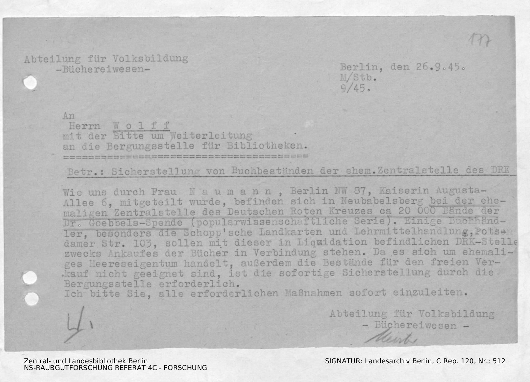 Meldung der Bücherei der ehemaligen Zentralstelle des Deutschen Roten Kreuzes