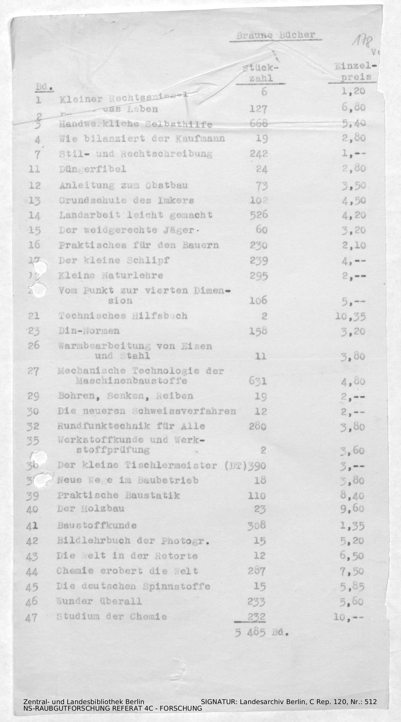 Aufstellung von Bänden inkl. Einzelpreis und Anzahl