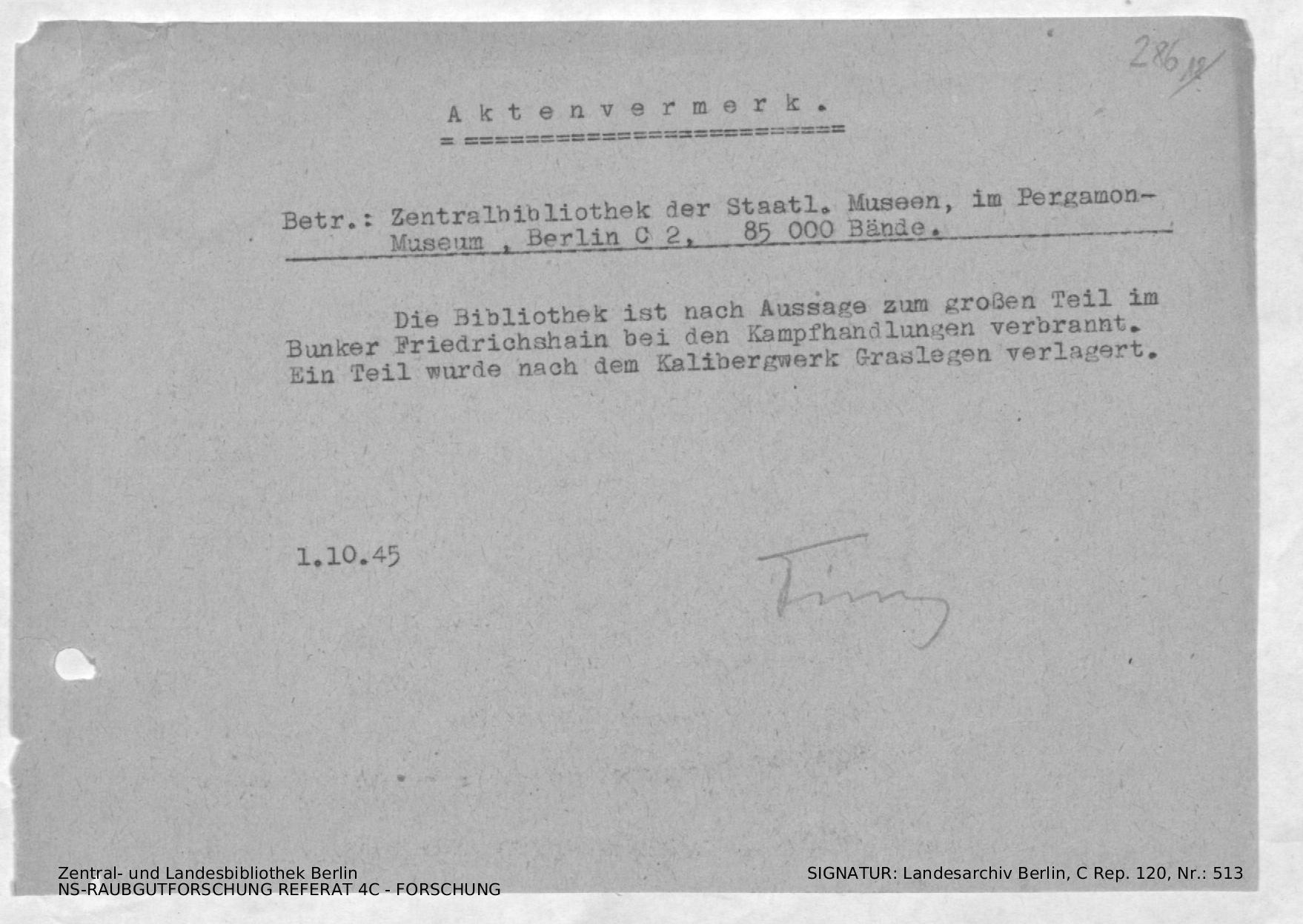 teilweise im Bunker Friedrichshain verbrannt, teilweise verlagert