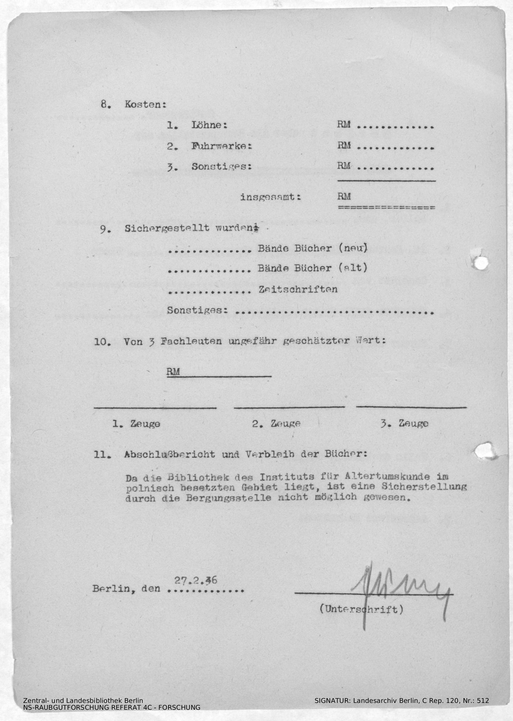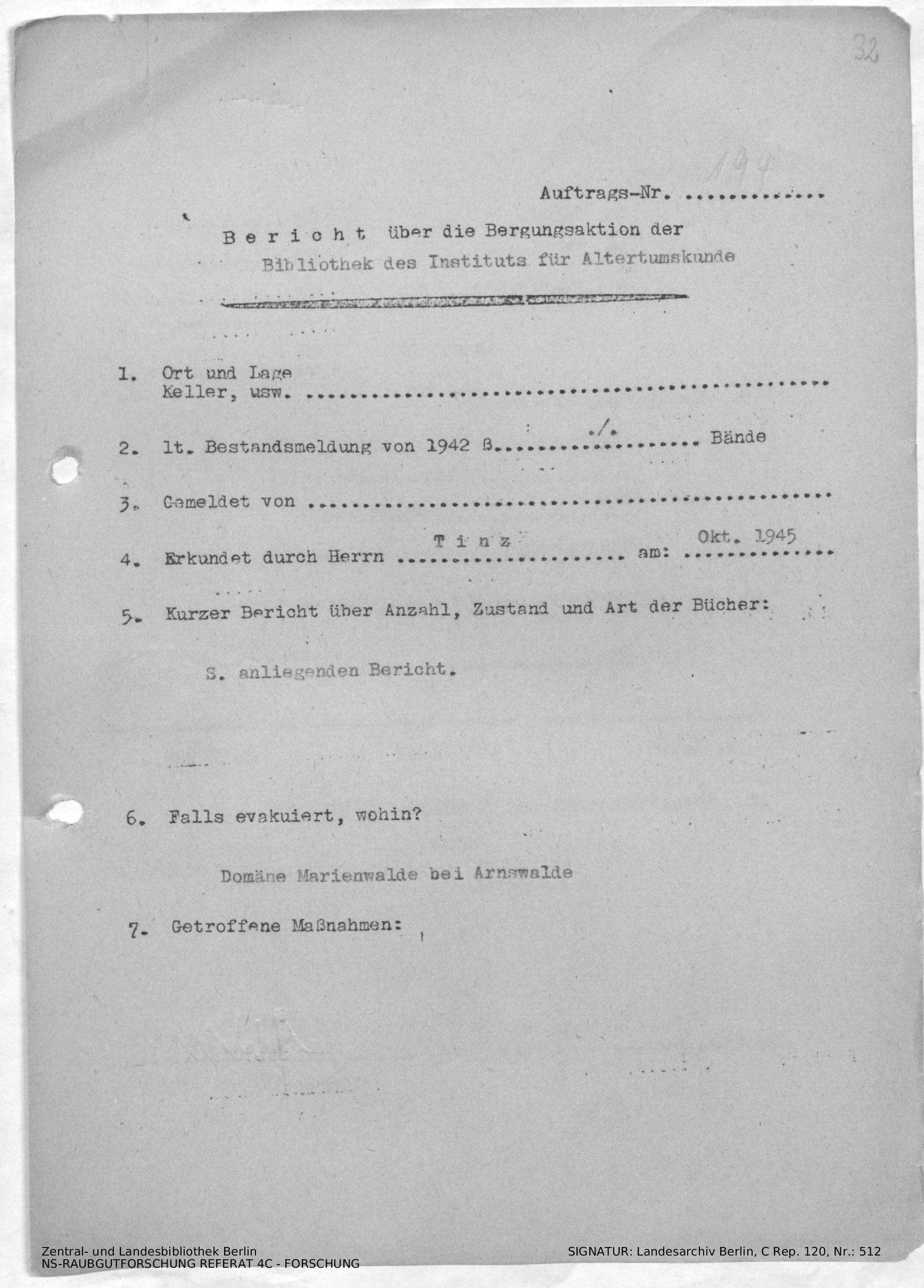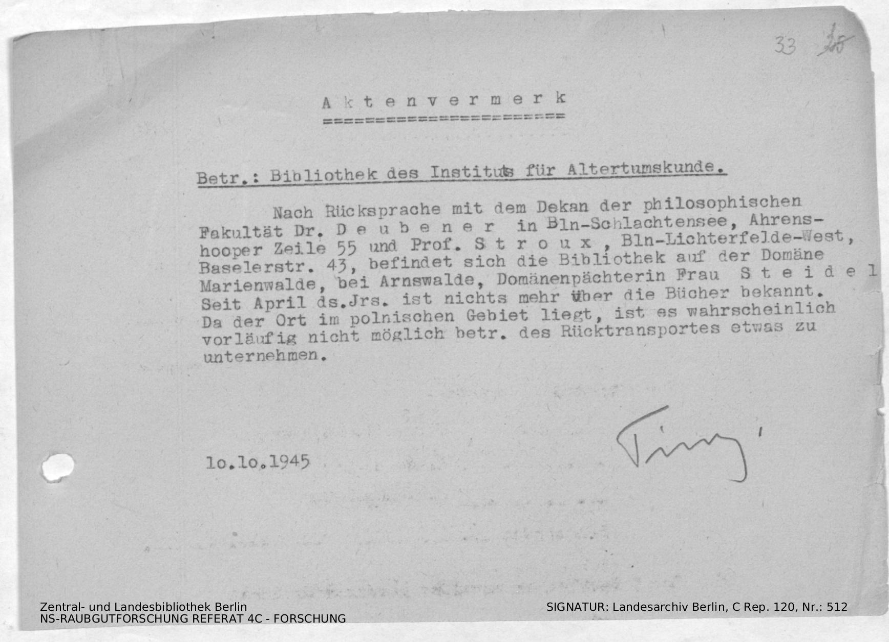 Aufforderung zur Sicherstellung der Bibliothek des Instituts für Altertumskunde