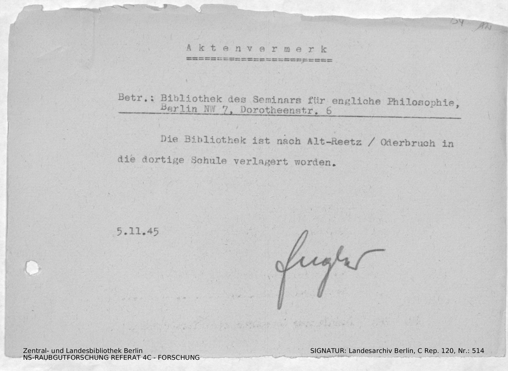 Berlin NW 7, Dorotheenstr. 6 / evakuiert nach Alt Reetz/Oderbruch (Schule)