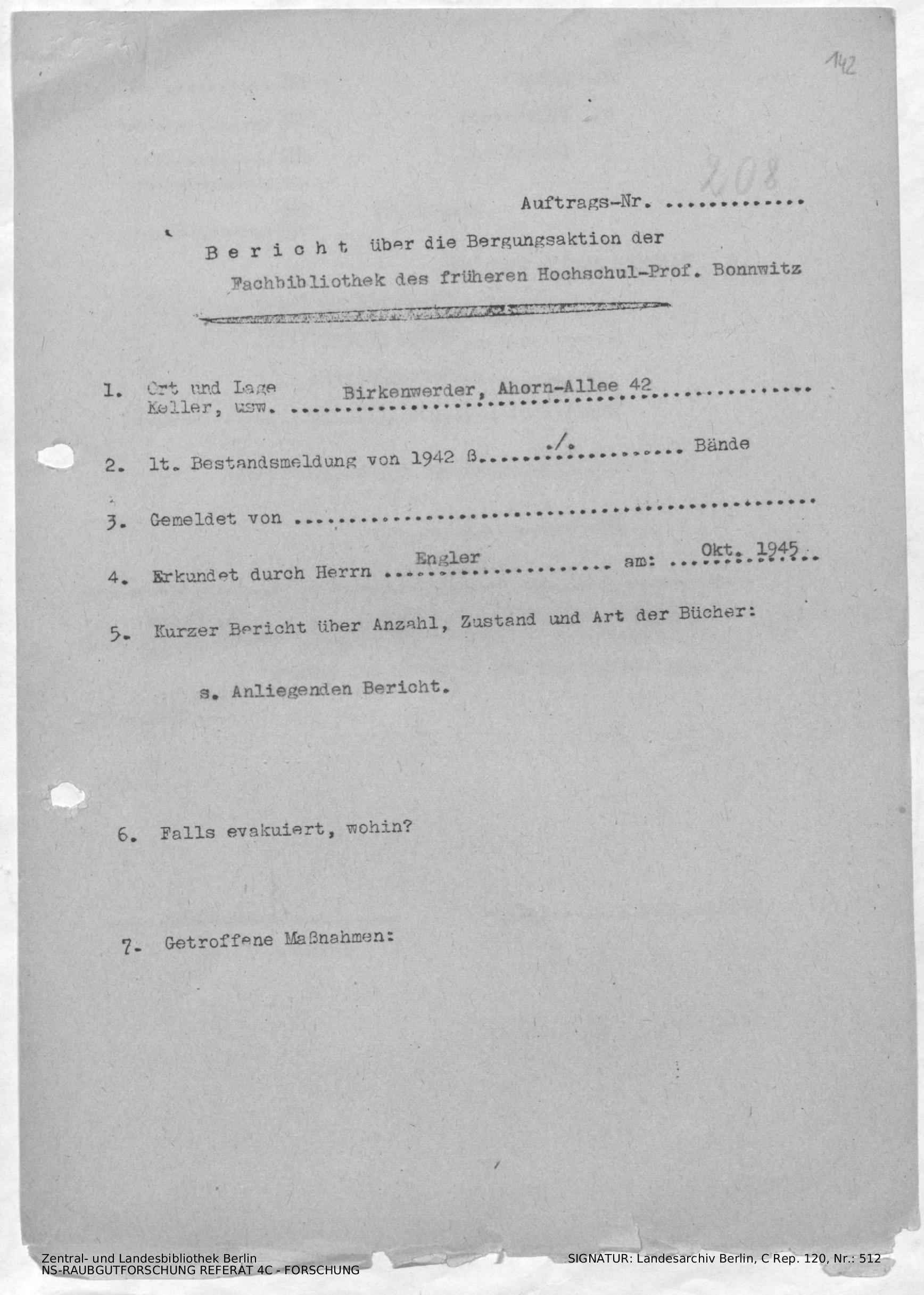 Bericht über die Bergungsaktion der Fachbibliothek des früheren Hochschul-Professors Bonnwitz
