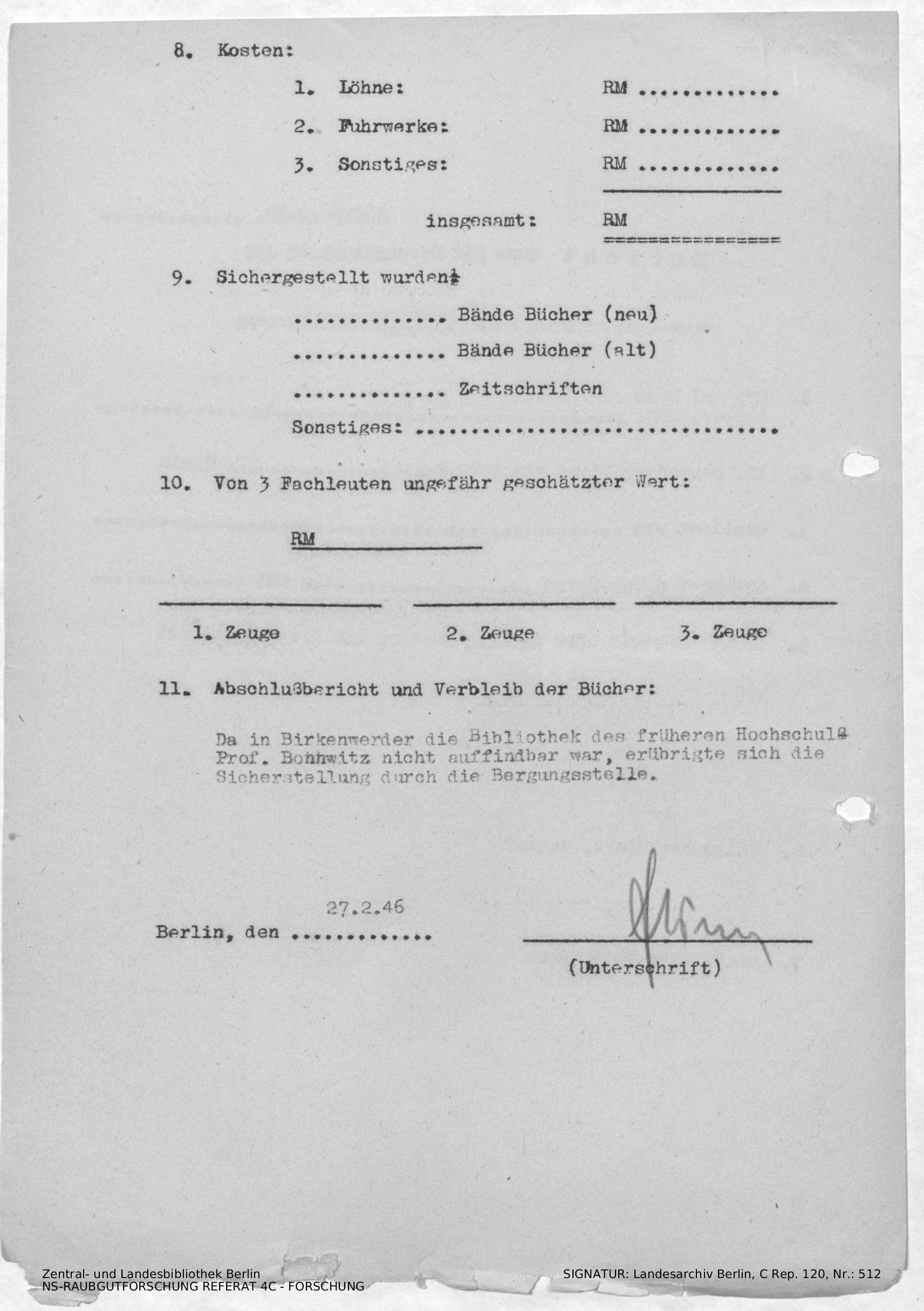 AV: Bitte der TU Berlin um Fachliteratur aus Bibliothek von Prof. Bonnwitz