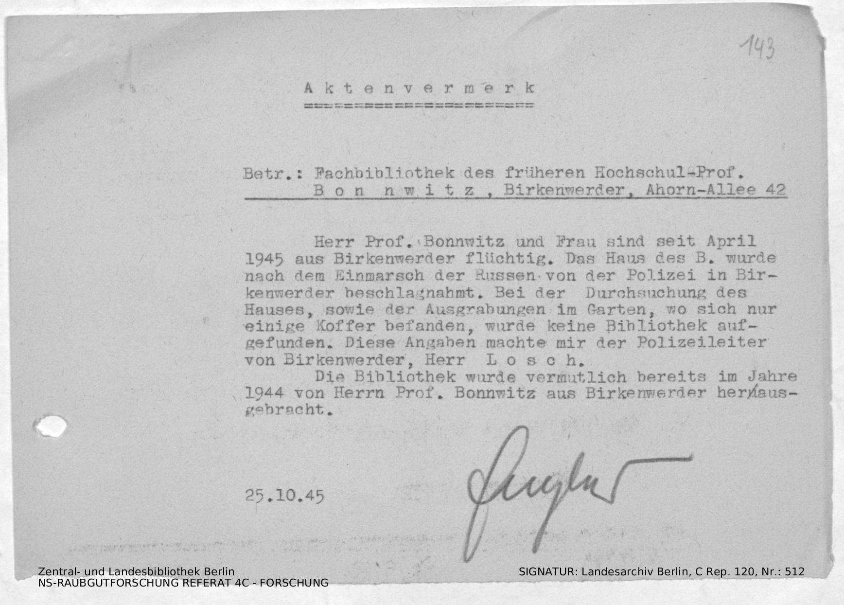 Hinweis zur Verbingung der Bibliothek bei der Flucht von Bonnwitz nach Angaben des Polizeileiters Losch.