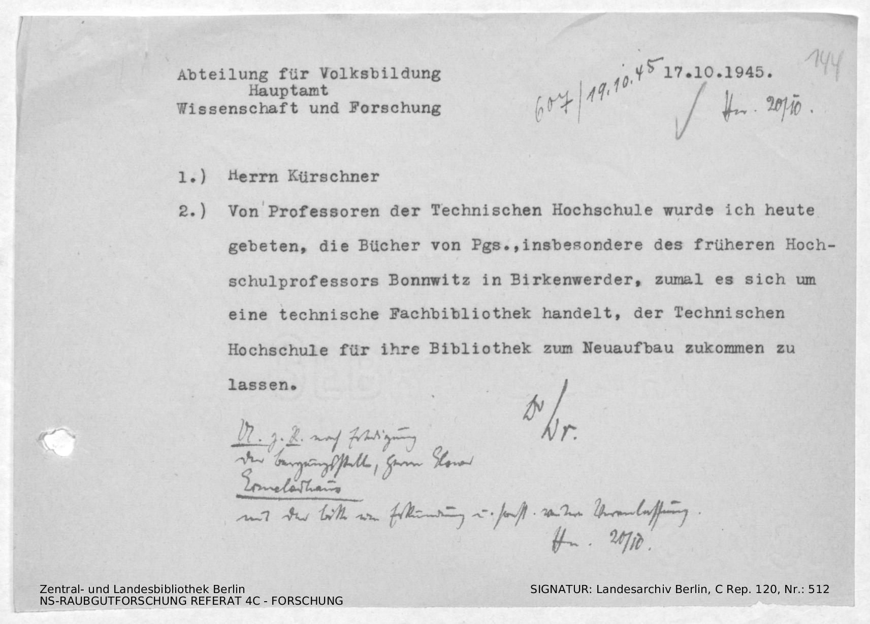 Bücher von Prof. Bonnwitz und anderen "Parteigenossen" für Technische Hochschule erbeten; handschriftliche Ergänzungen von Dr. Hermman vom 20.10.1945.