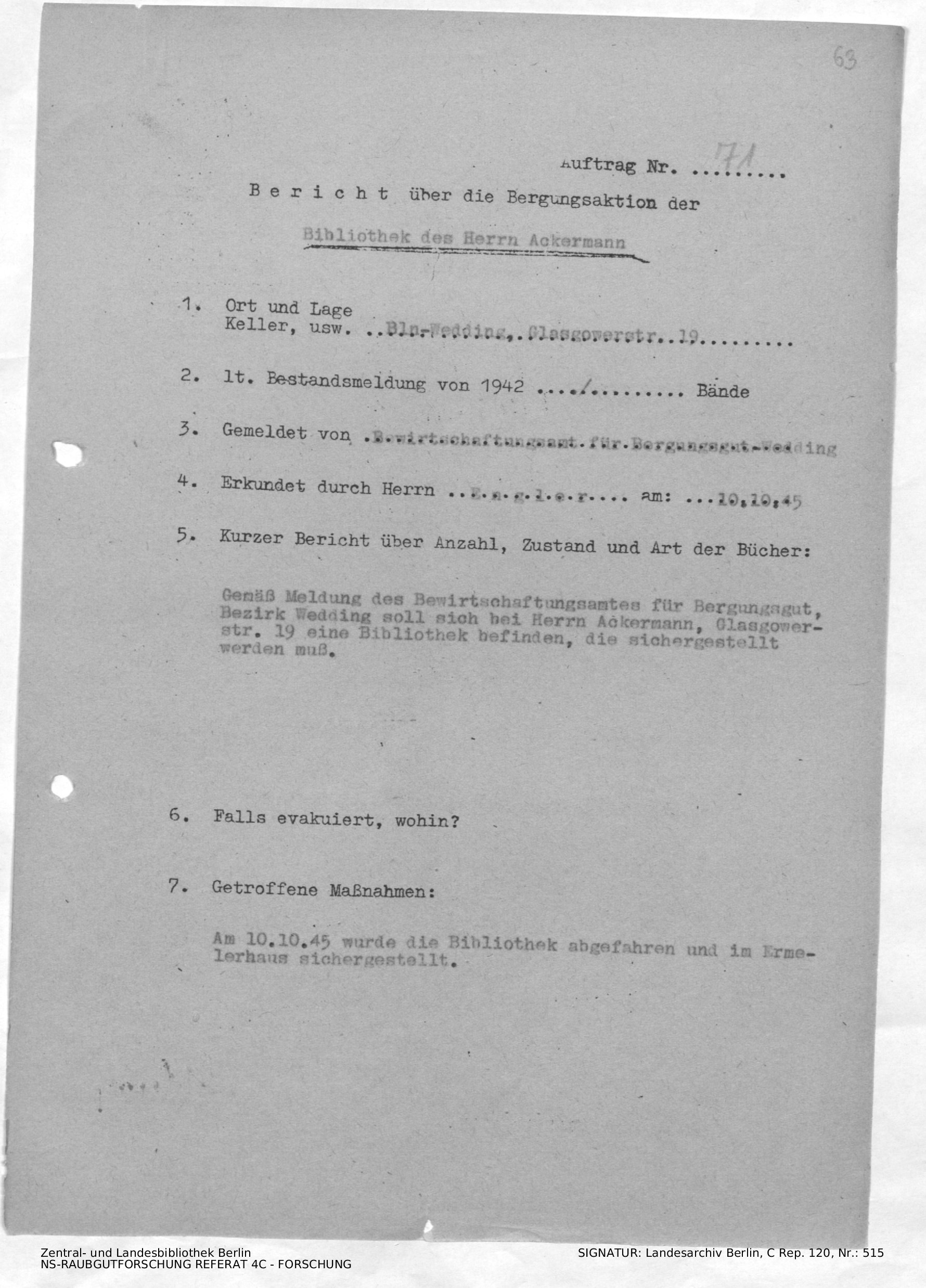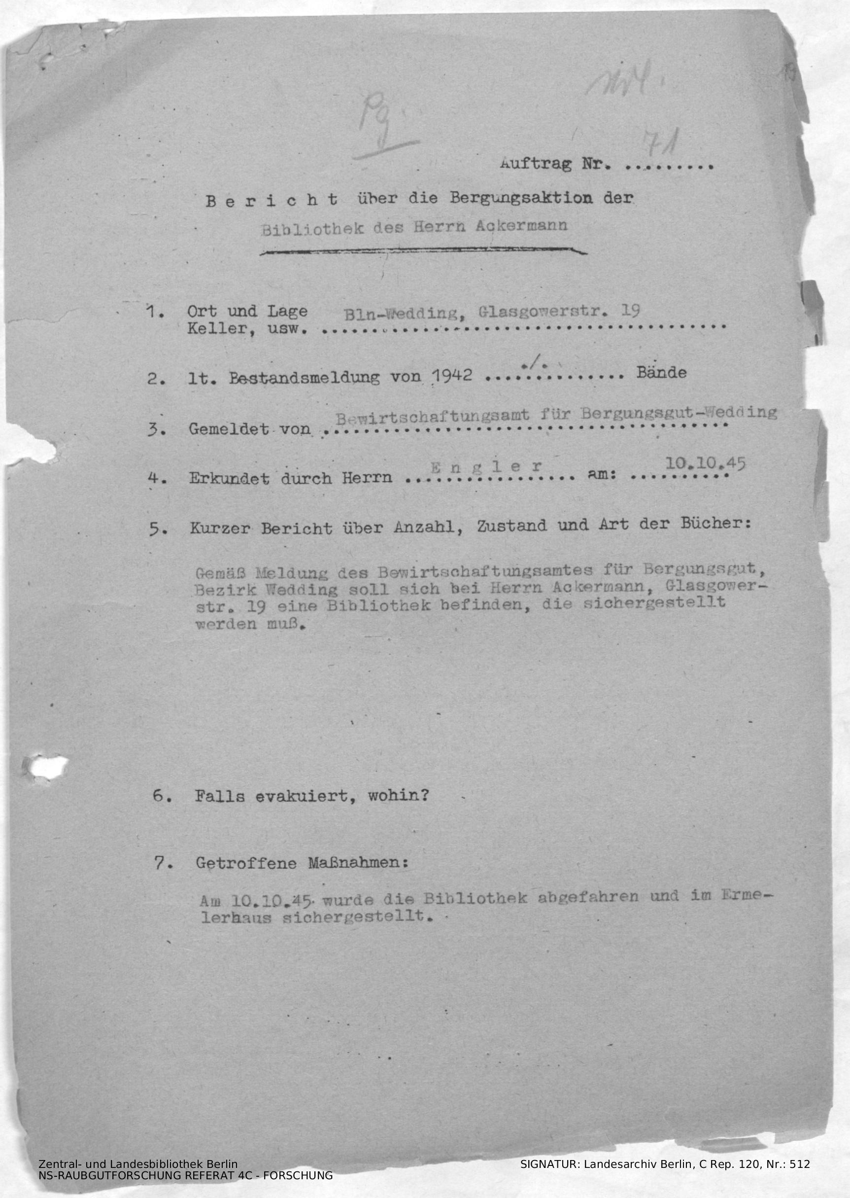 Hinweise zur Bibliothek mit 160 Büchern wurden vom Bewirtschaftungsamt für Bergungsgut-Wedding gemeldet. Die Bibliothek wurde aufgelöst.