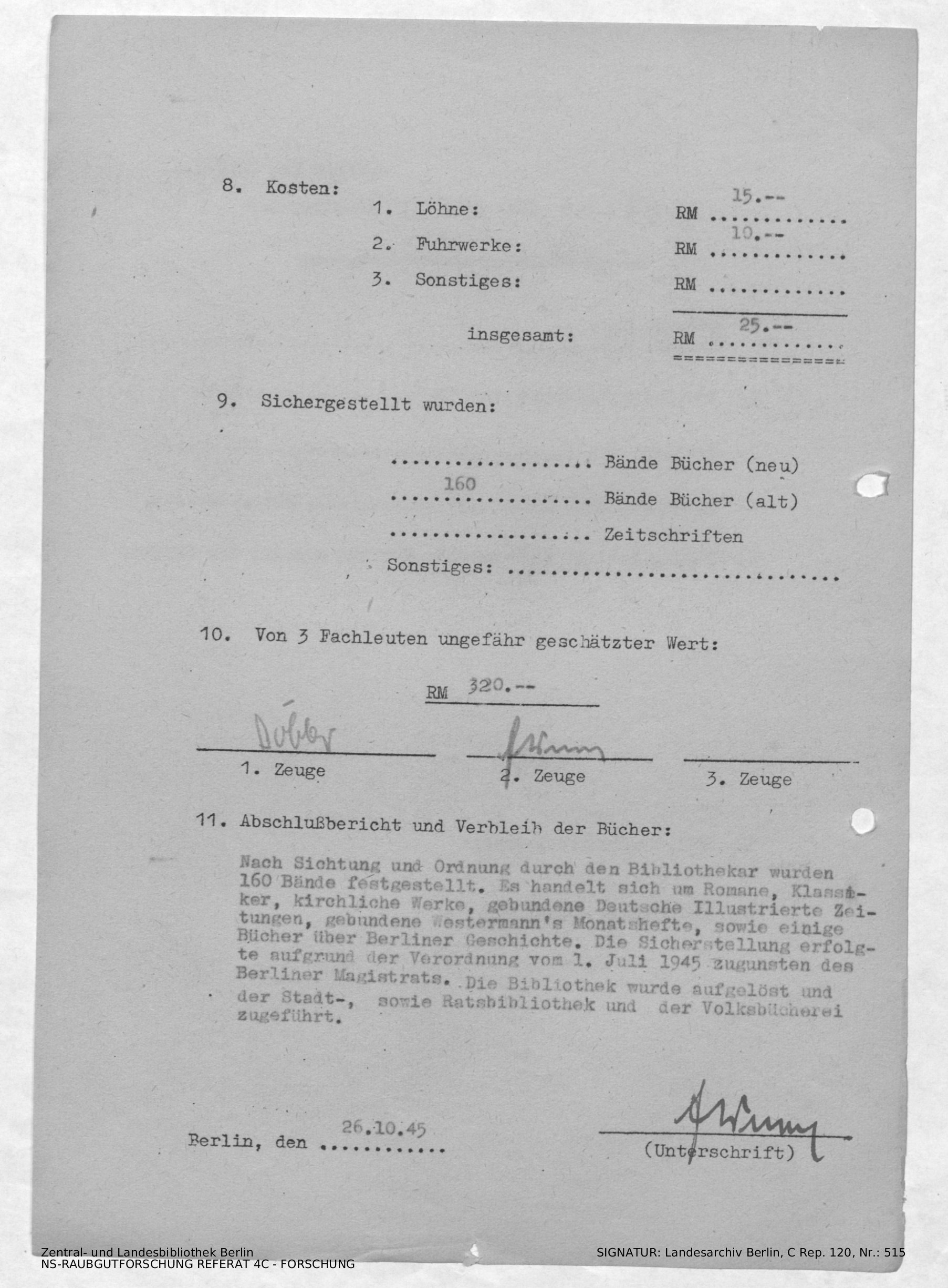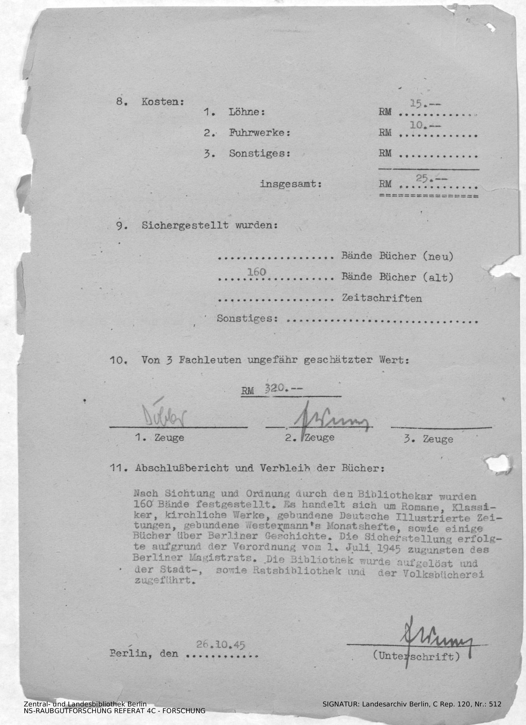 Bestandsbeschreibung und Bewertung von 320,-M.