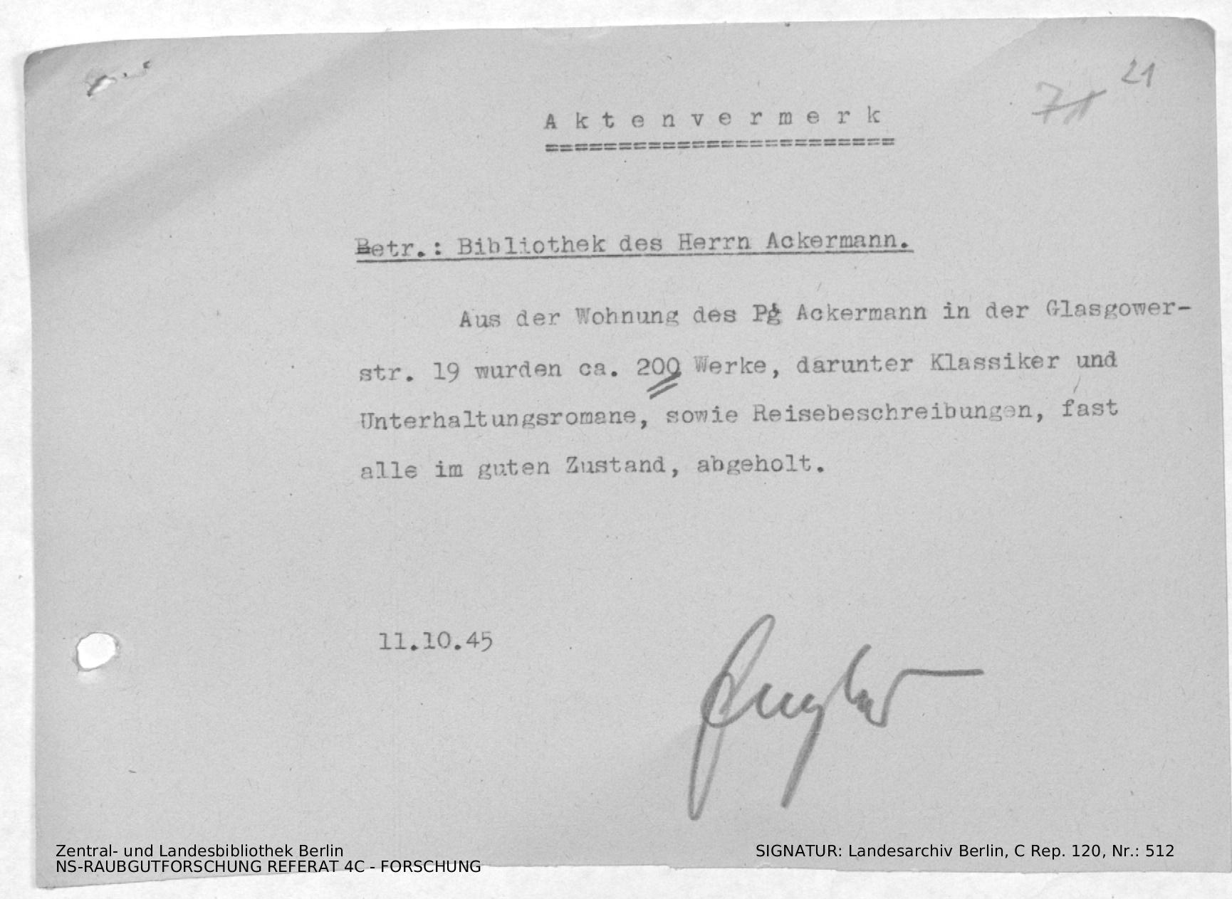 AV: Abholung der Bibliothek des Herrn Ackermann