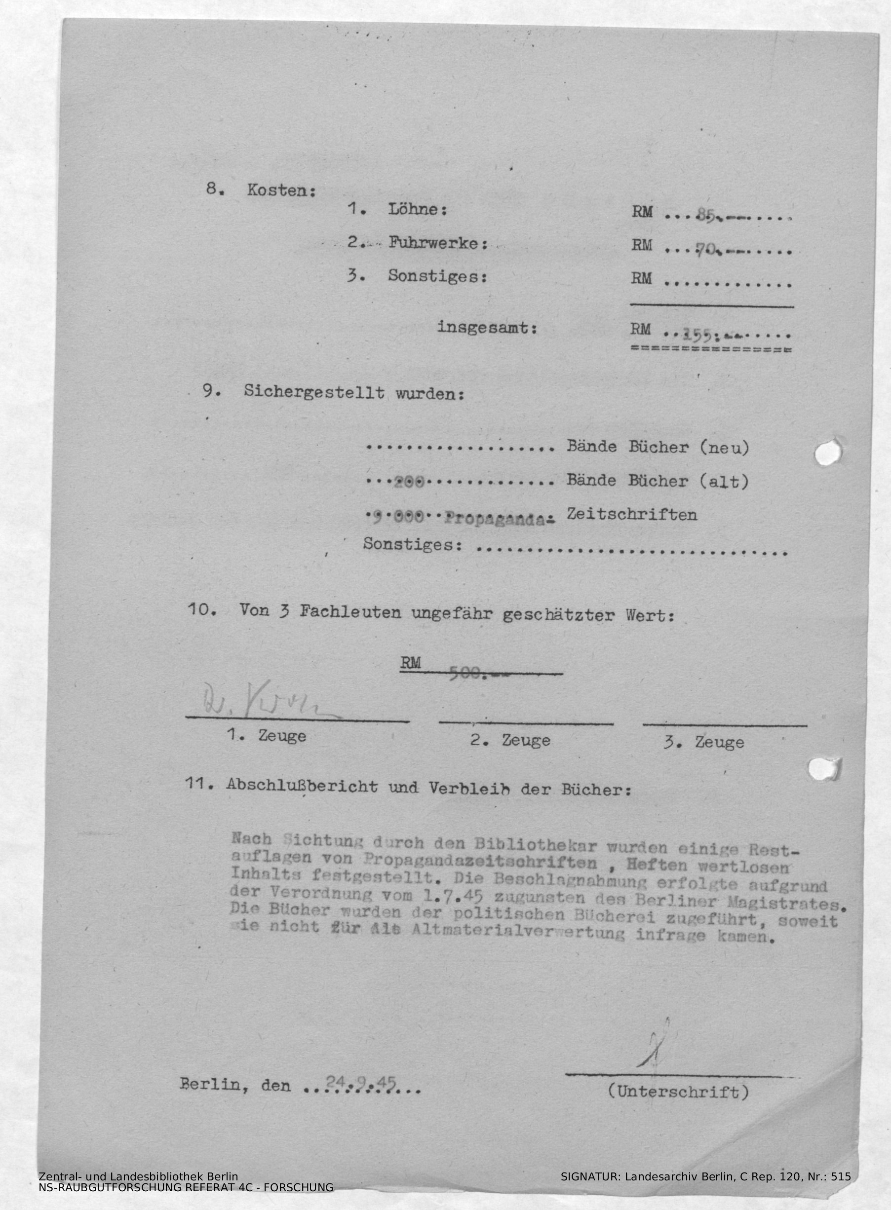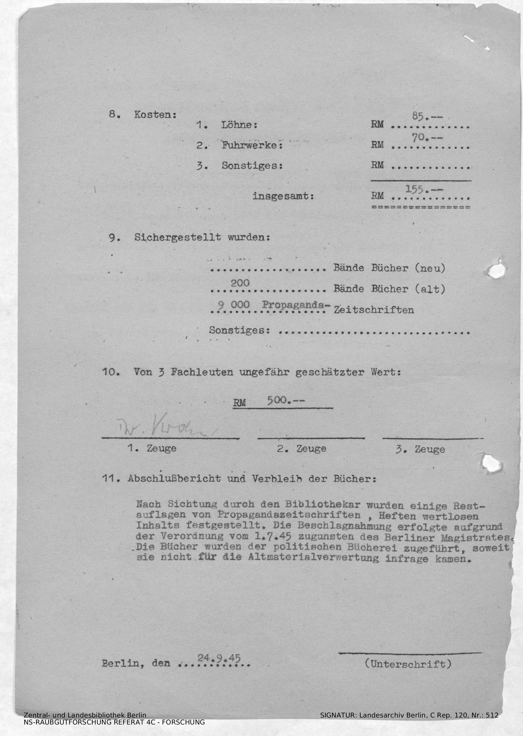 Hinweise zu Wert und Umfang der am 13. und 14.09.1945 sichergestellten Bestände