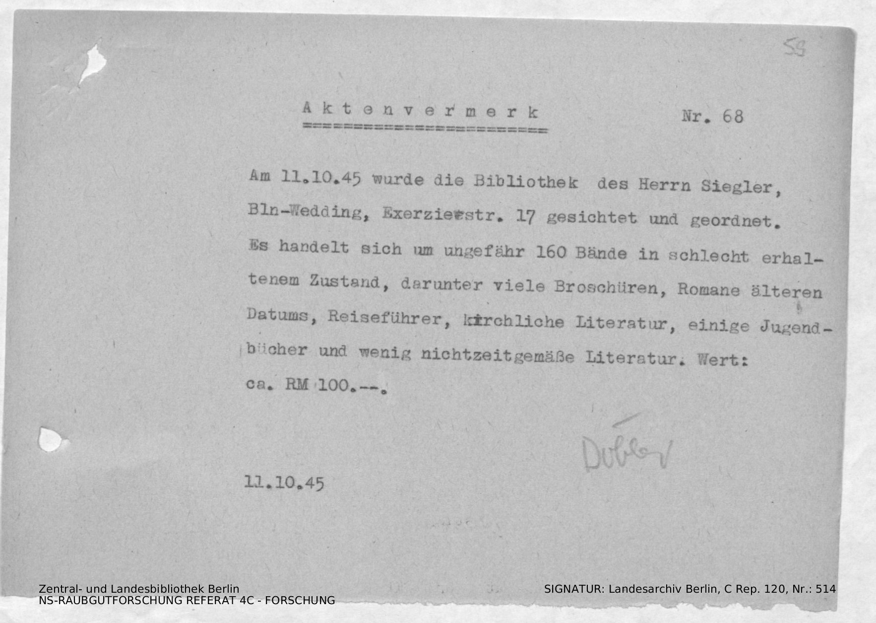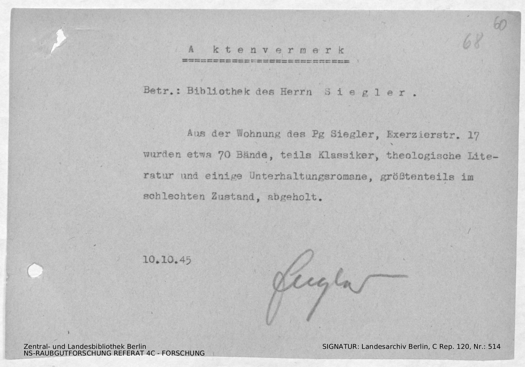AV: Bestandsbeschreibung und Bewertung der Bibliothek des Herrn Siegler