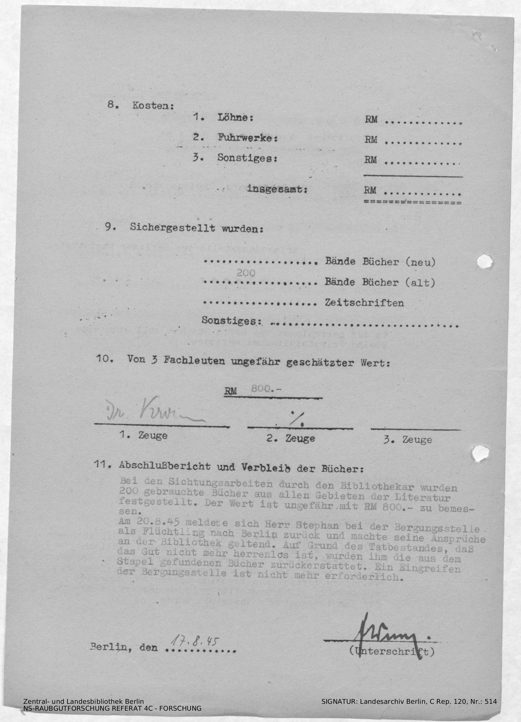 Bericht über die Bergungsaktion der Bibliothek August Stephan