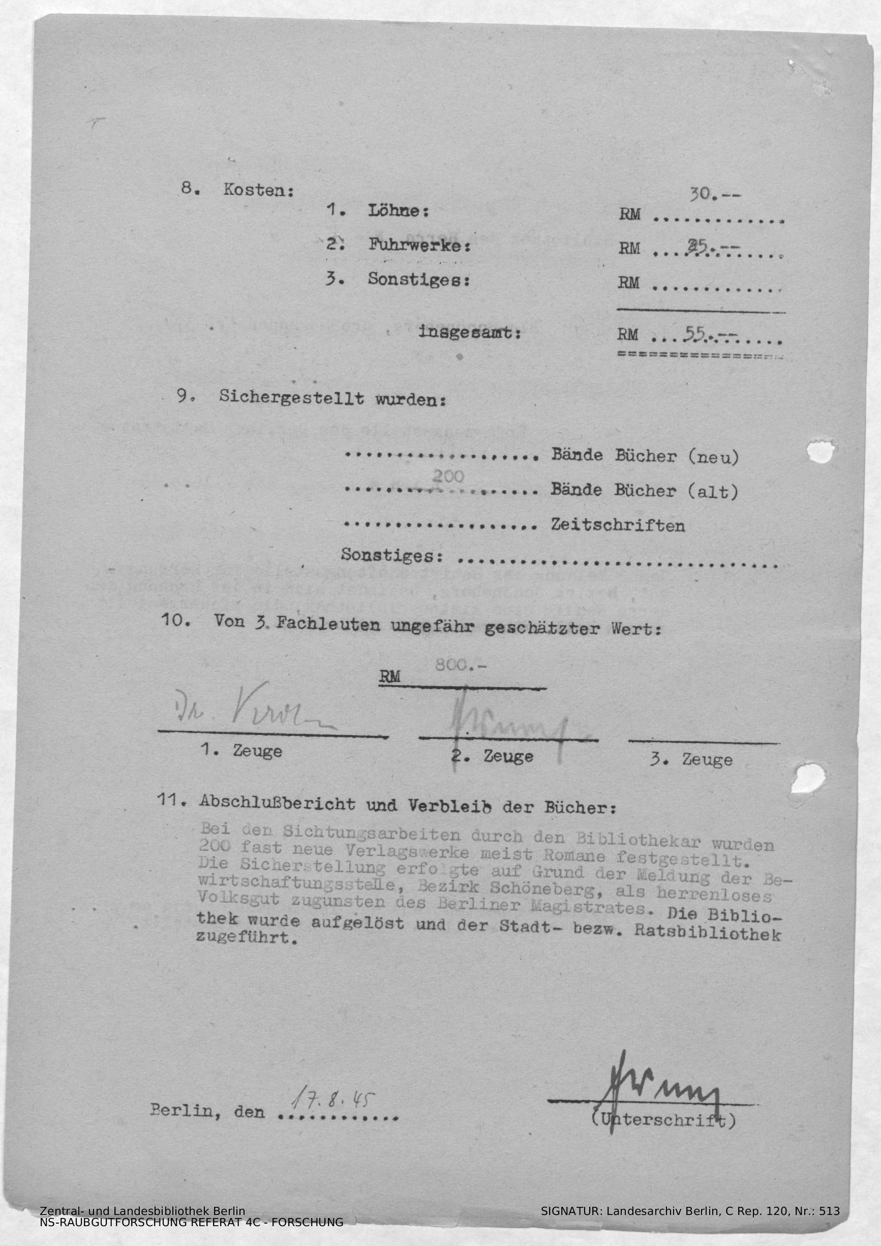 Bericht über die Bergungsaktion der Bibliothek des Herrn Nessig