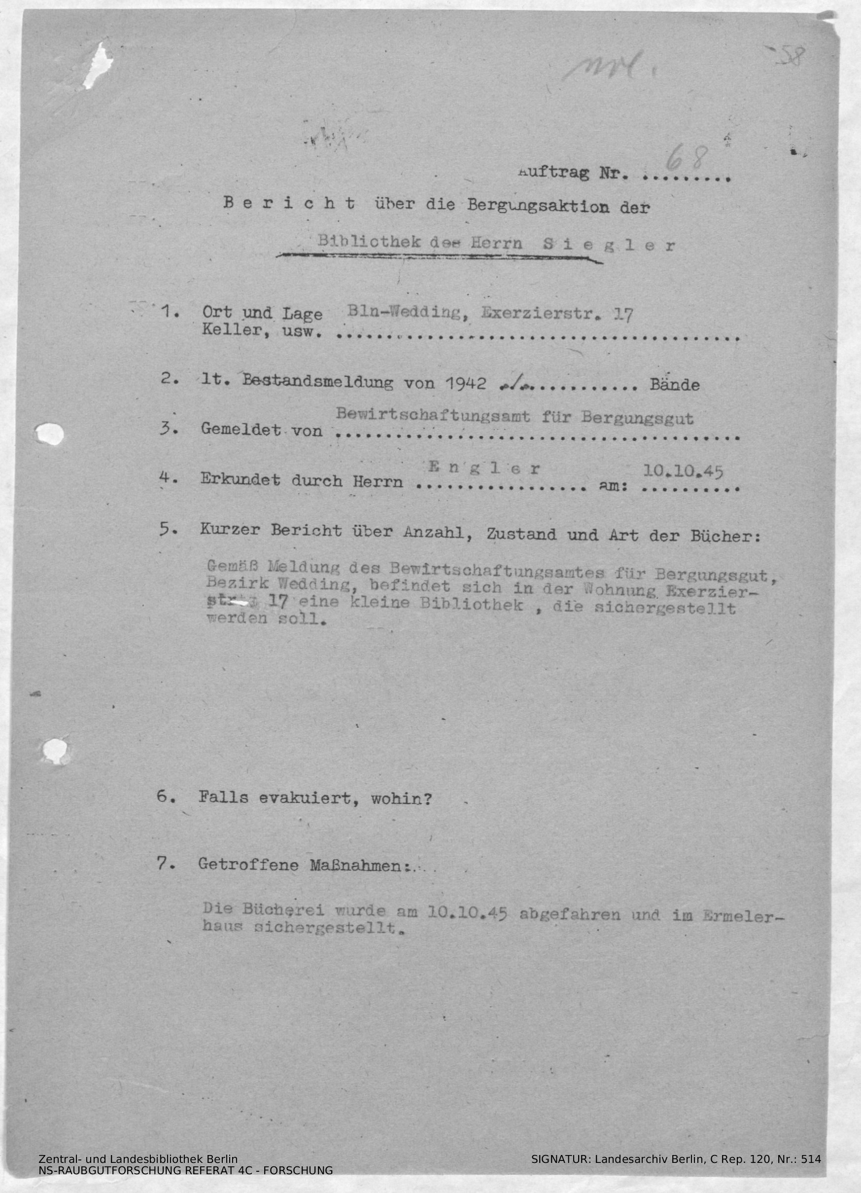 Bericht über die Bergungsaktion der Bibliothek des Herrn Siegler