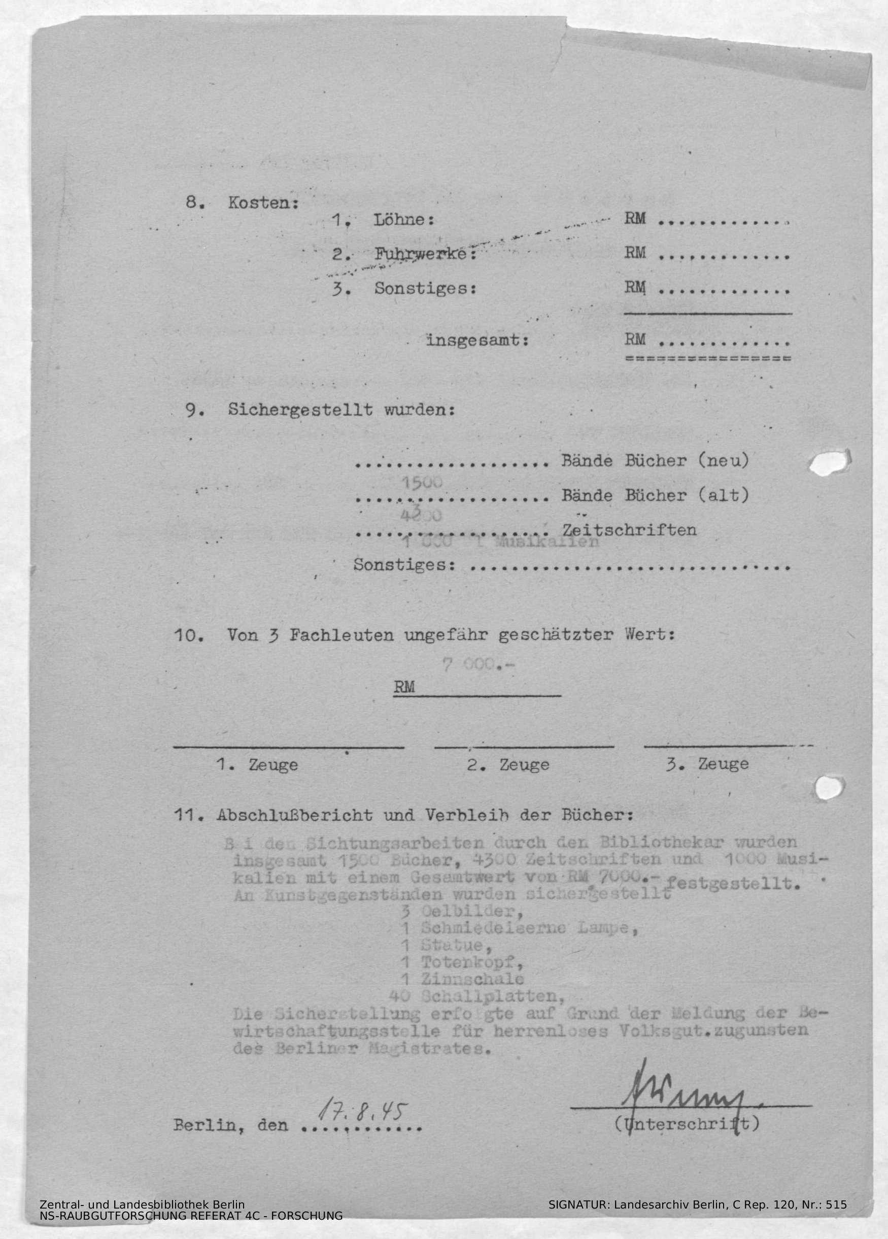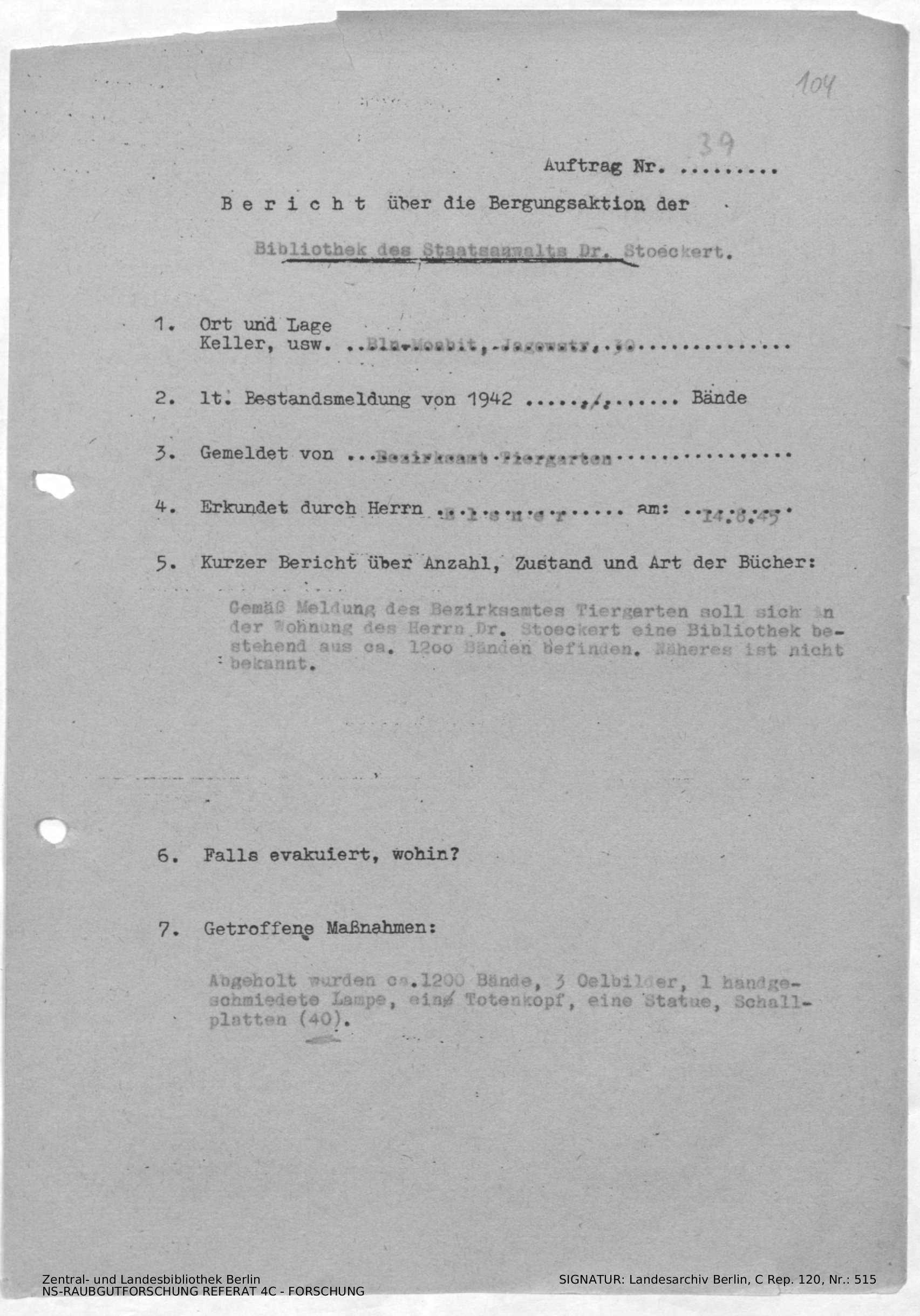 Bericht über die Bergungsaktion der Bibliothek des Staatsanwaltes Dr. Stoeckert