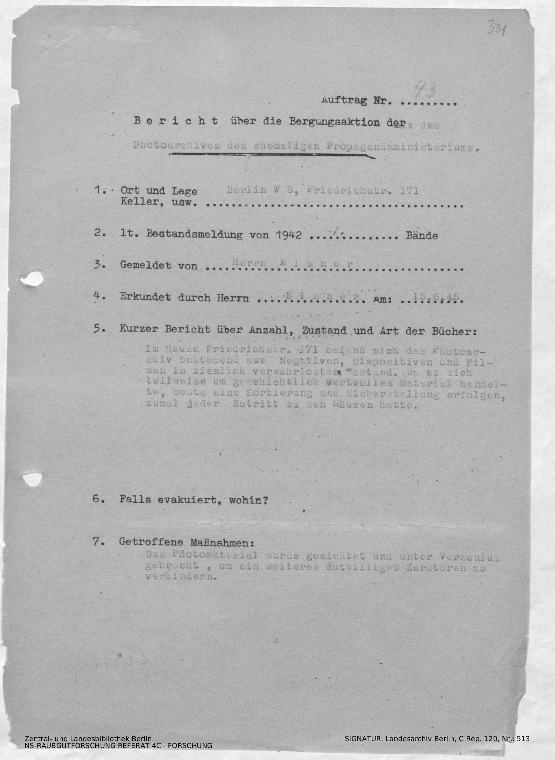 Bericht über die Bergungsaktion des Photoarchivs des ehemaligen Propagandaministeriums