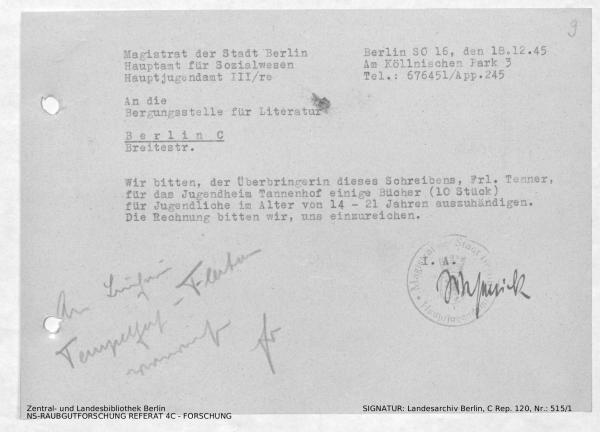 Bitte um Übergabe von Büchern an das Jugendheim Tannenhof