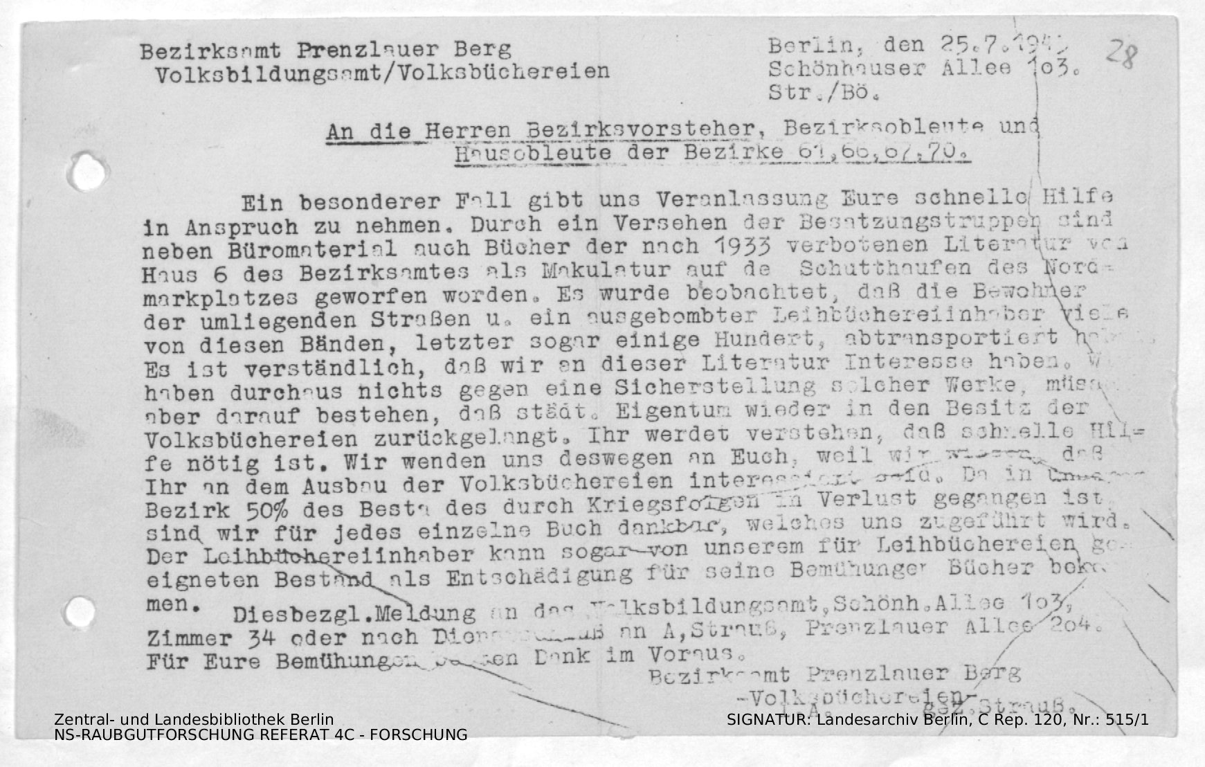Bitte um Unterstützung und Sicherstellung von versehentlich als Makulatur definierten Büchern in Prenzlauer Berg