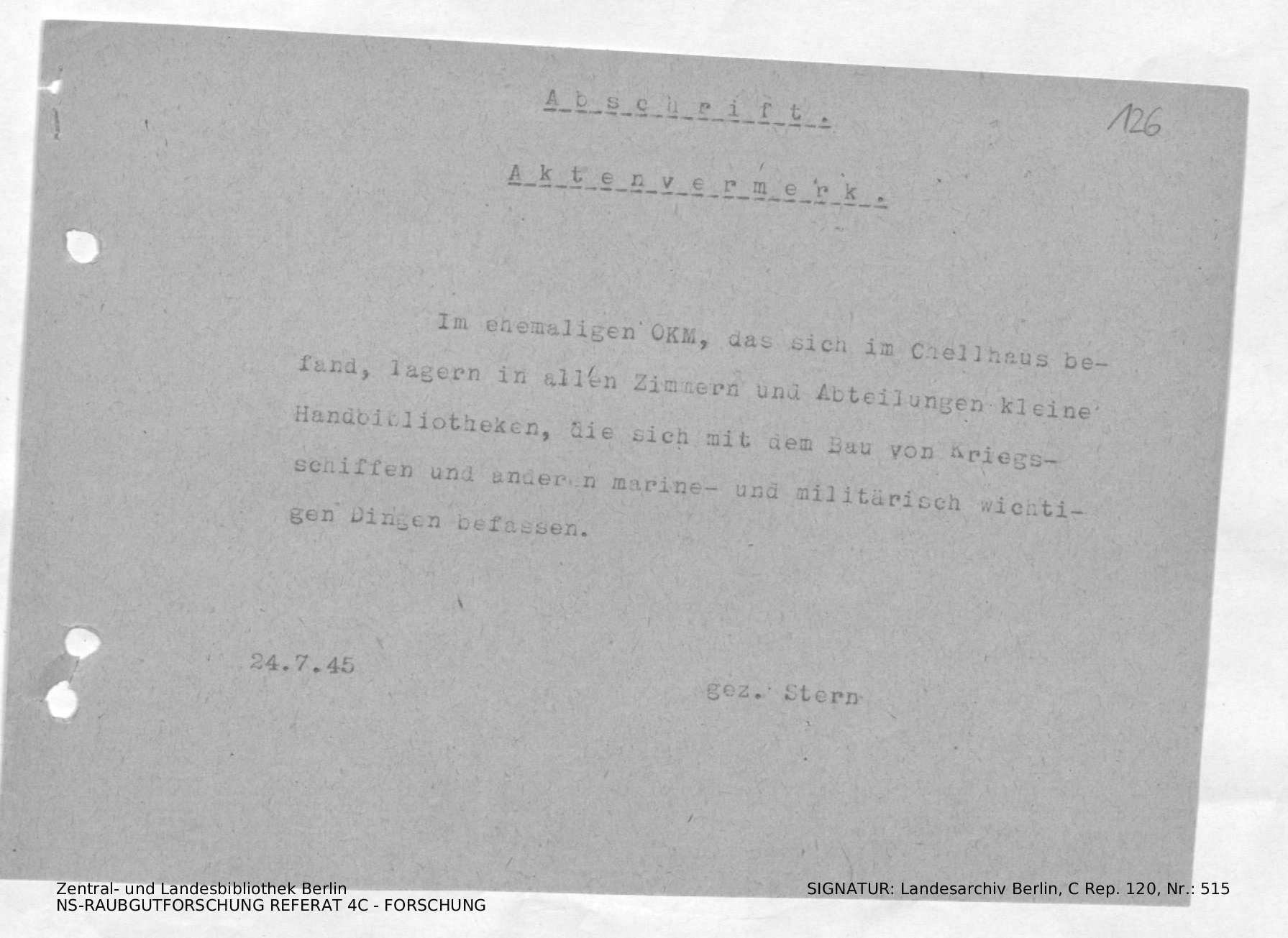 [Durchschlag] AV: Bestandsbeschreibung und Bewertung der Bibliothek des OKM
