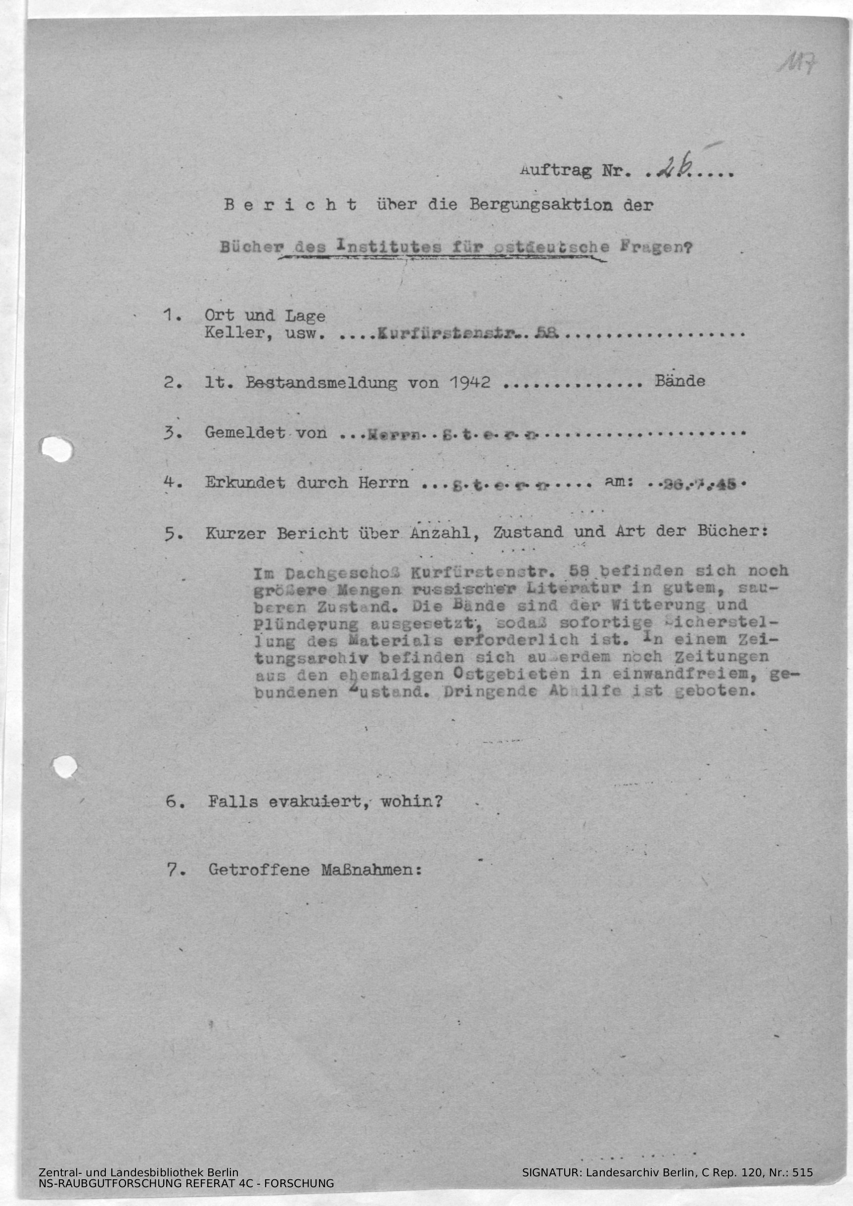 Durchschlag von "Bericht über die Bergungsaktion der Bibliothek der Deutschen Gesellschaft zum Studium Osteuropas"