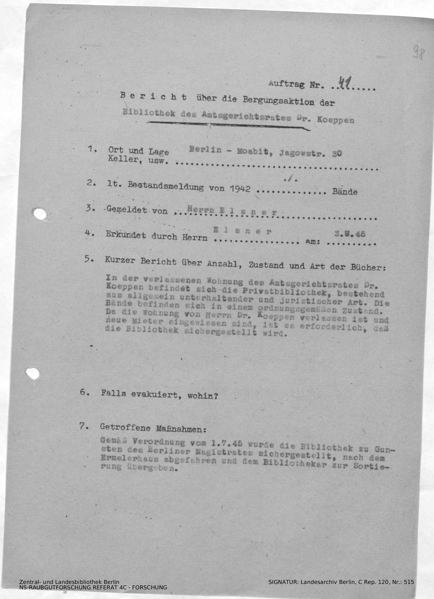 [Durchschlag] Bericht über die Bergungsaktion der Bibliothek des Amtsgerichtsrats Dr. Koeppen