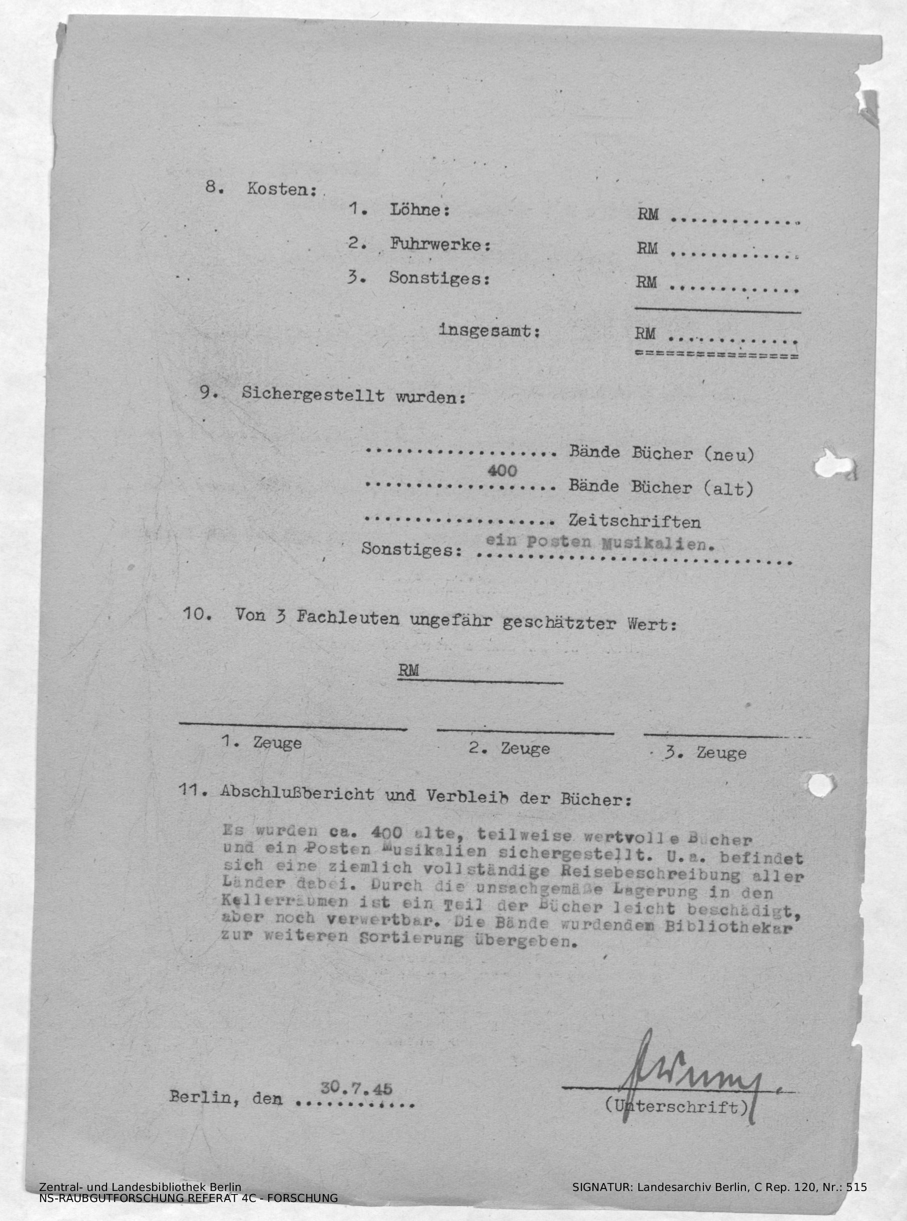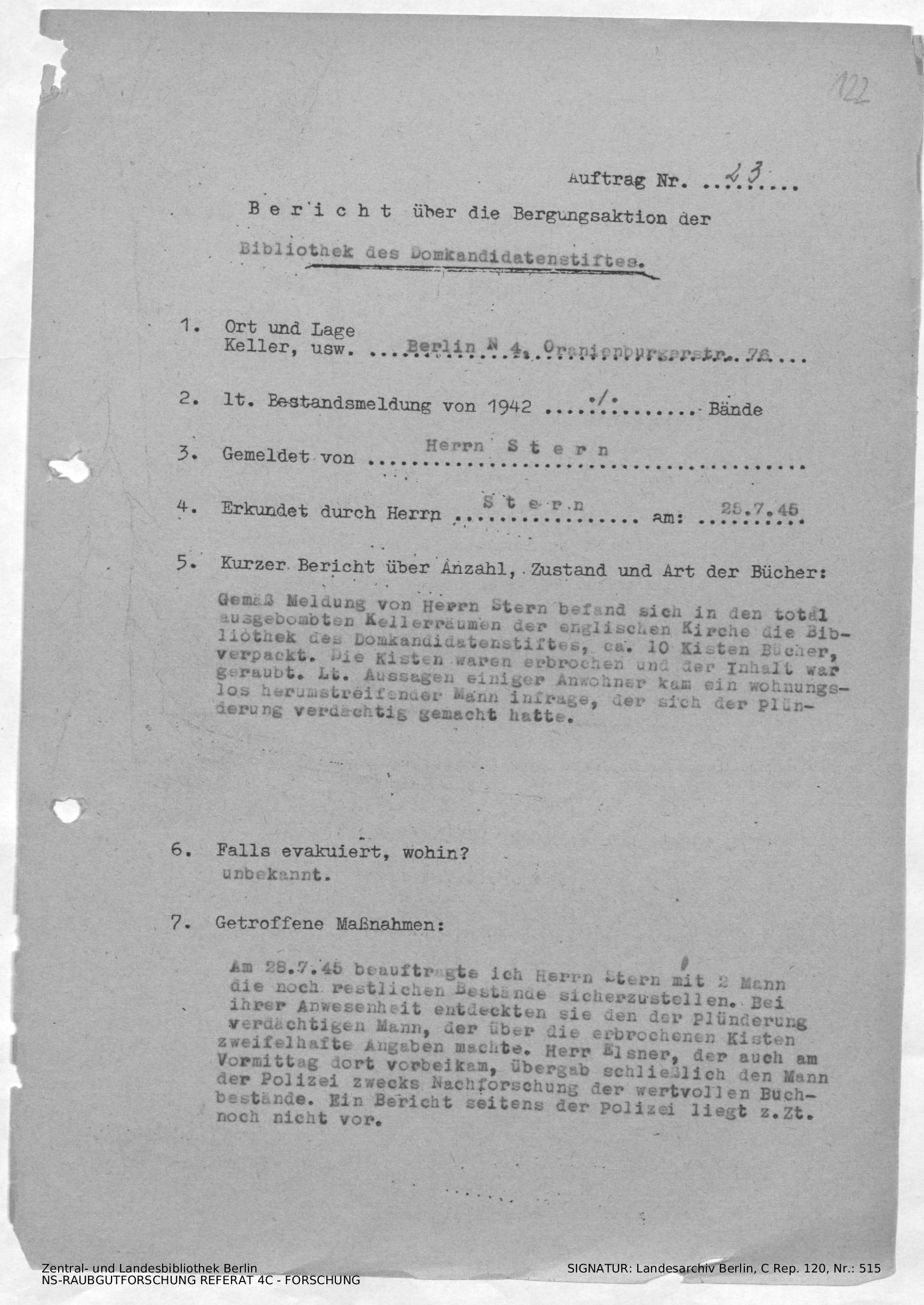 [Durchschlag] Bericht über die Bergungsaktion der Bibliothek des Domkandidatenstiftes
