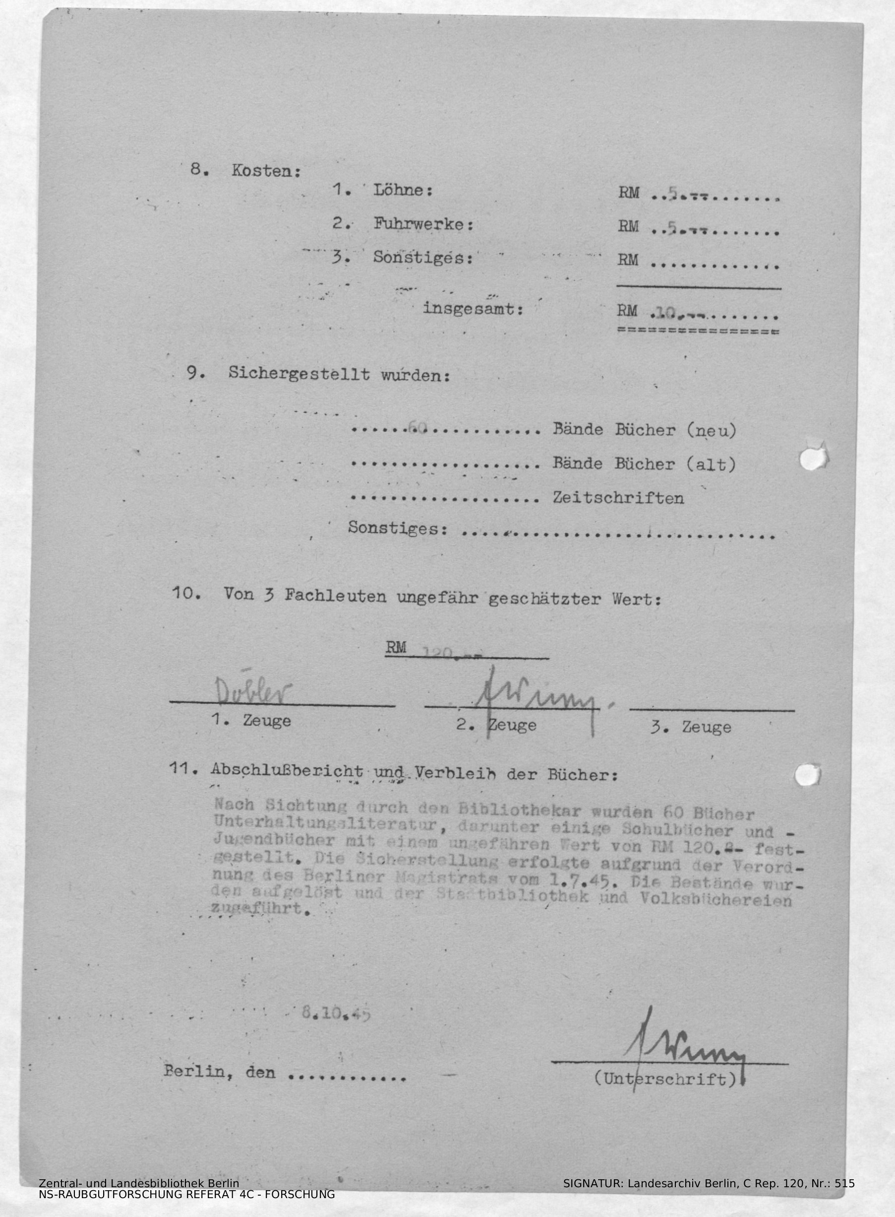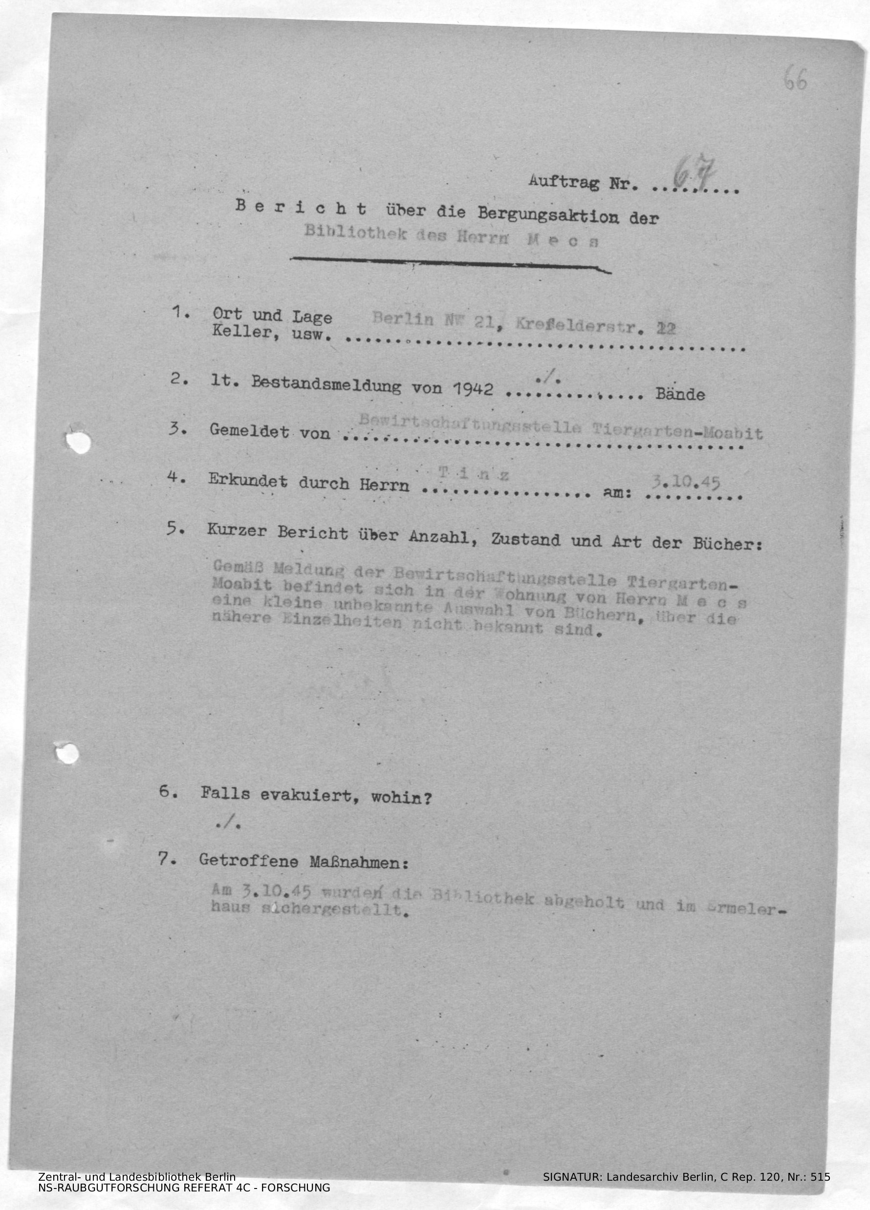 [Durchschlag] Bericht über die Bergungsaktion der Bibliothek des Herrn Mecs