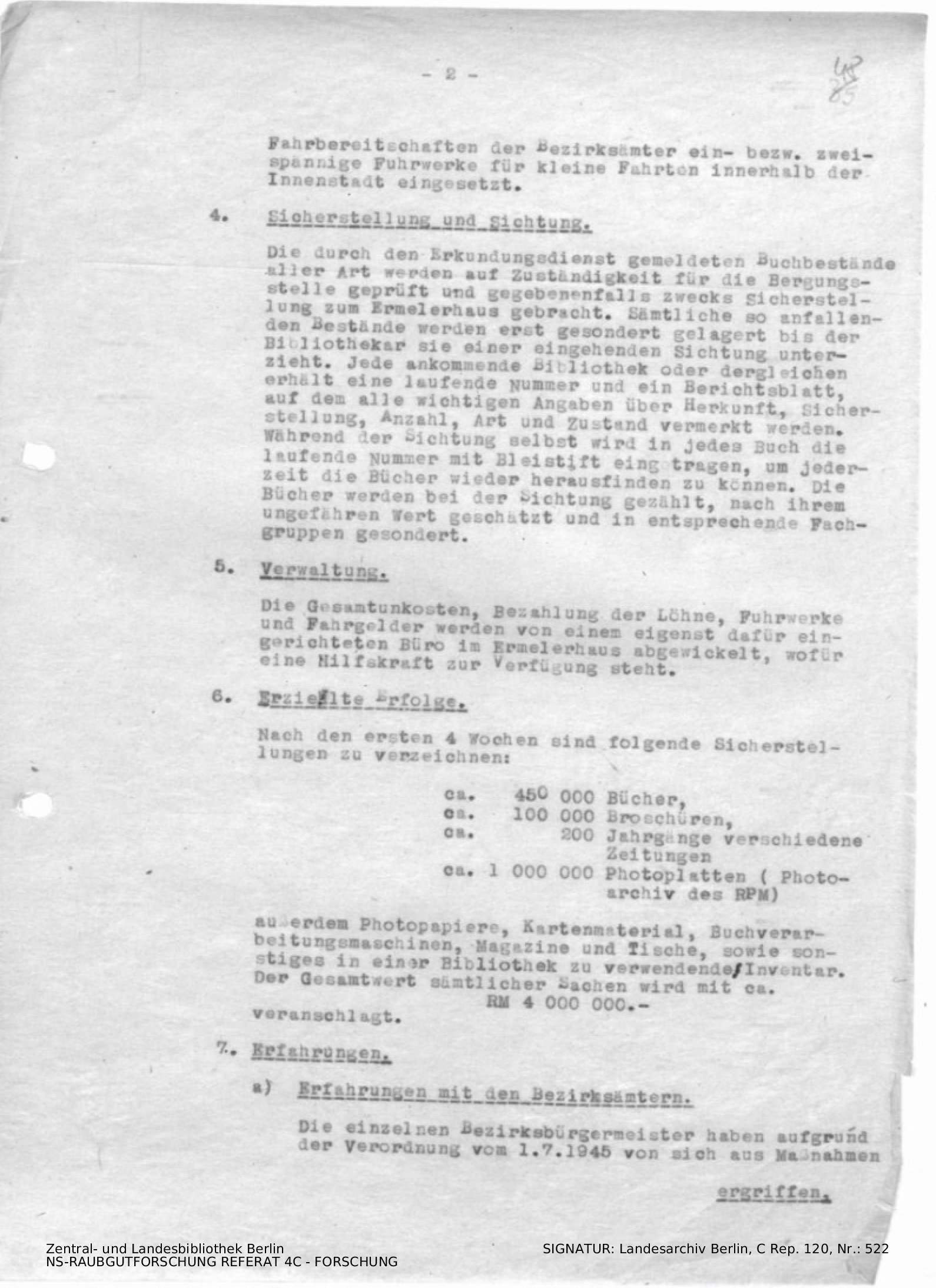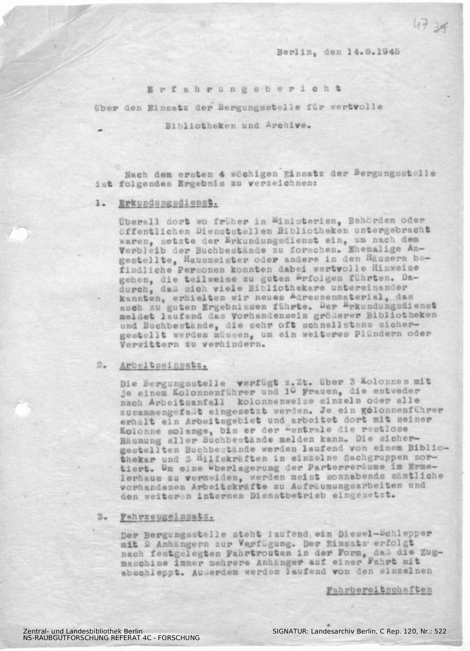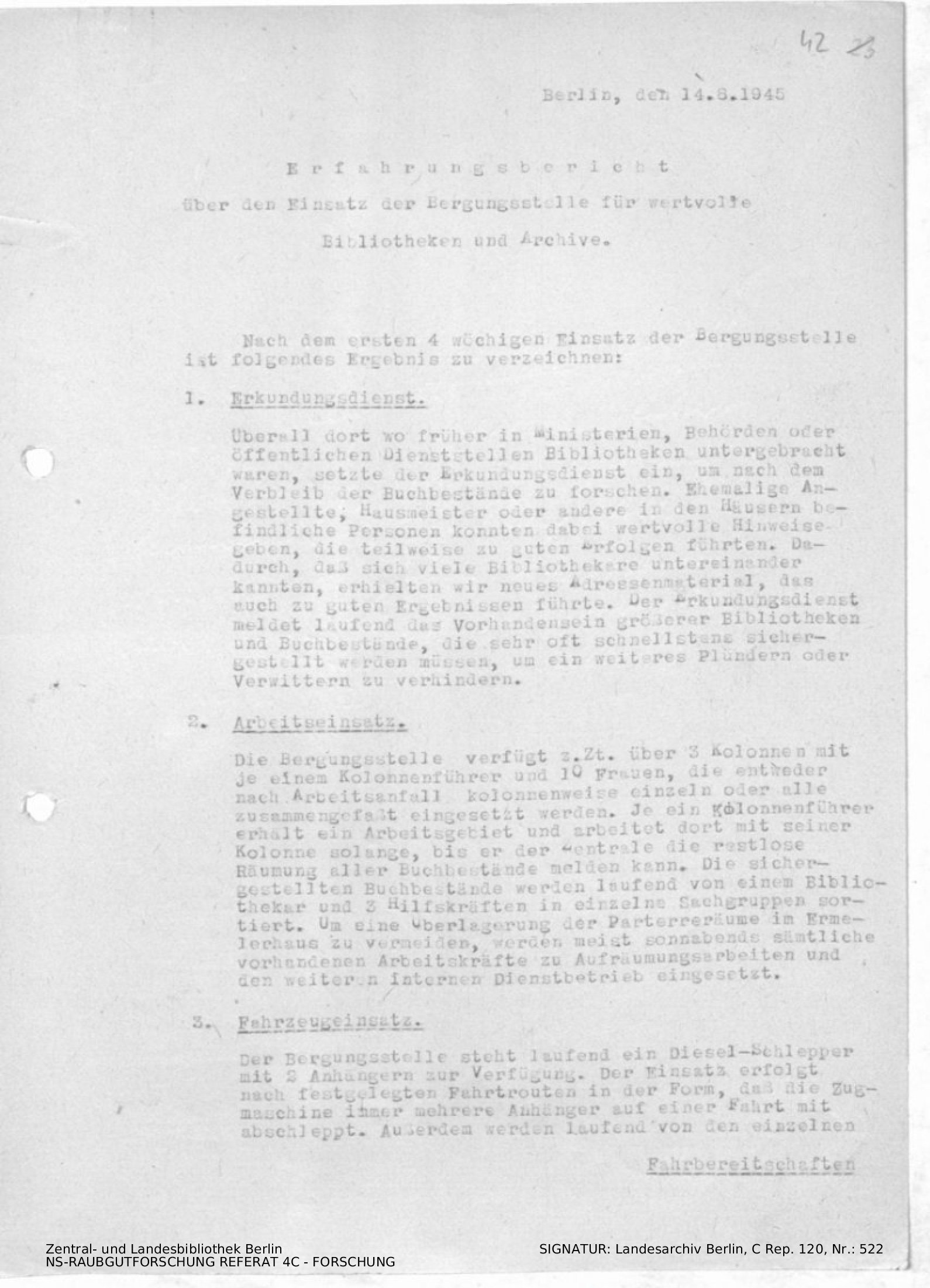 Erfahrungsbericht über den Einsatz der Bergungsstelle für wertvolle Bibliotheken und Archive (inkl. Durchschlag)
