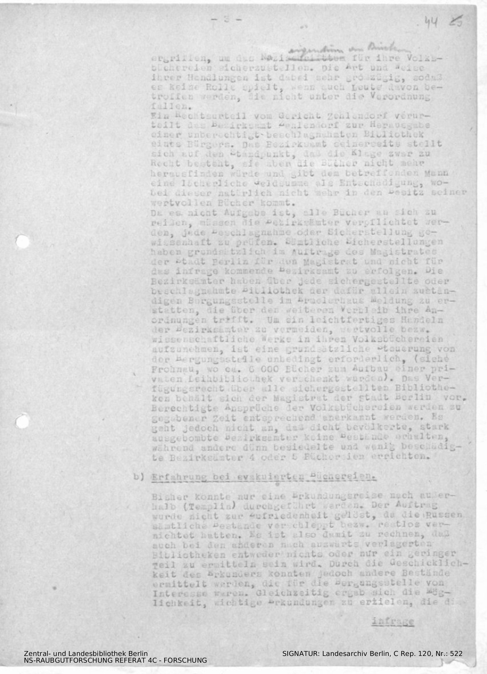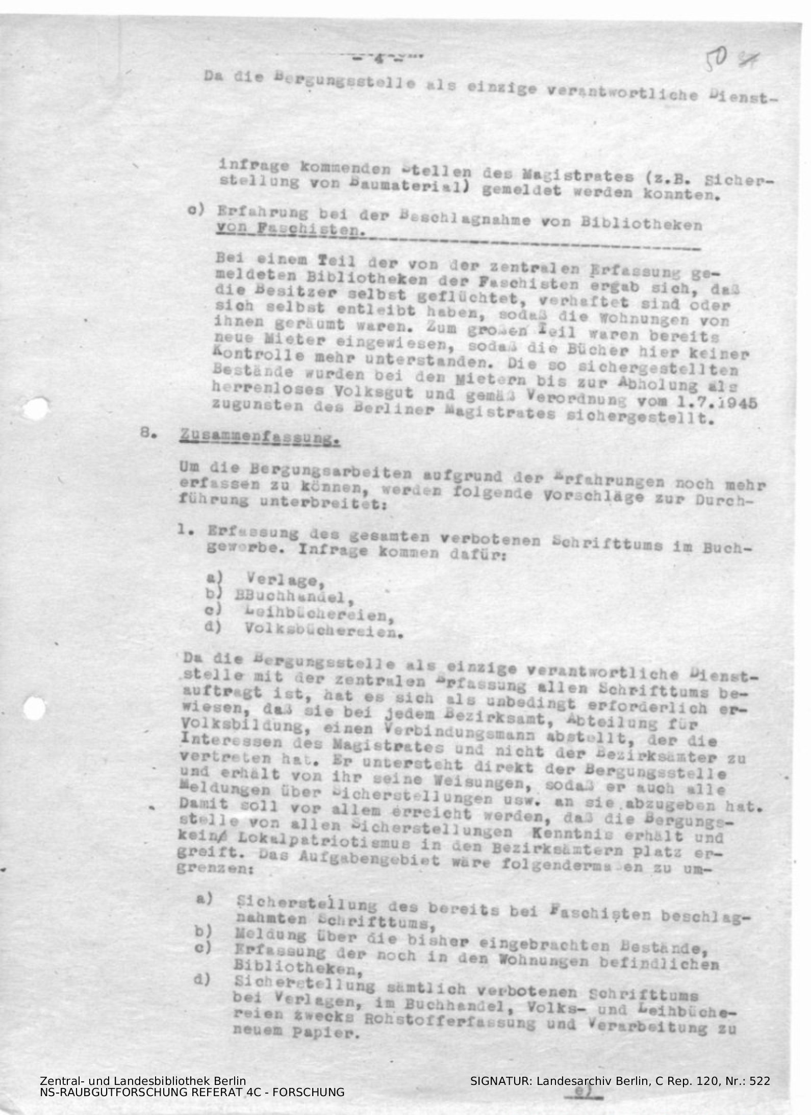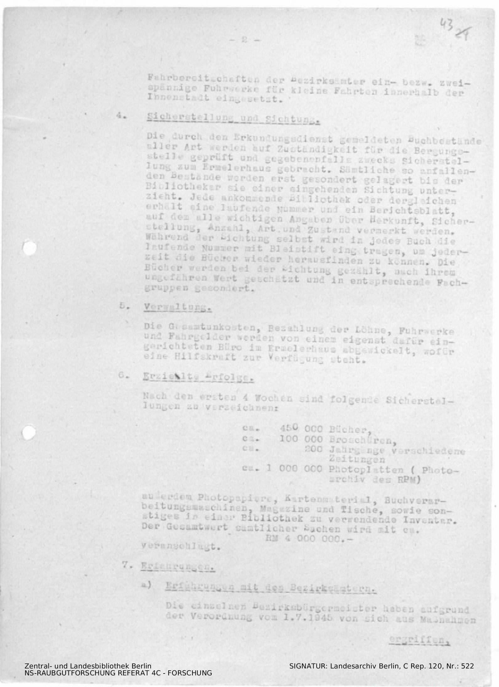 Erfahrungsbericht über den Einsatz der Bergungsstelle für wertvolle Bibliotheken und Archive (inkl. Durchschlag)