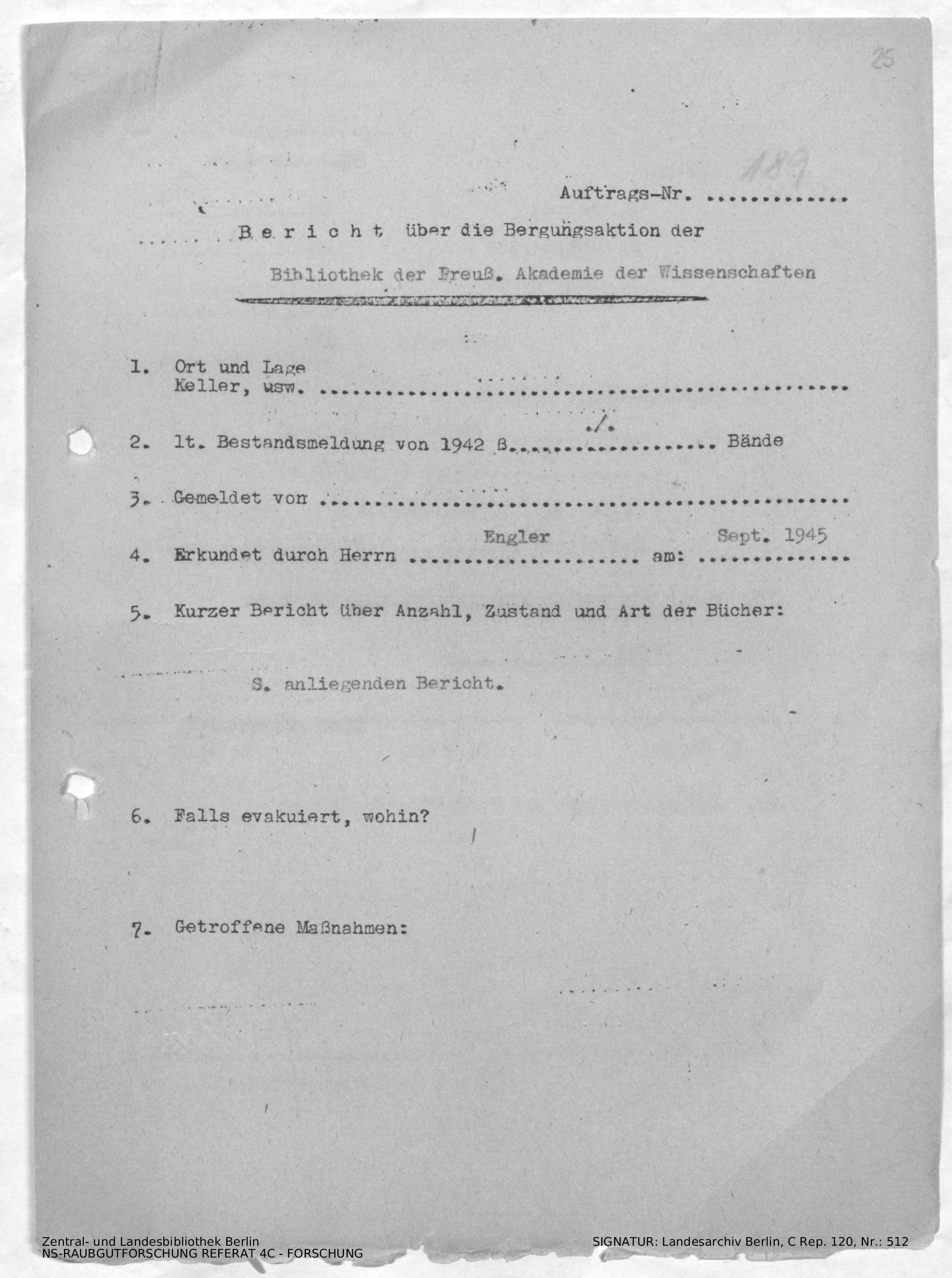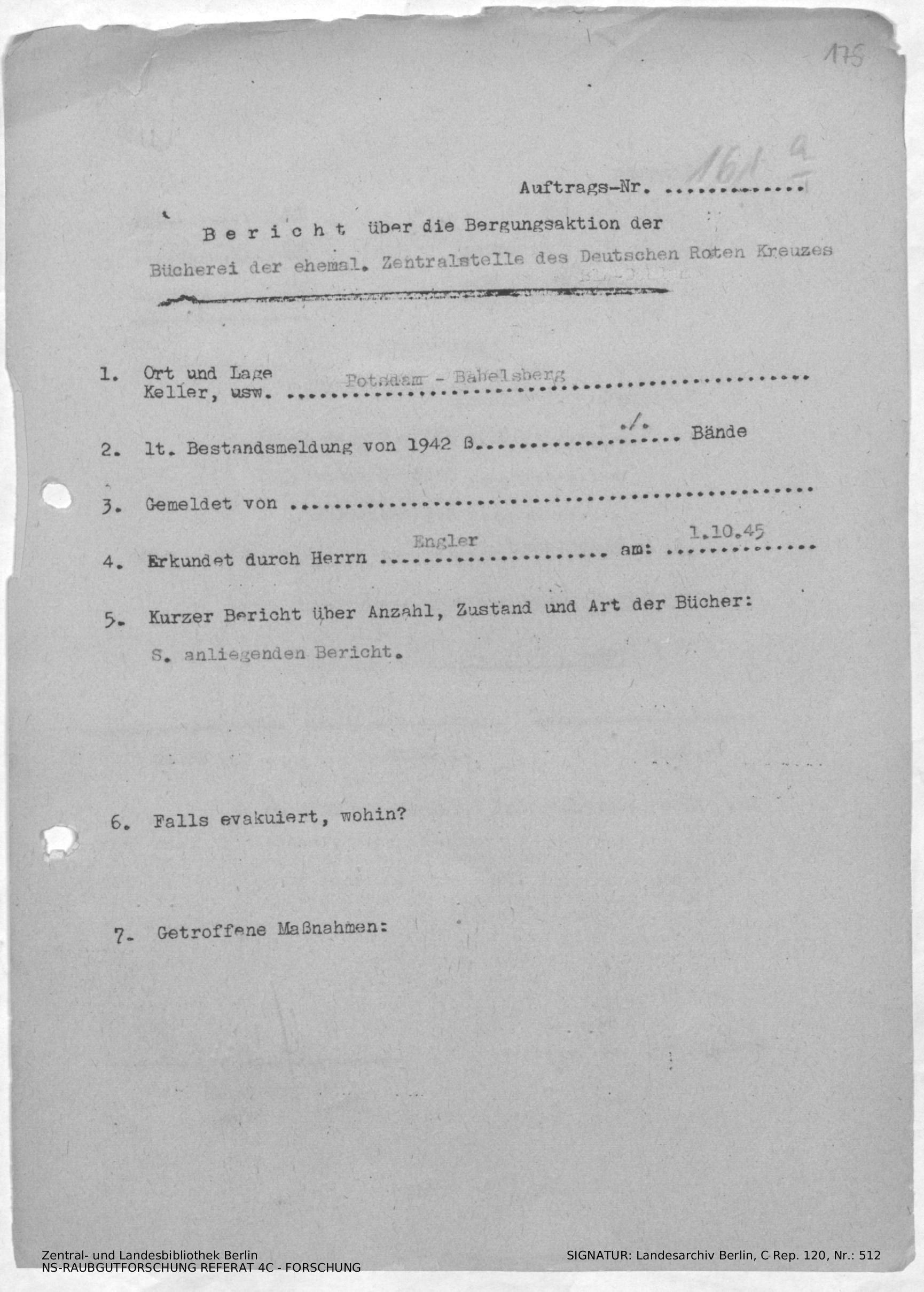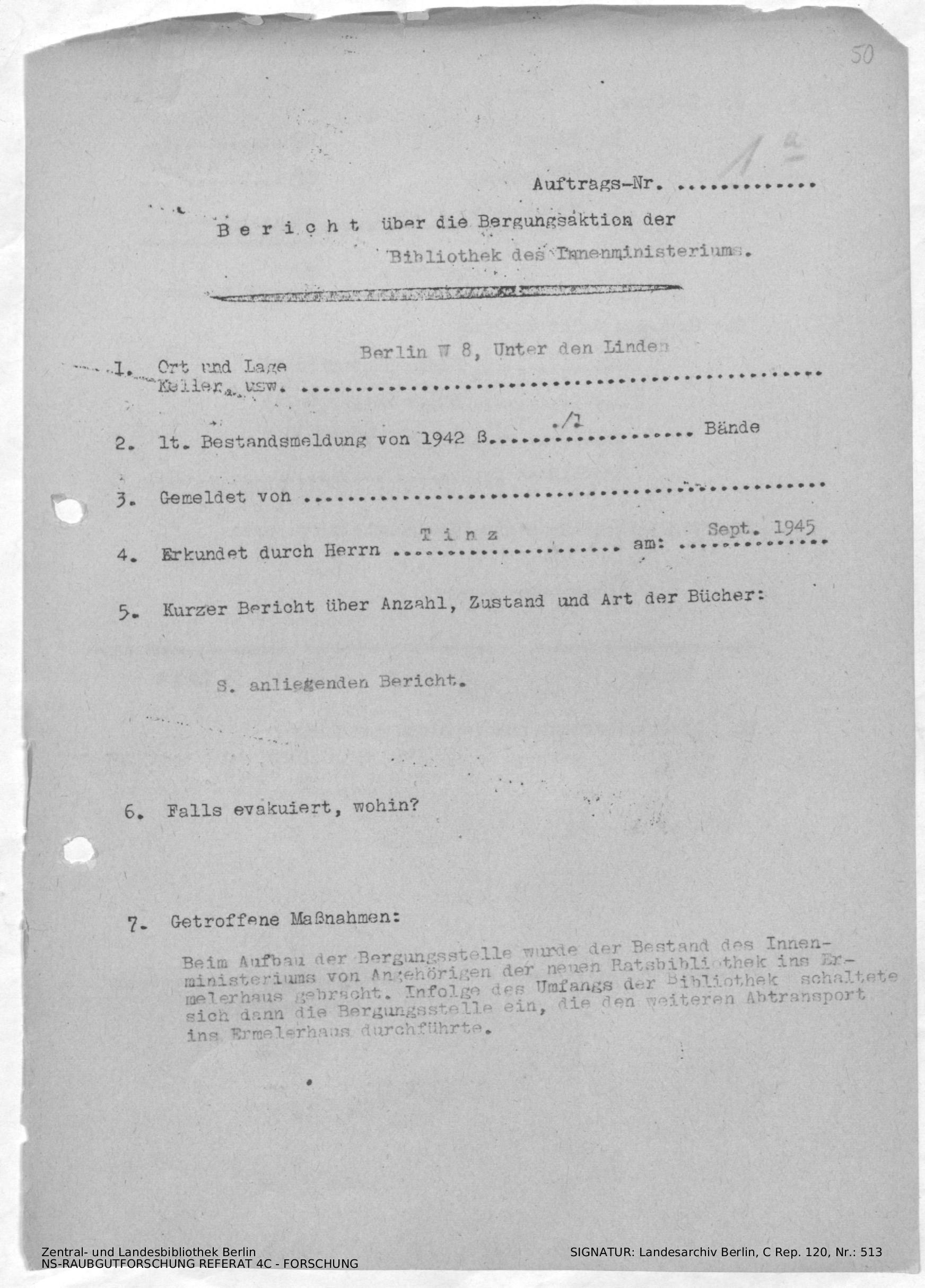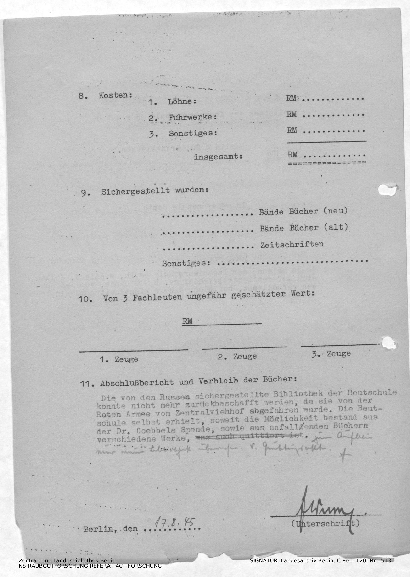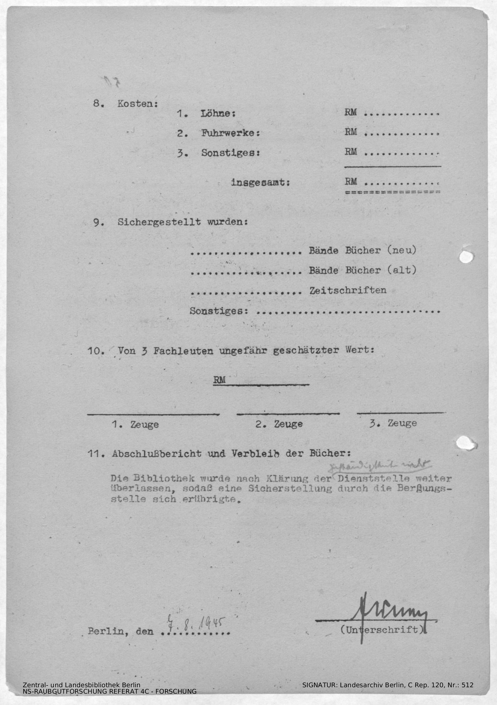Abschlußbericht: Bibliothek im September 1945 erkundet, konnte jedoch nicht sichergestellt werden, da die Militärbehörden Interesse an Bibliothek zeigten.