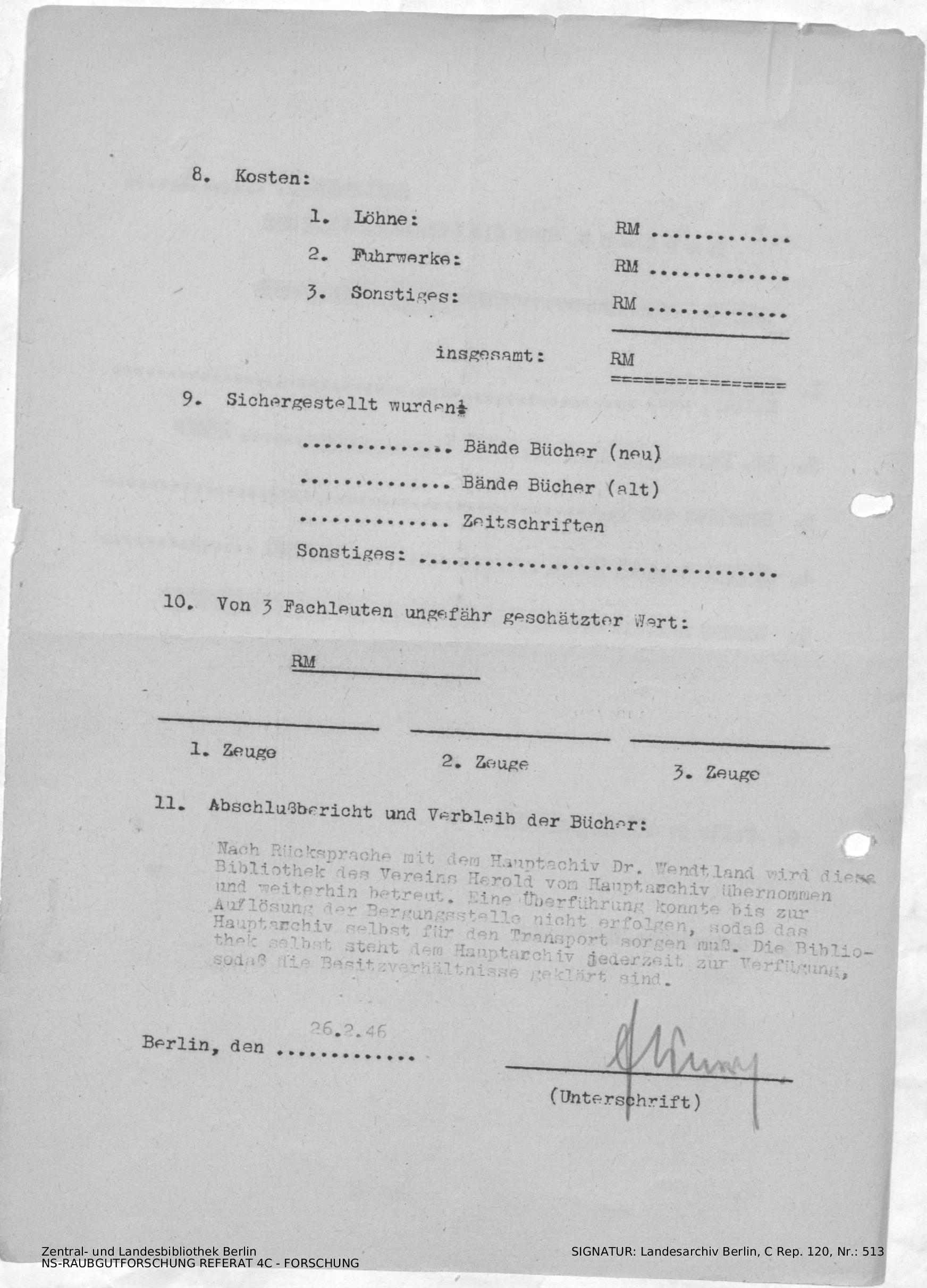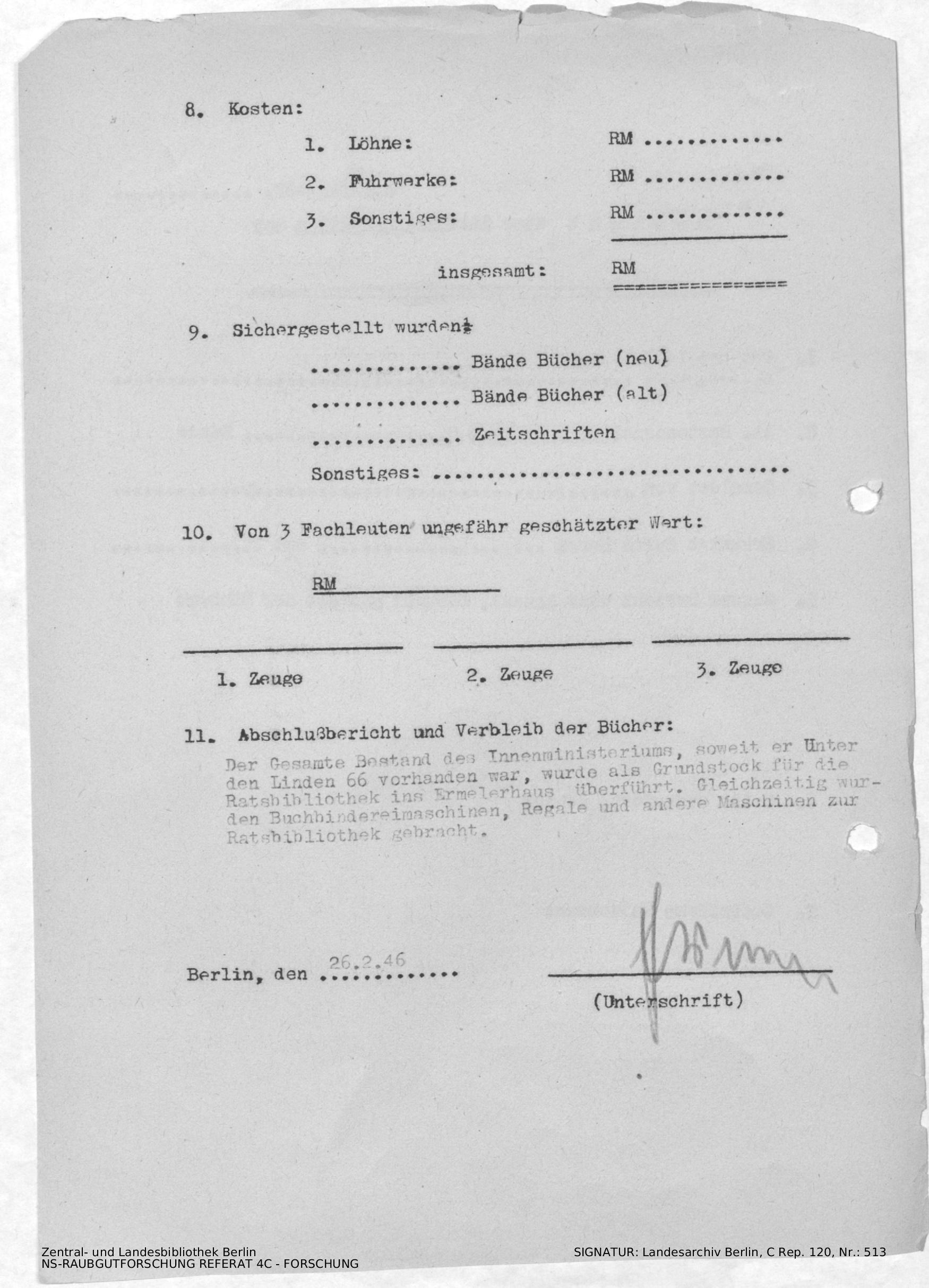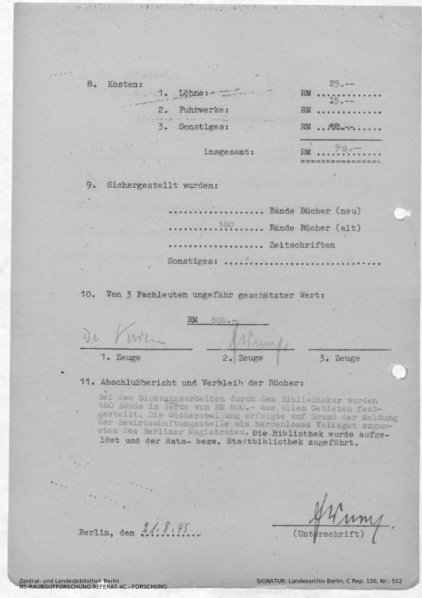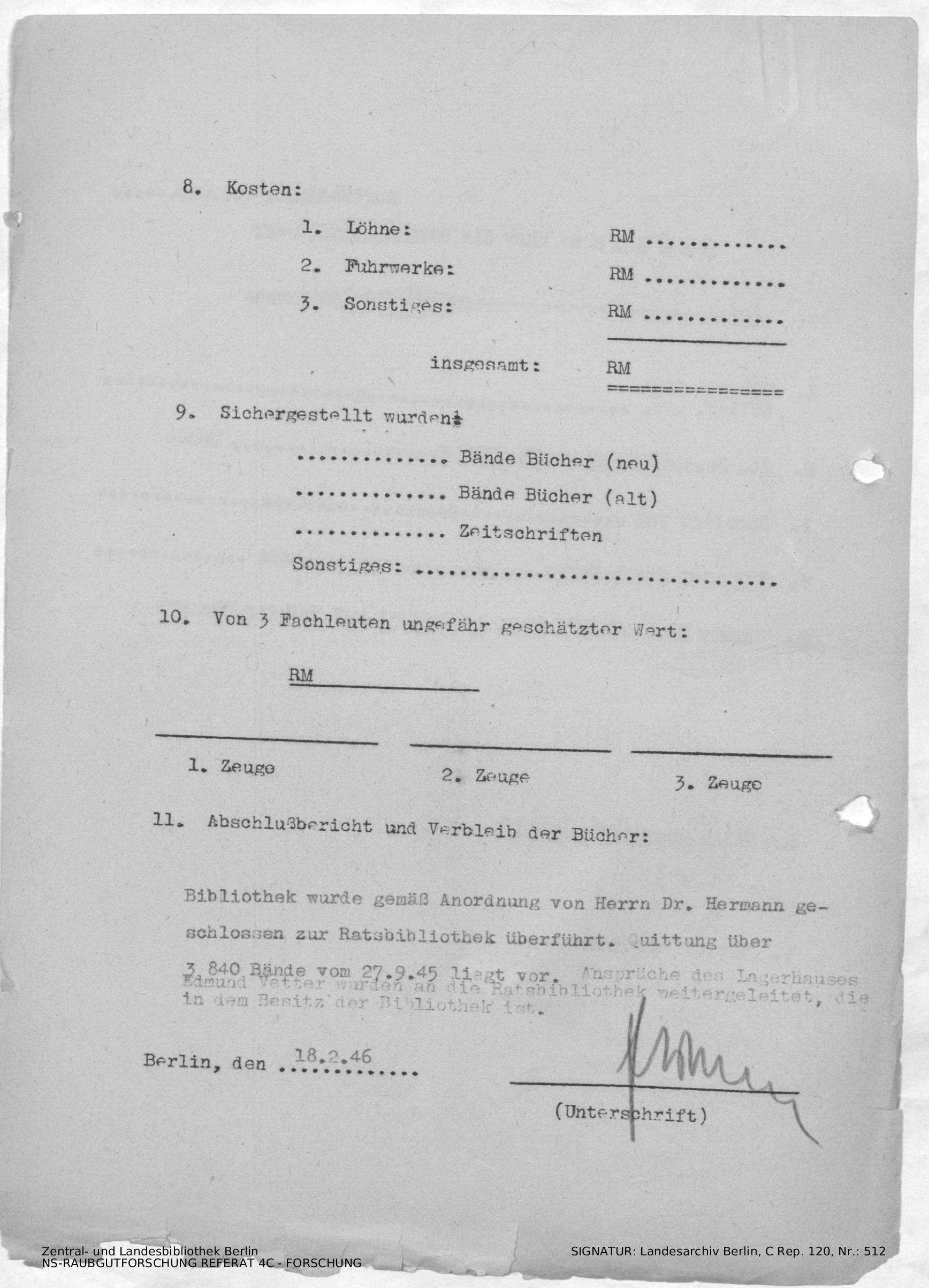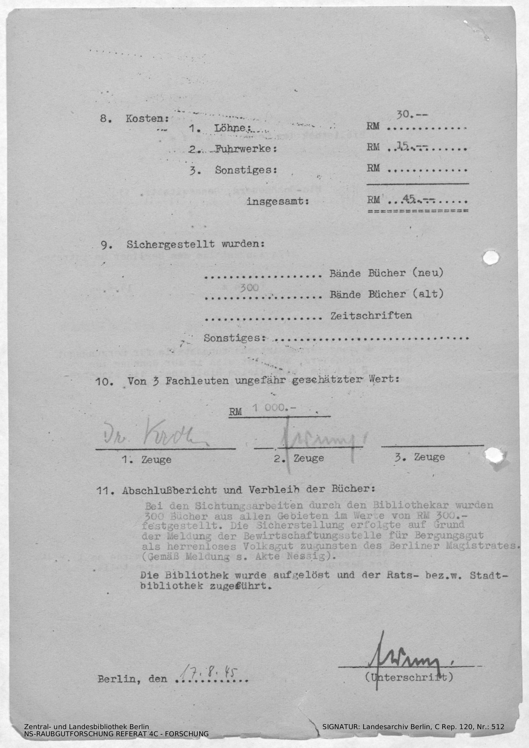 Abschlußbericht: Bibliothek im September 1945 erkundet, konnte jedoch nicht sichergestellt werden, da die Militärbehörden Interesse an Bibliothek zeigten.