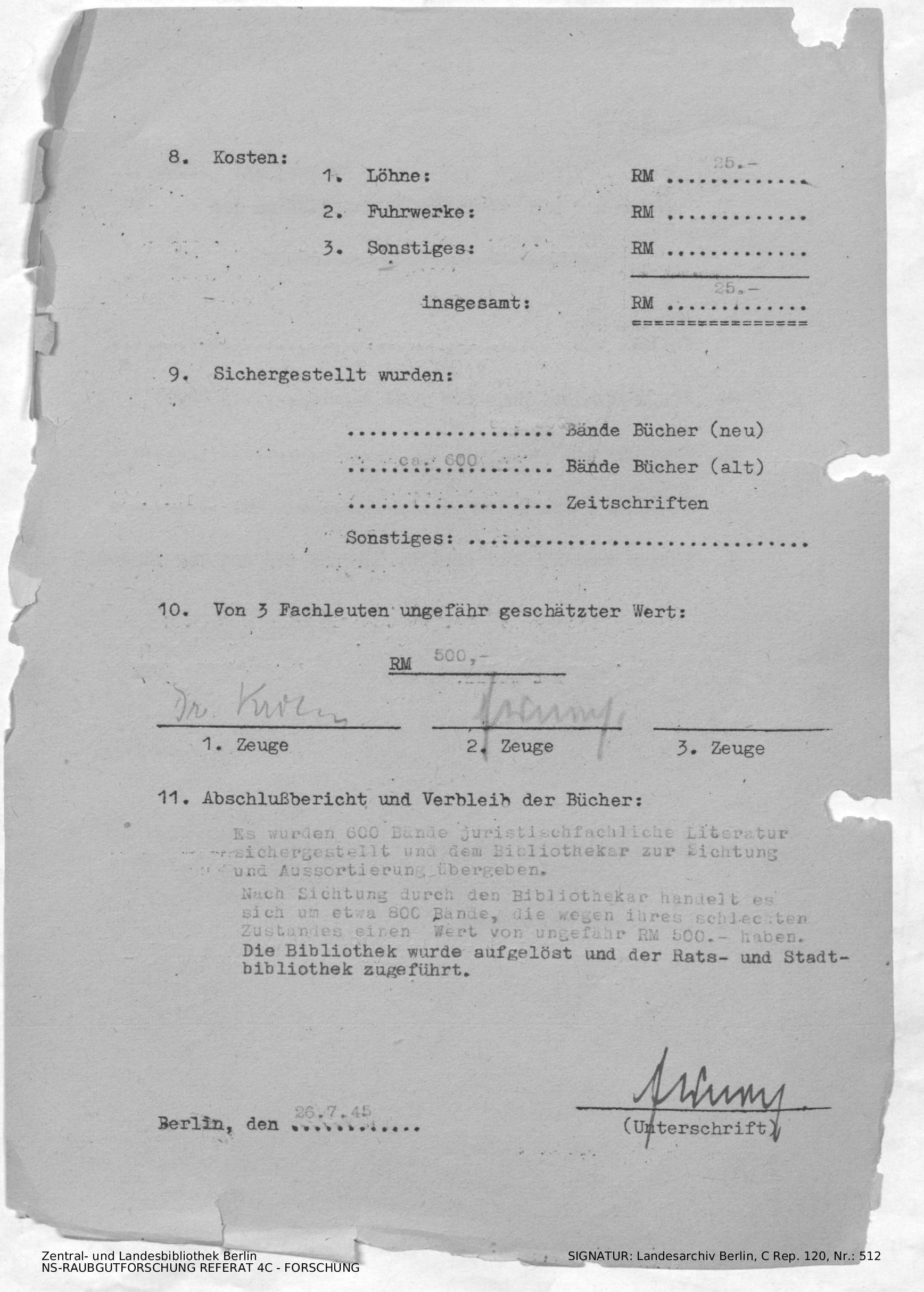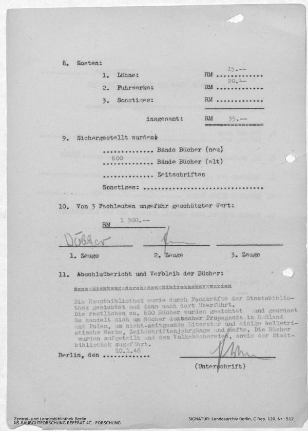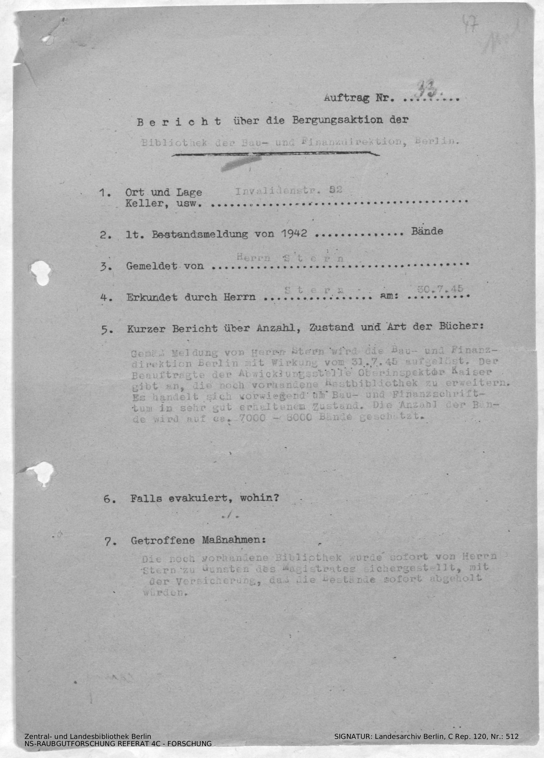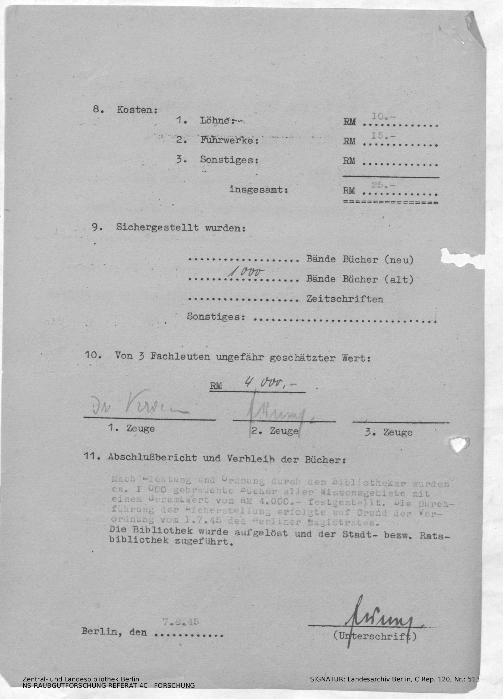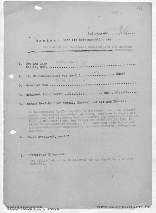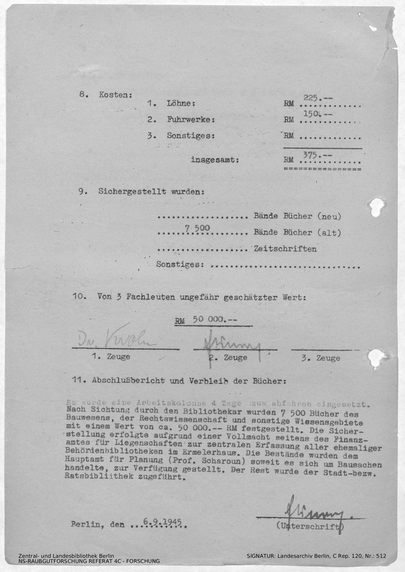 Abschlußbericht: Bibliothek im September 1945 erkundet, konnte jedoch nicht sichergestellt werden, da die Militärbehörden Interesse an Bibliothek zeigten.