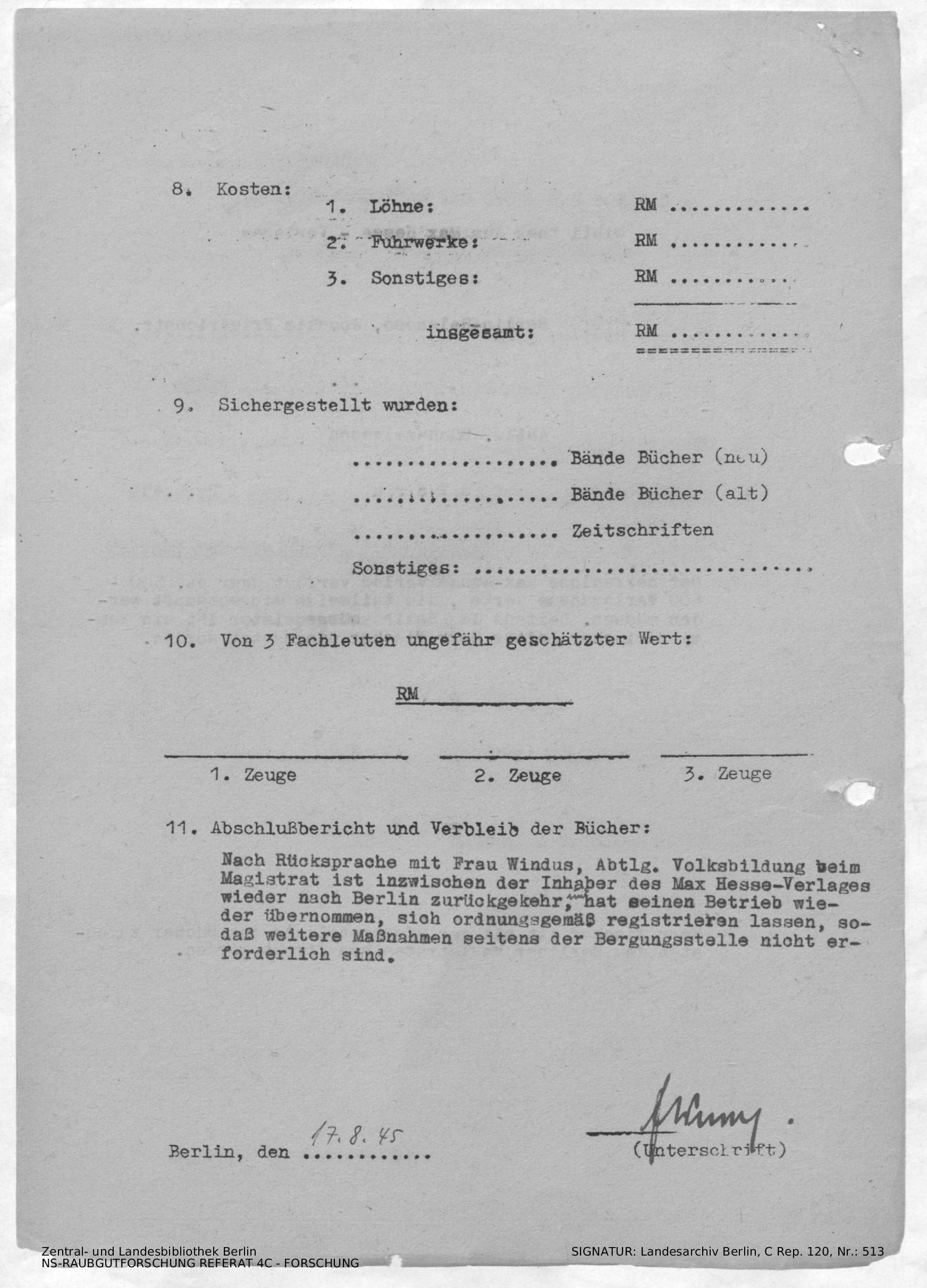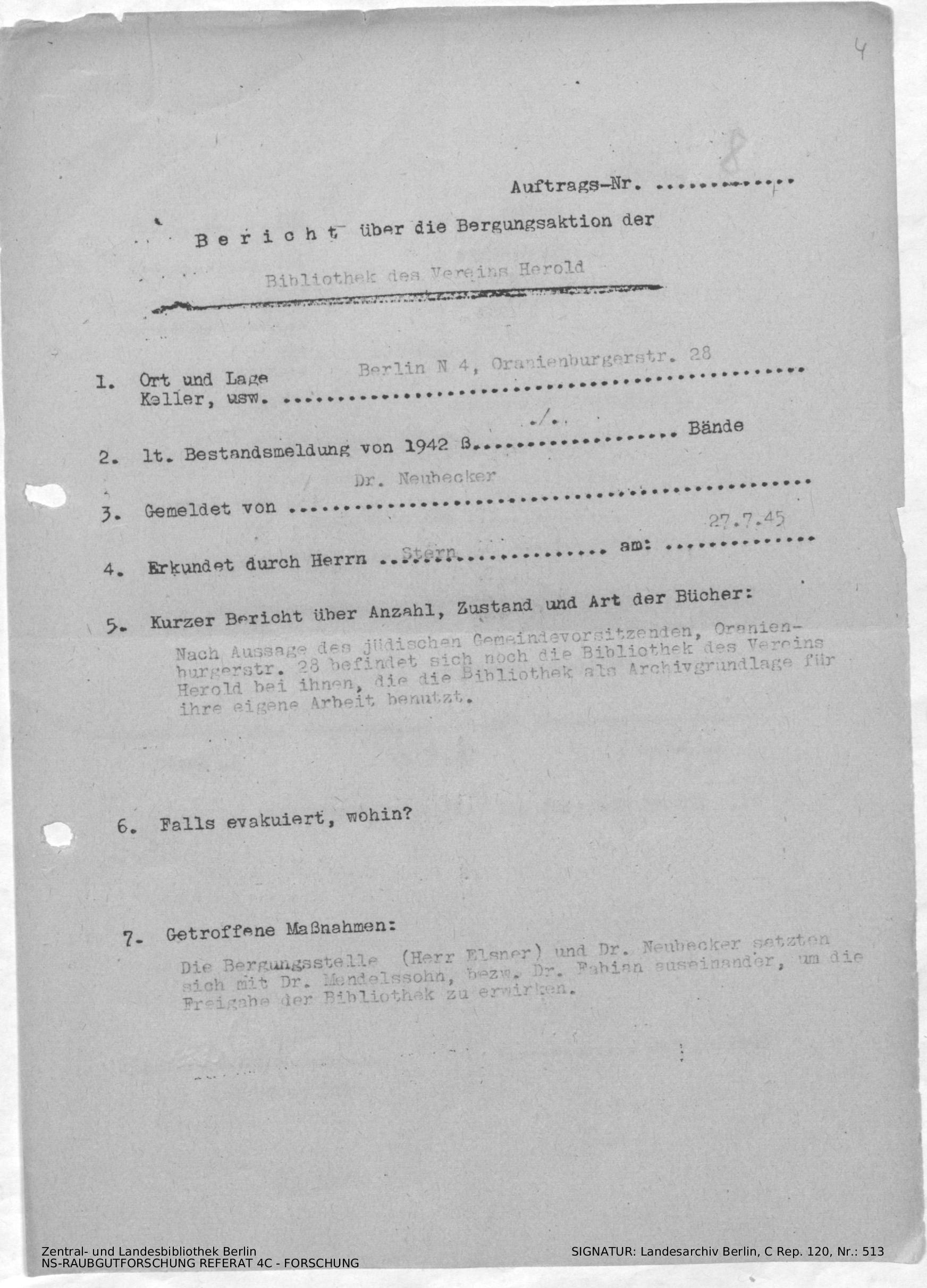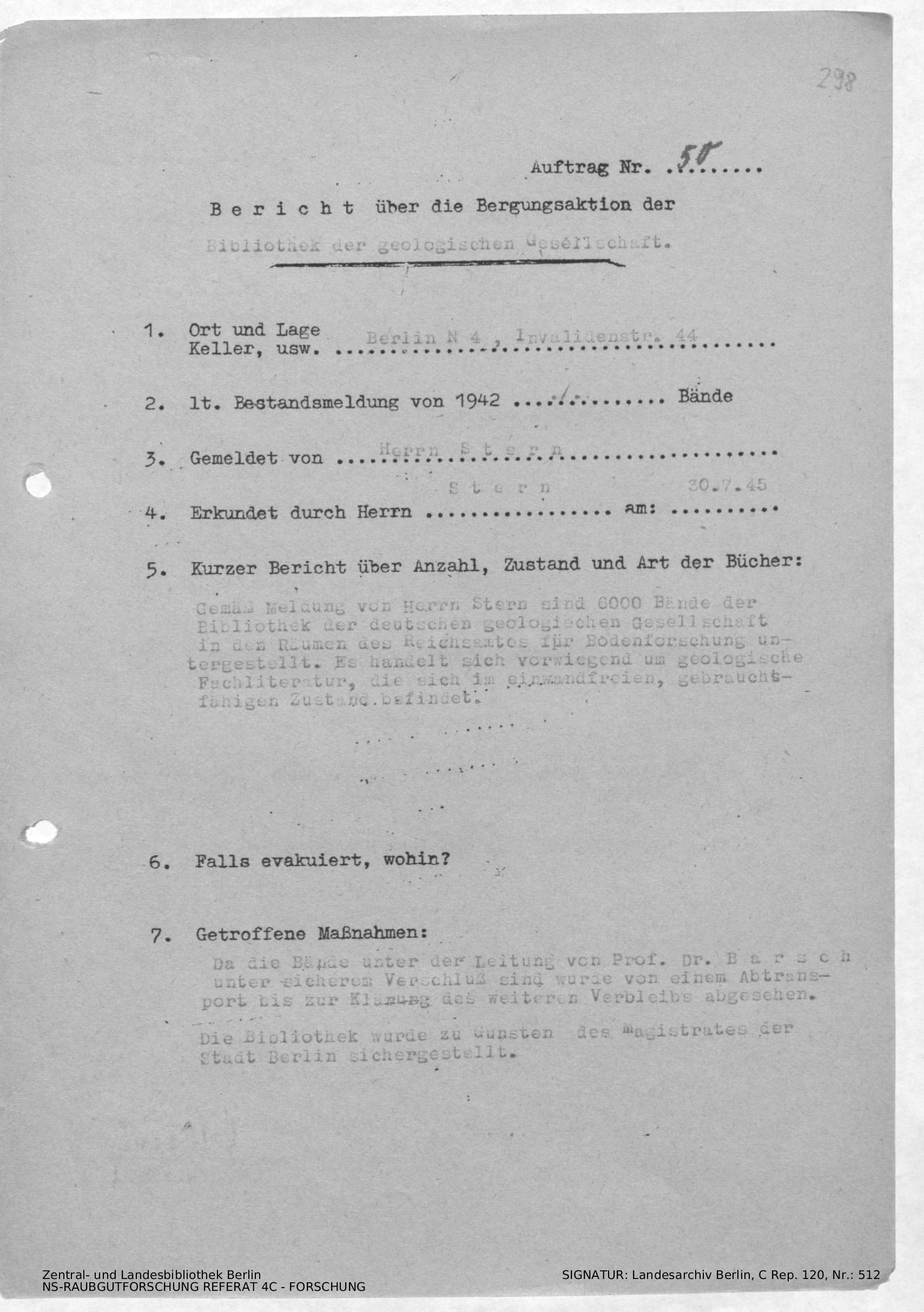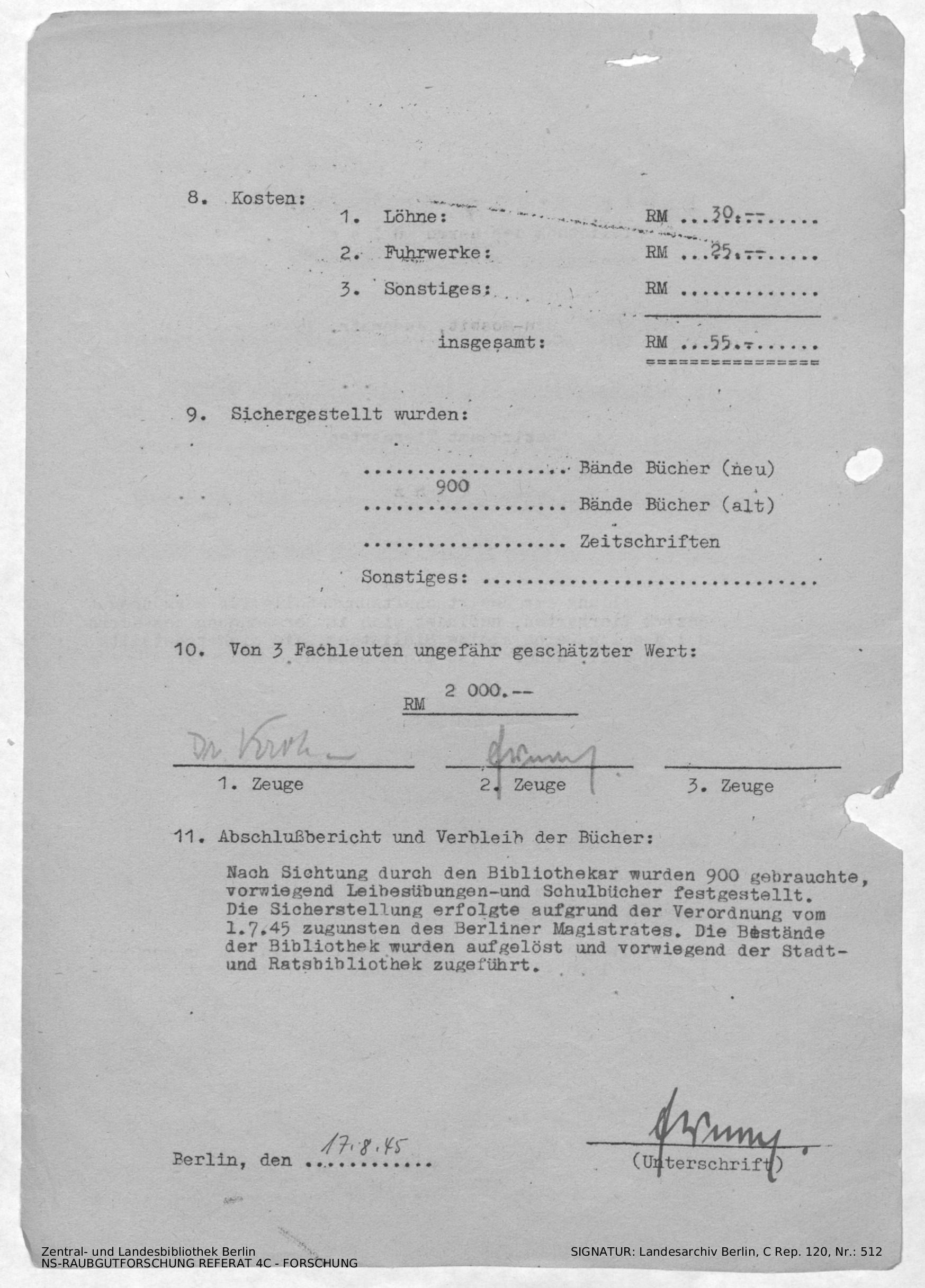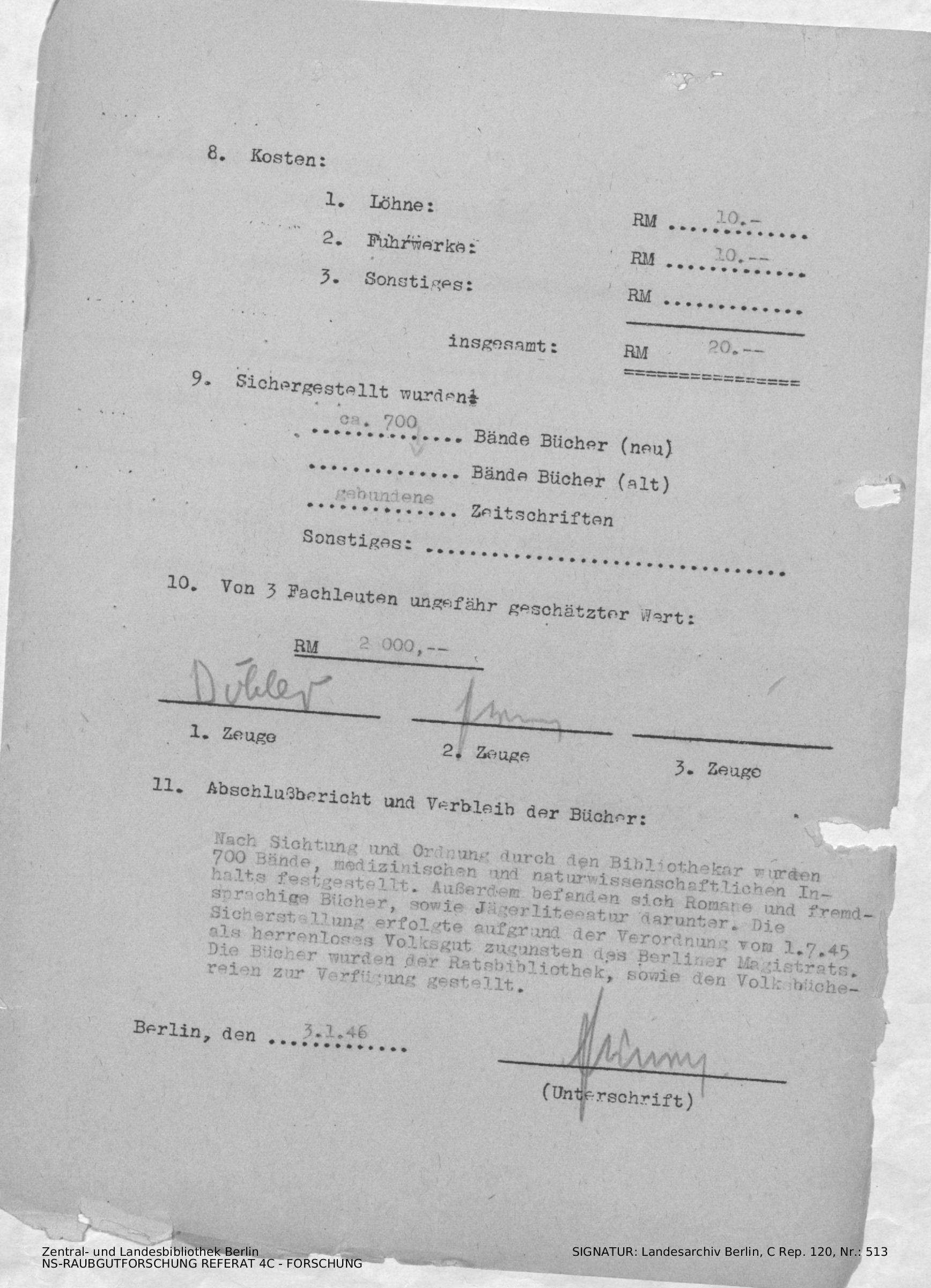 Abschlußbericht: Bibliothek im September 1945 erkundet, konnte jedoch nicht sichergestellt werden, da die Militärbehörden Interesse an Bibliothek zeigten.