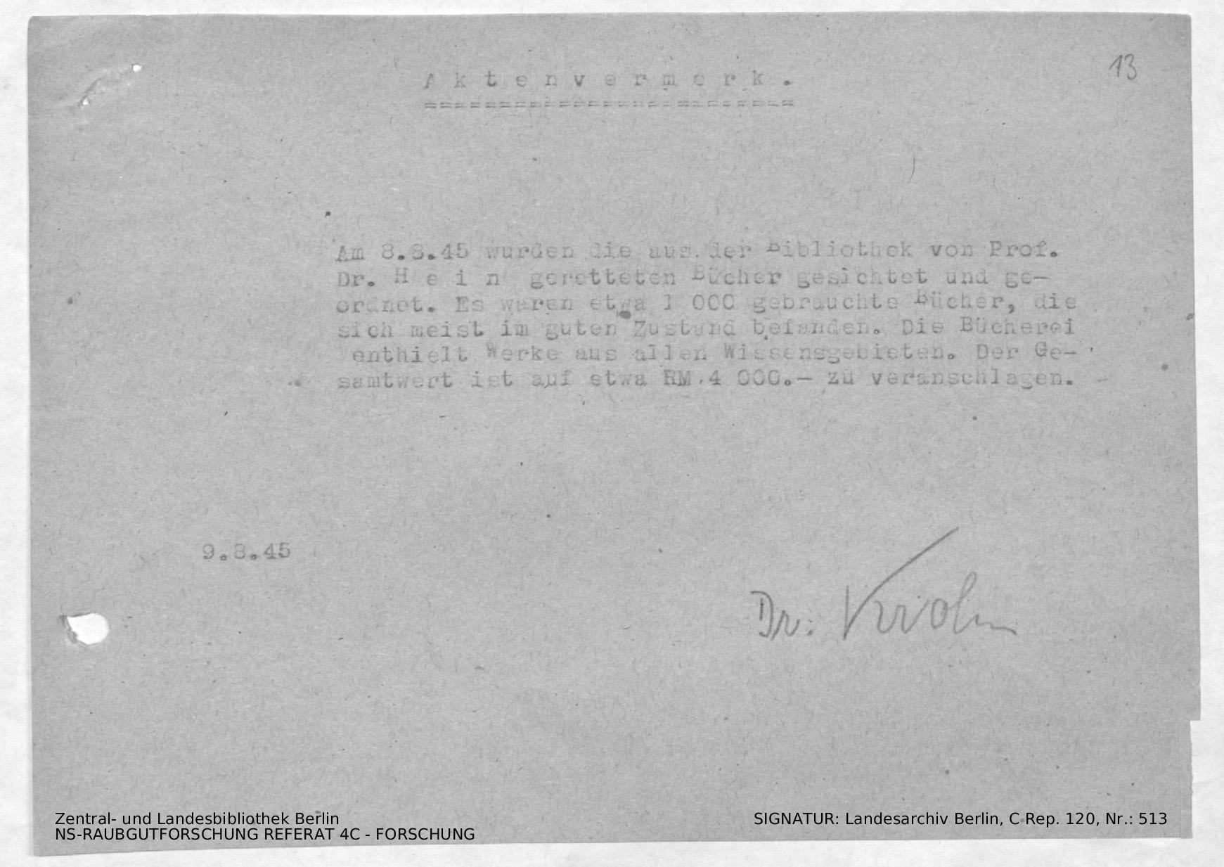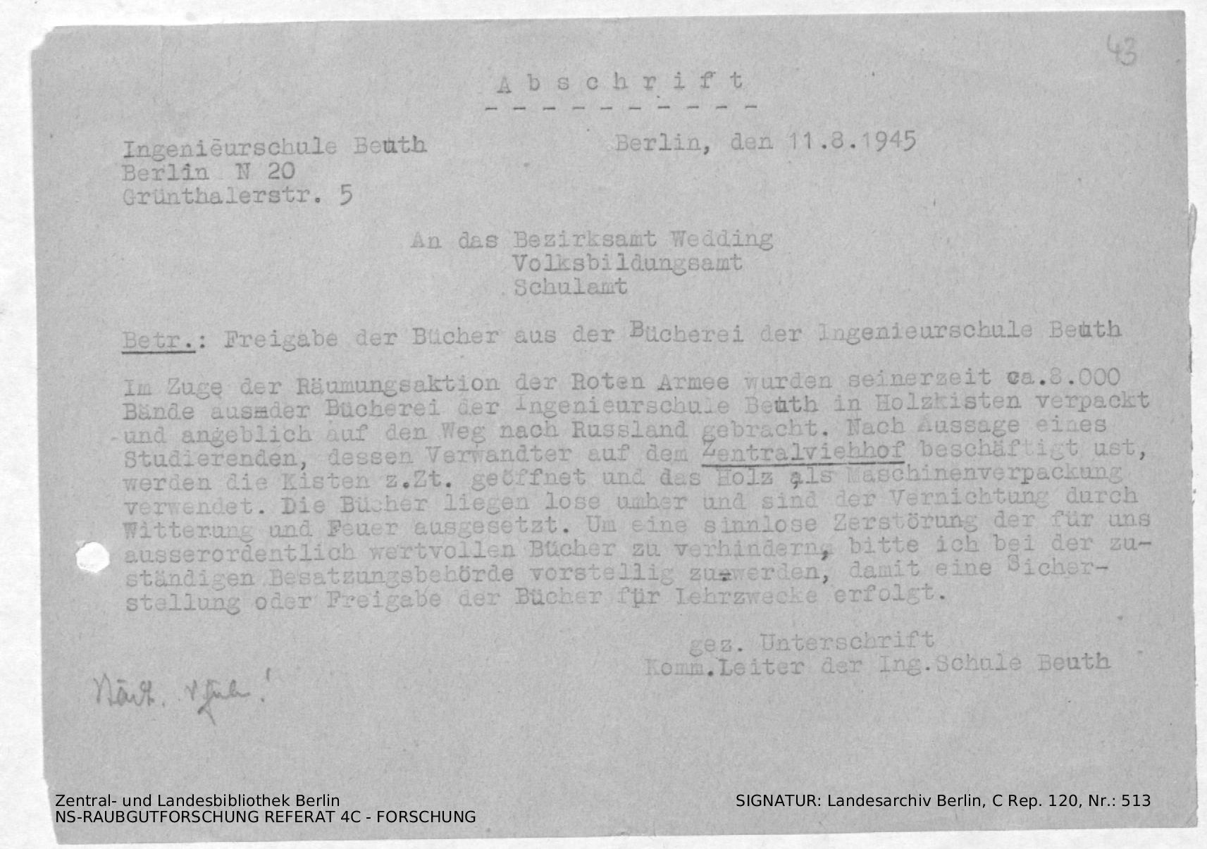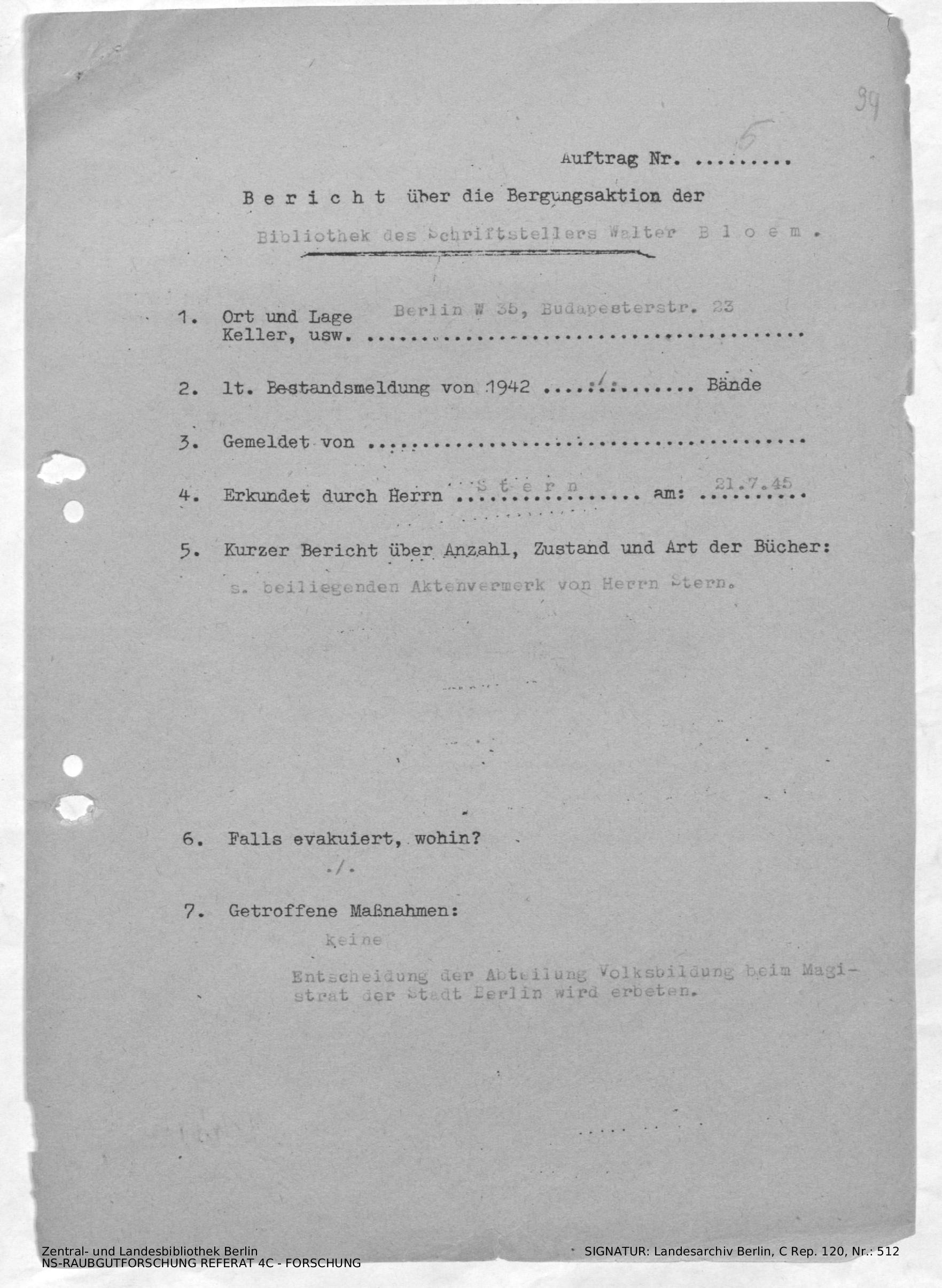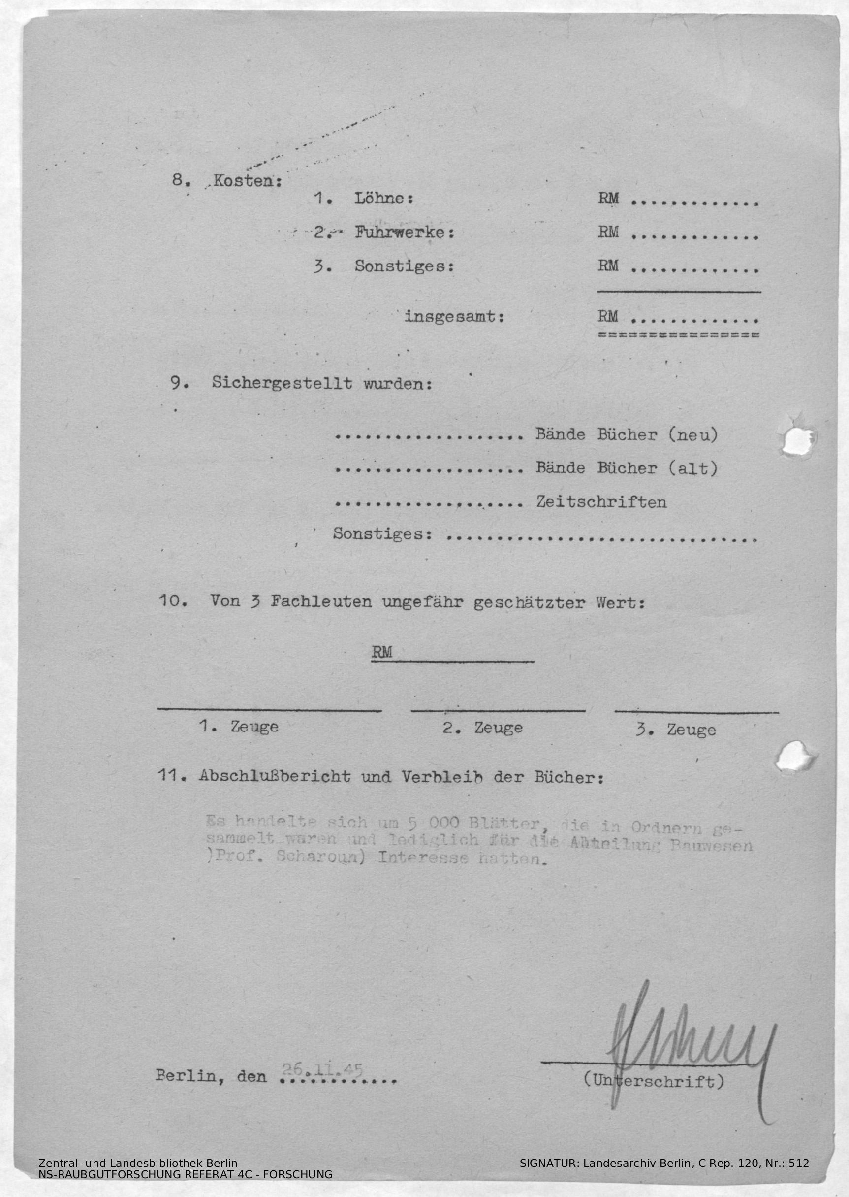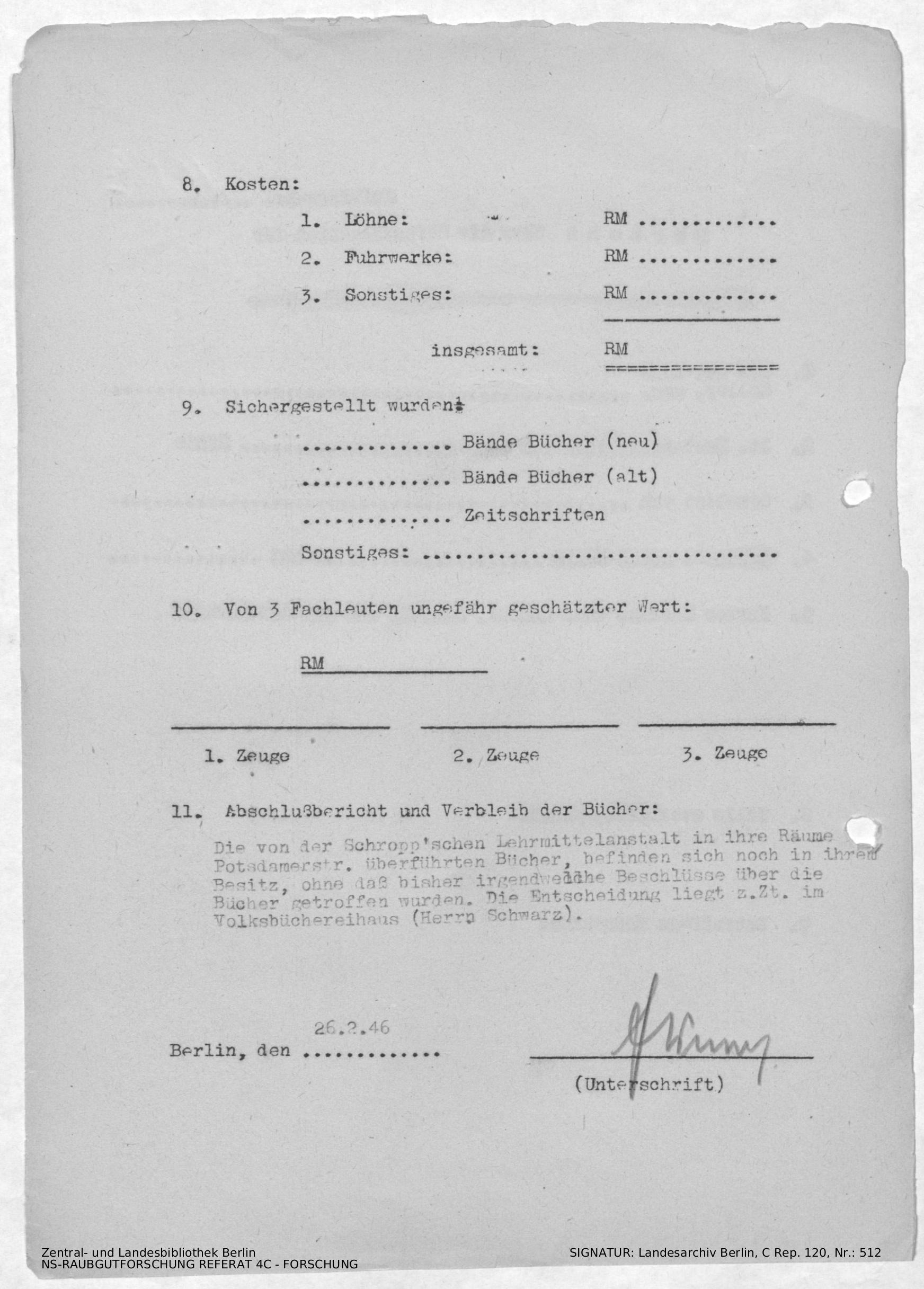 Abschlußbericht: Bibliothek im September 1945 erkundet, konnte jedoch nicht sichergestellt werden, da die Militärbehörden Interesse an Bibliothek zeigten.
