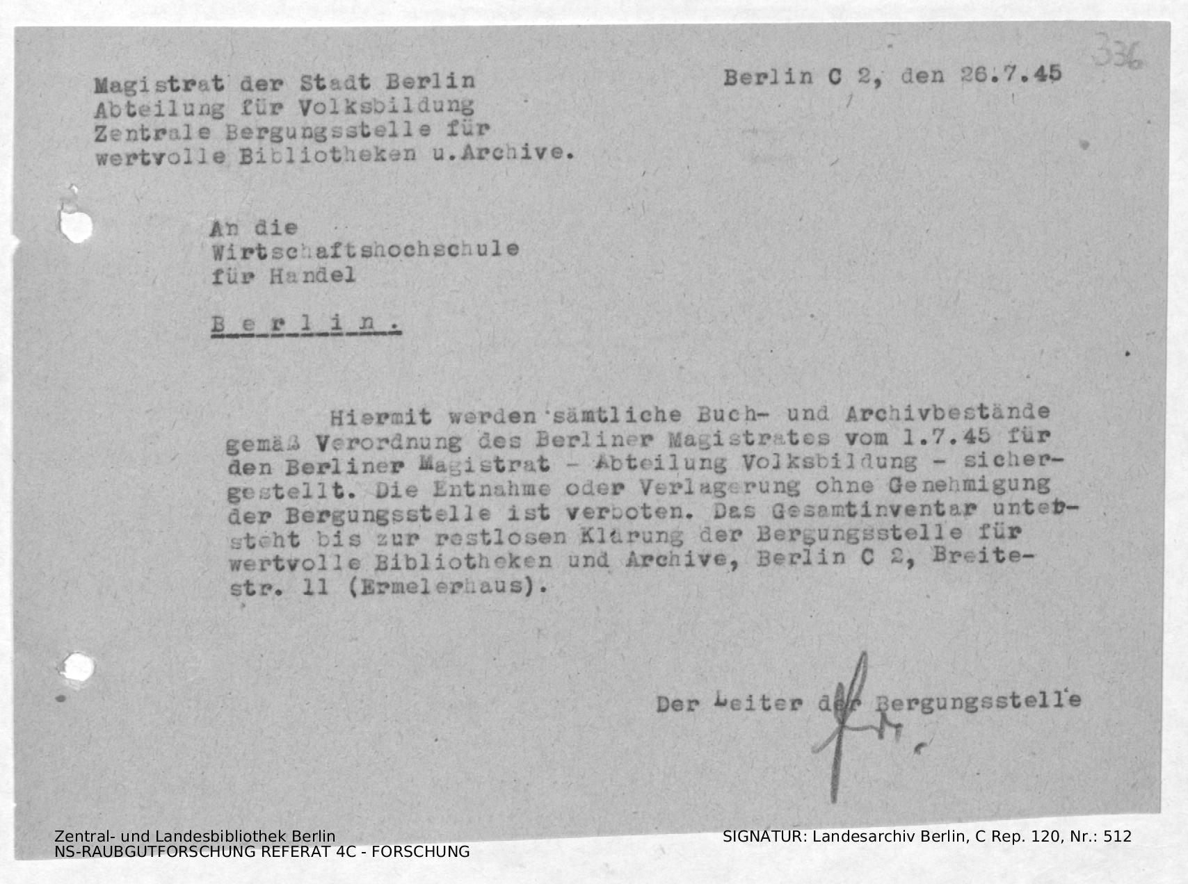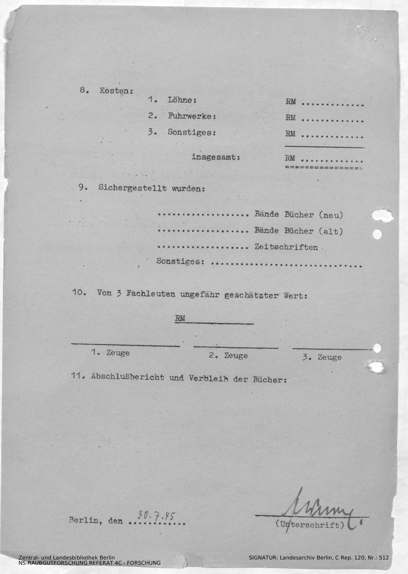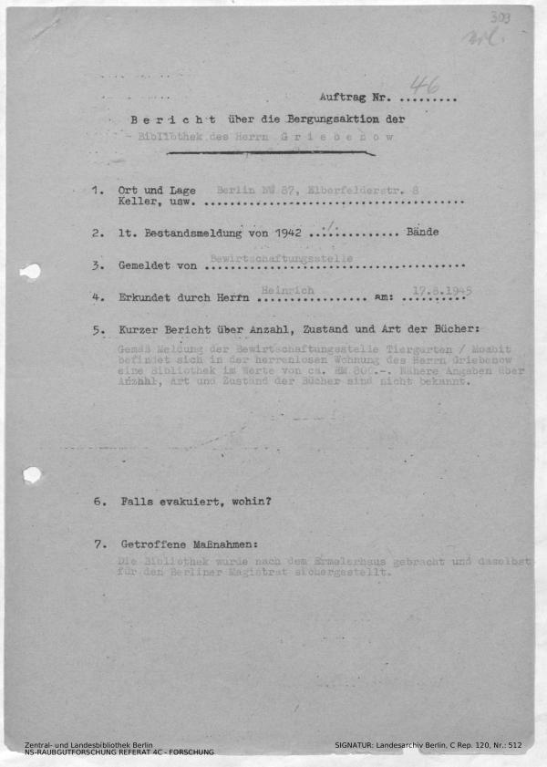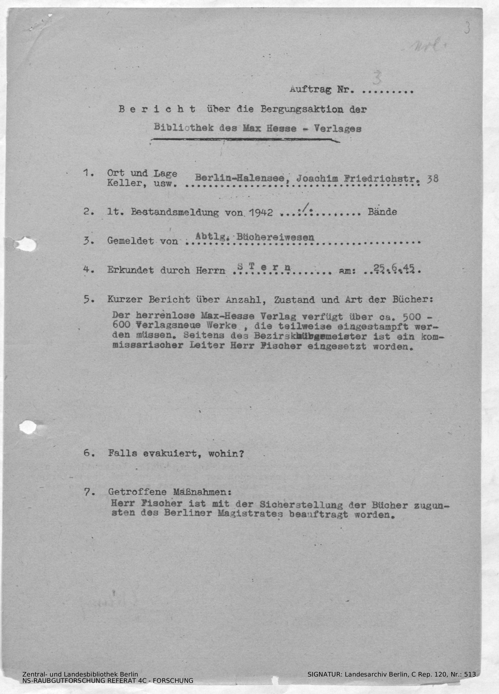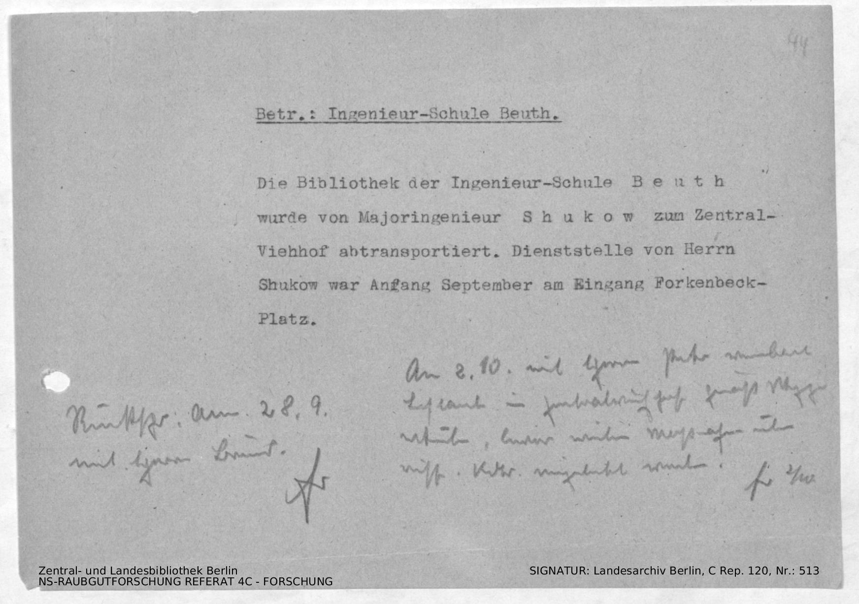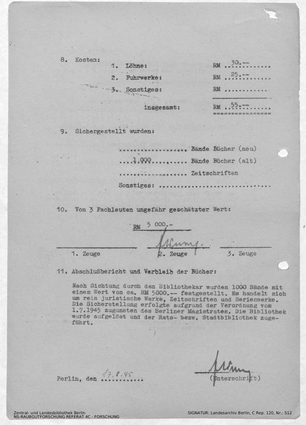 Abschlußbericht: Bibliothek im September 1945 erkundet, konnte jedoch nicht sichergestellt werden, da die Militärbehörden Interesse an Bibliothek zeigten.
