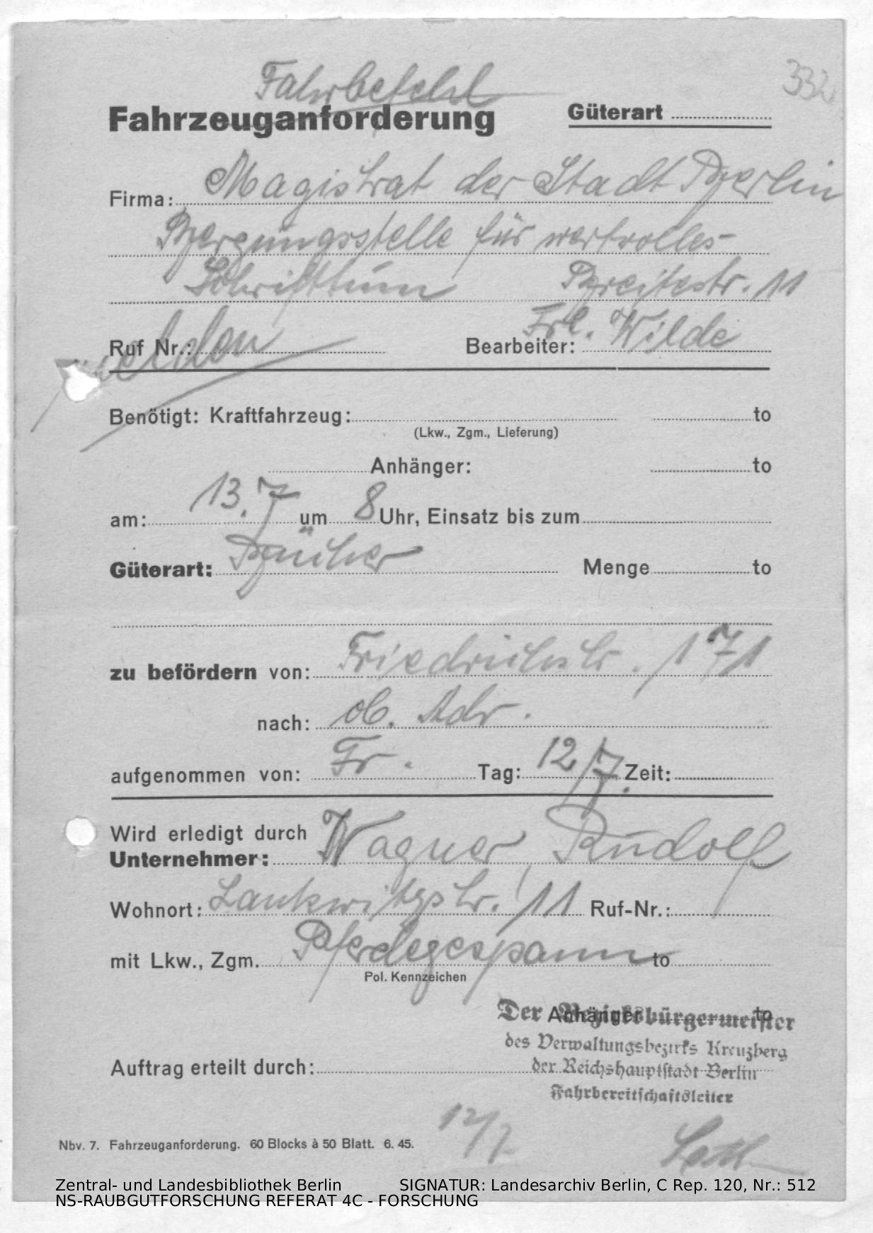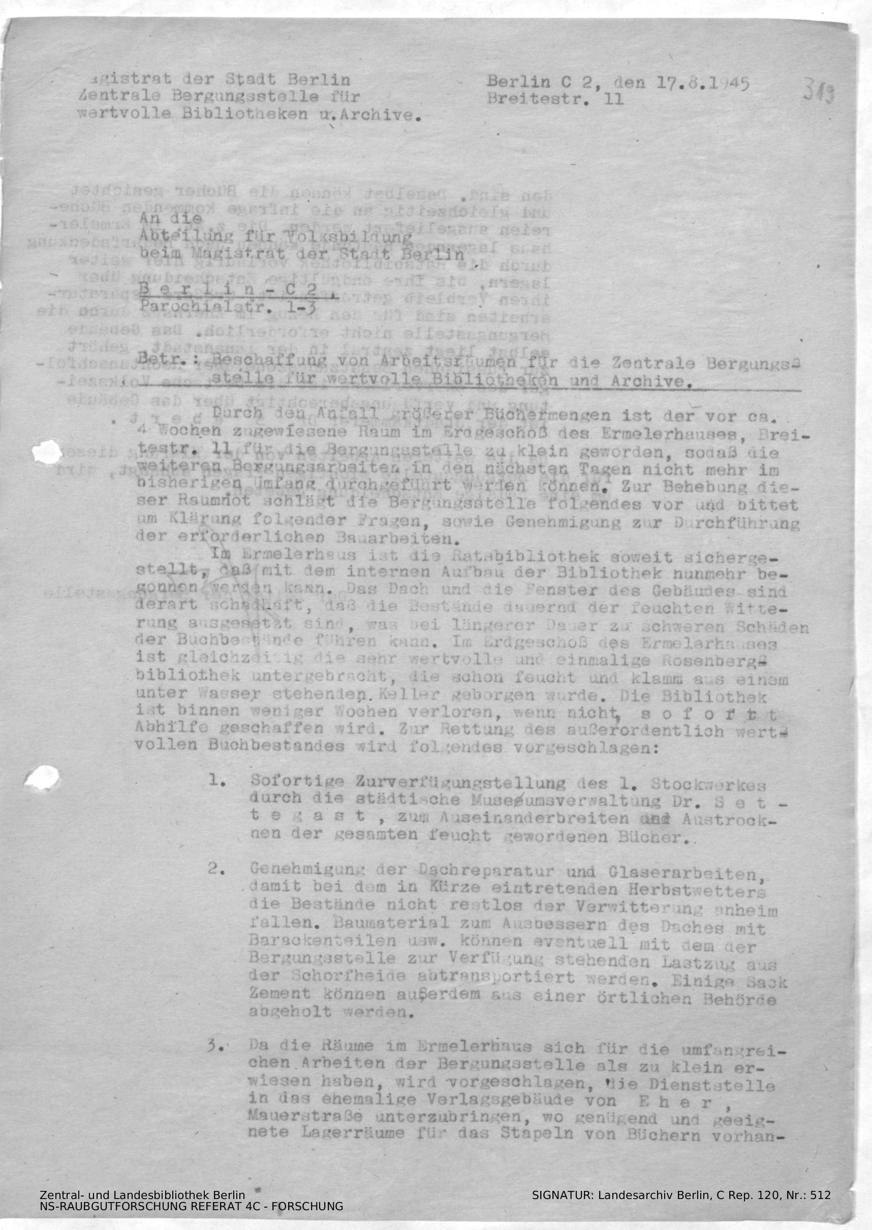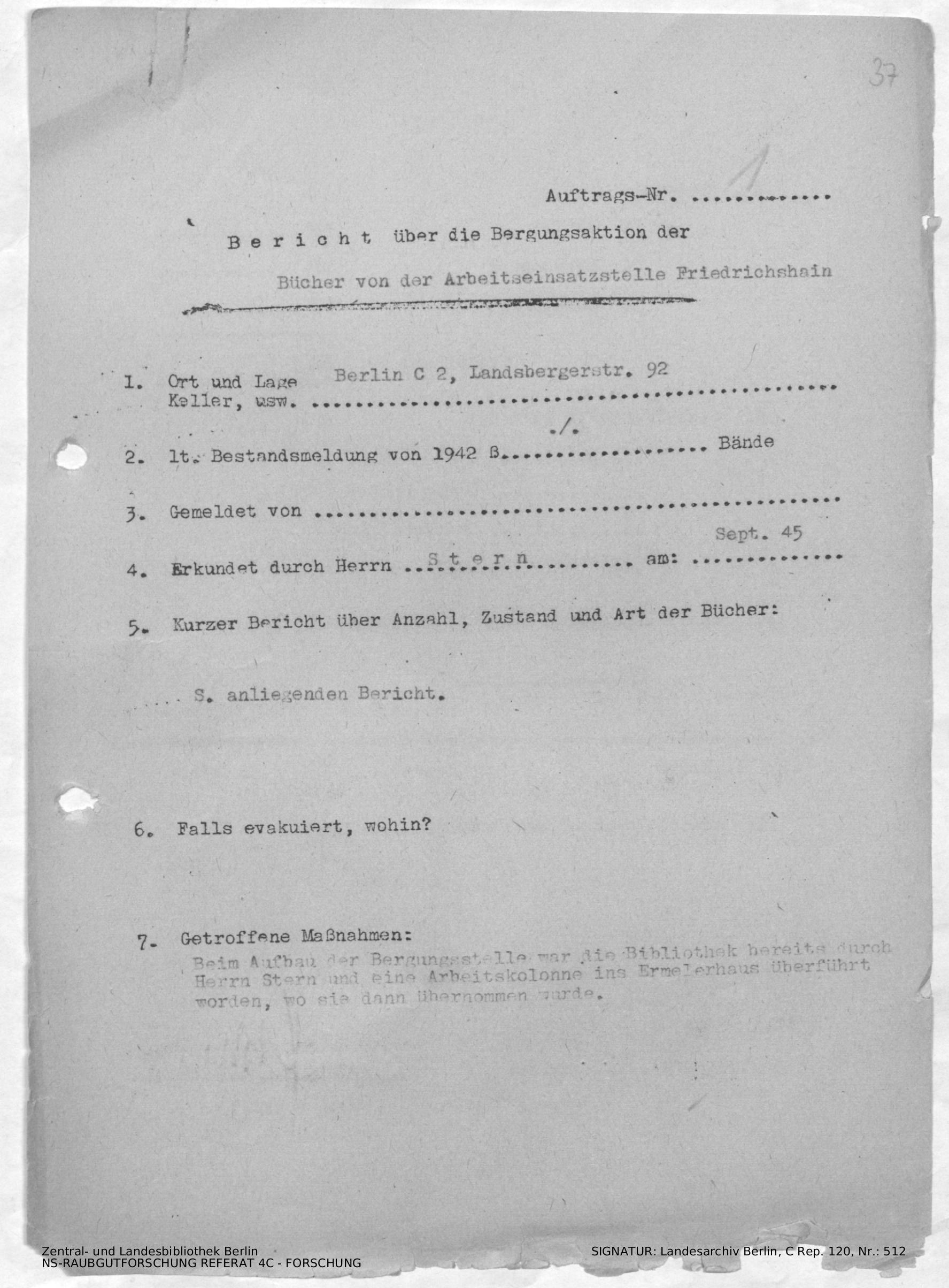 Bericht über die Bergungsaktion der Bücher von der Arbeitseinsatzstelle Friedrichshain