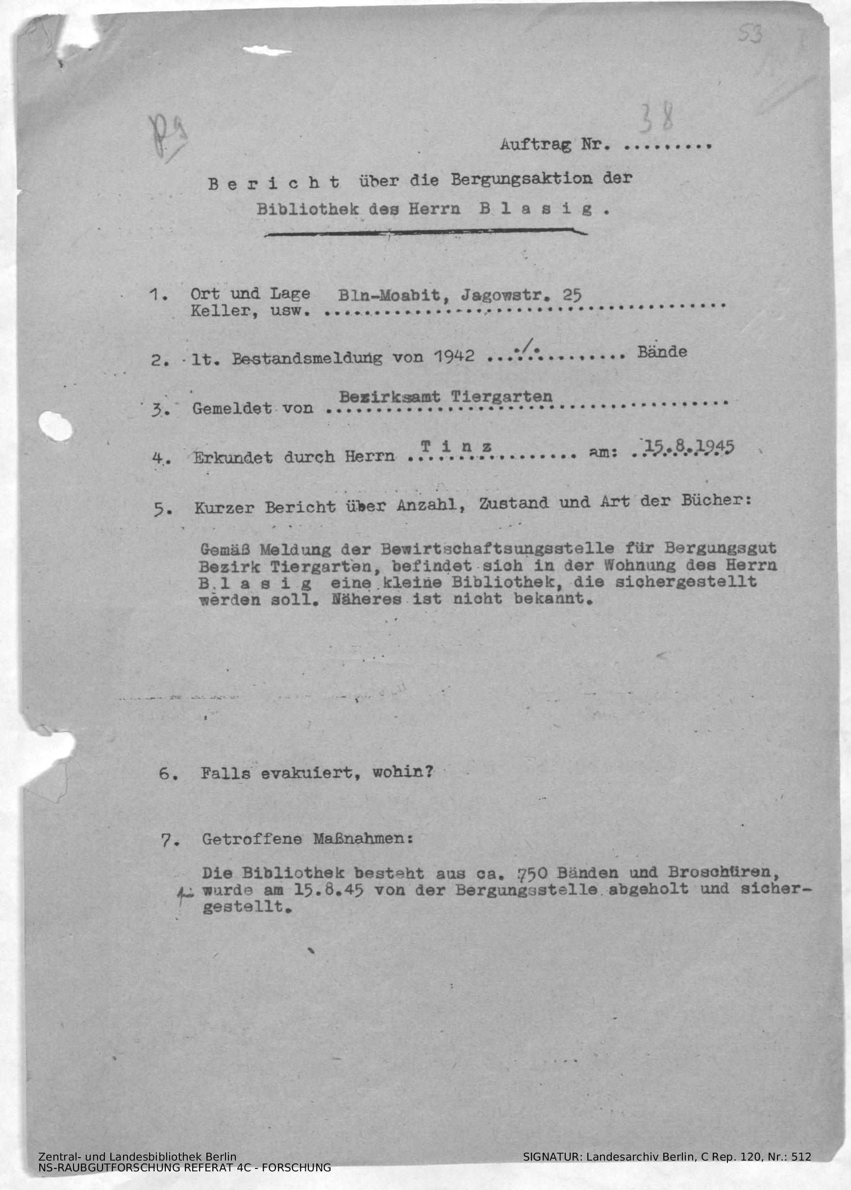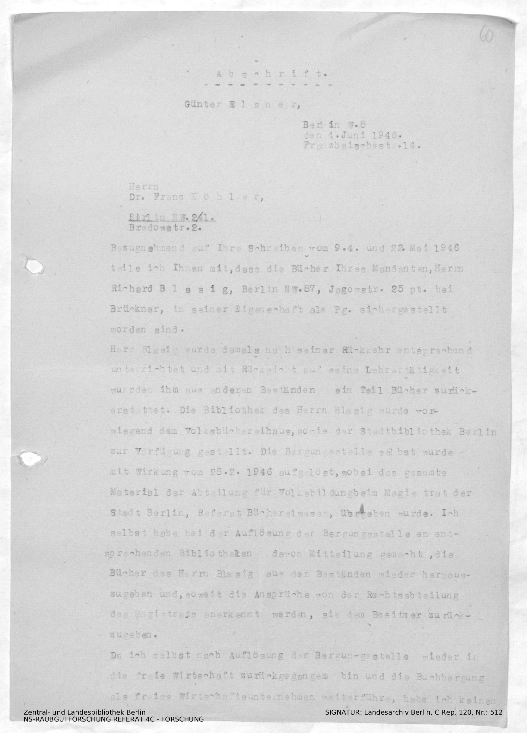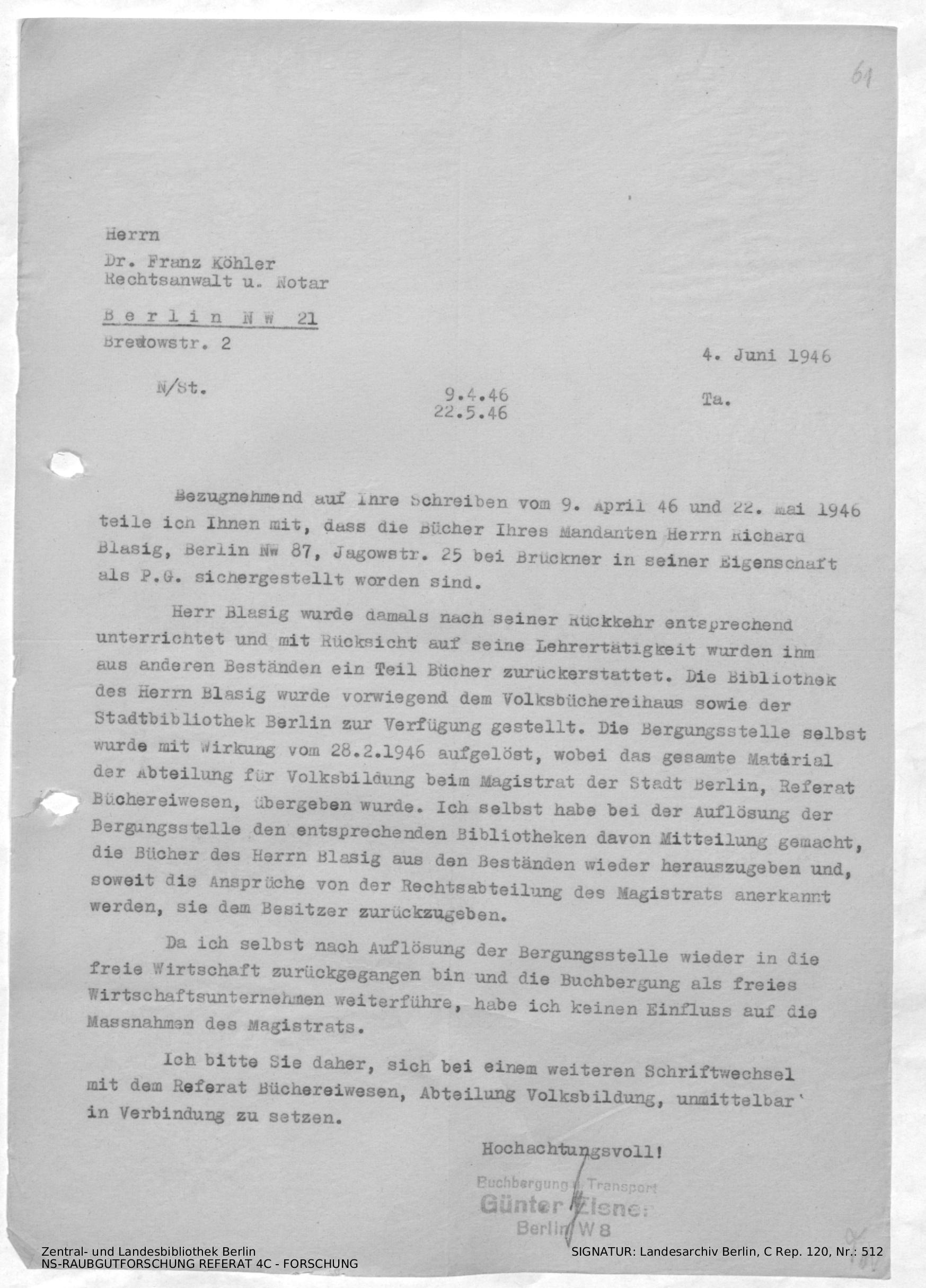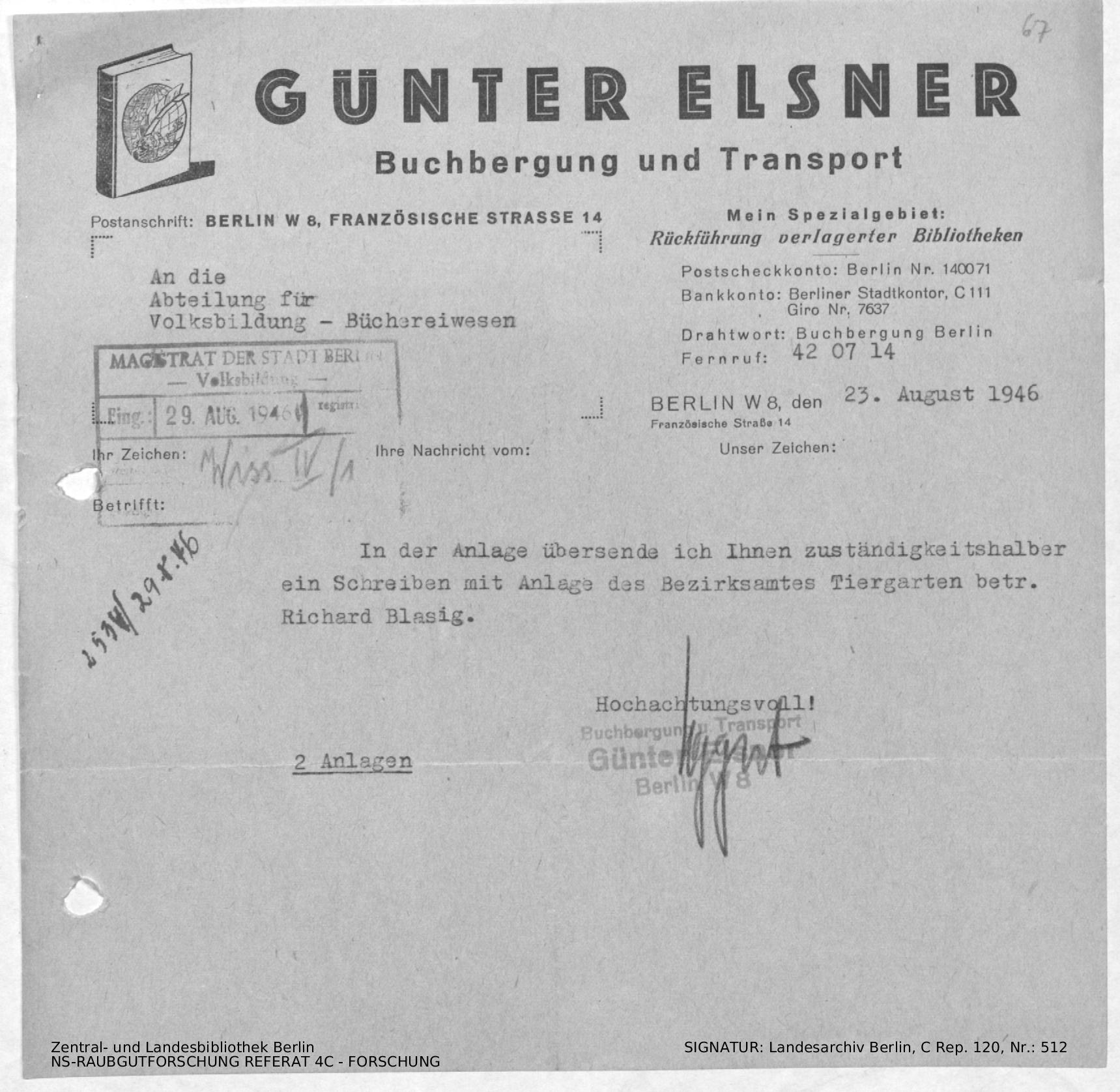 Hinweise zum Verbleib der Bibliothek von Richard Blasig und dem Stand der Dinge sowei zur Sicherstellung der Bibliothek beim "Pg." [Parteigenossen] Brückner. Elsner schreibt ebenfalls, dass die Bergungsstelle inzwischen aufgelöst wurde und er als Unternehmer in der "freien Wirtschaft" weiterhin mit Bergungen von Bibliotheken beschäftigt ist. Abschrift und Original Schreiben von Elsner.