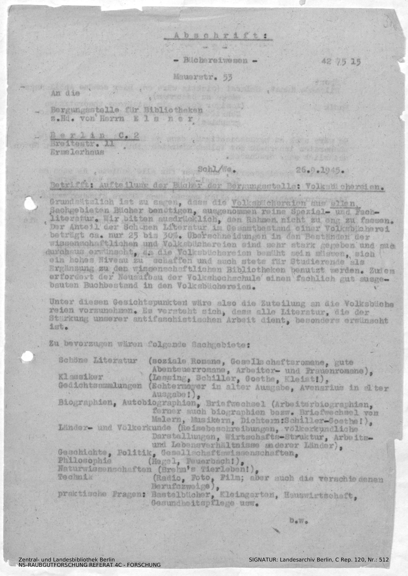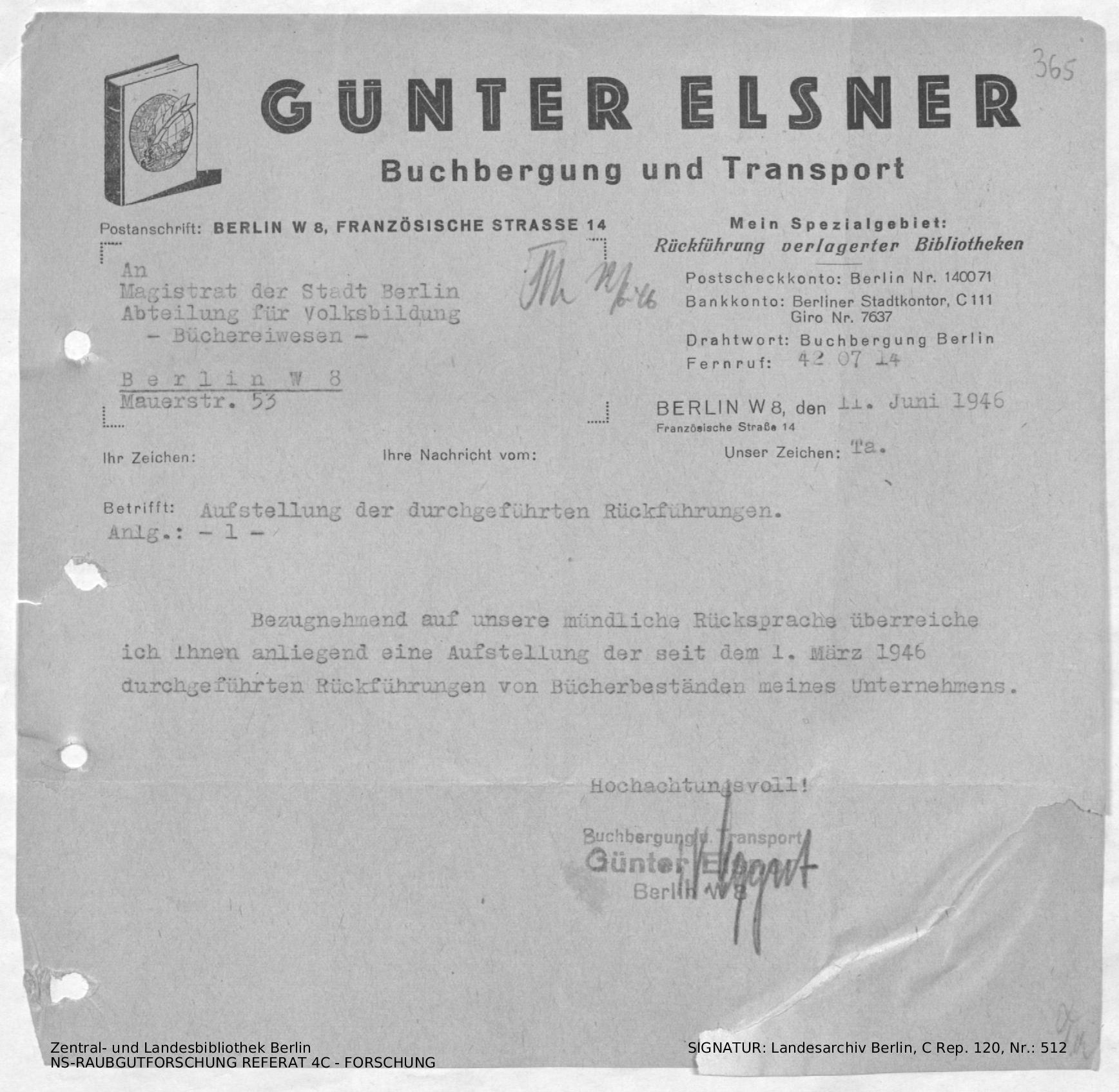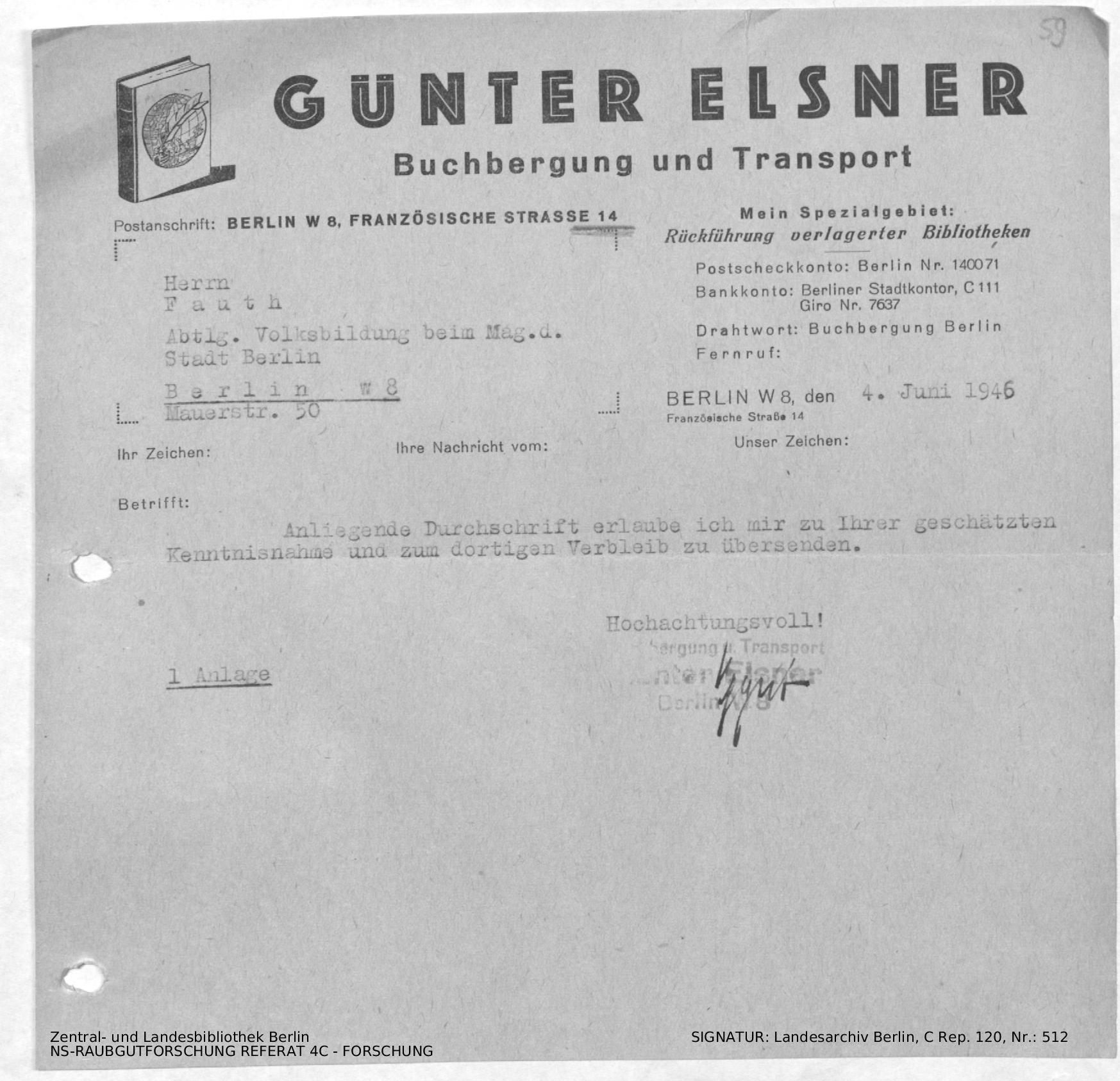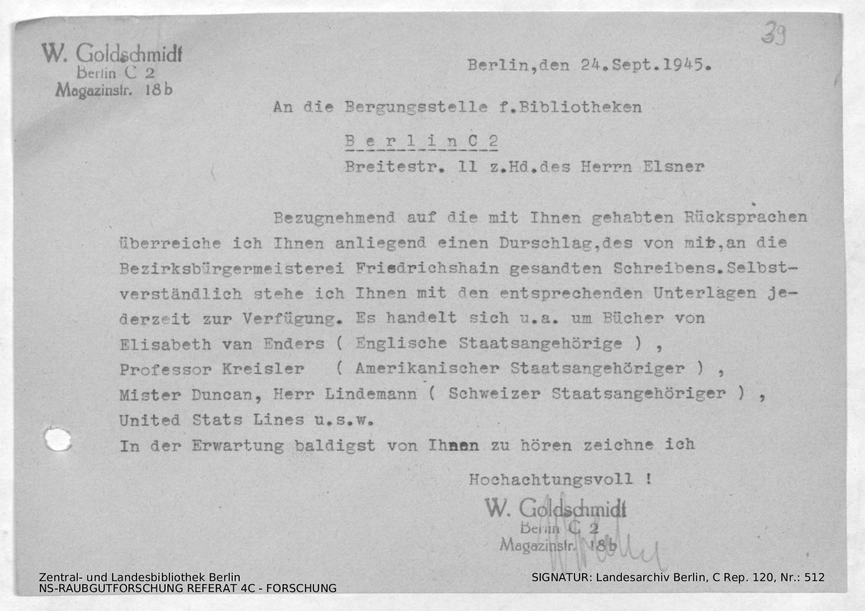 Hinweise zum Verbleib der Bibliothek von Richard Blasig und dem Stand der Dinge sowei zur Sicherstellung der Bibliothek beim "Pg." [Parteigenossen] Brückner. Elsner schreibt ebenfalls, dass die Bergungsstelle inzwischen aufgelöst wurde und er als Unternehmer in der "freien Wirtschaft" weiterhin mit Bergungen von Bibliotheken beschäftigt ist. Abschrift und Original Schreiben von Elsner.