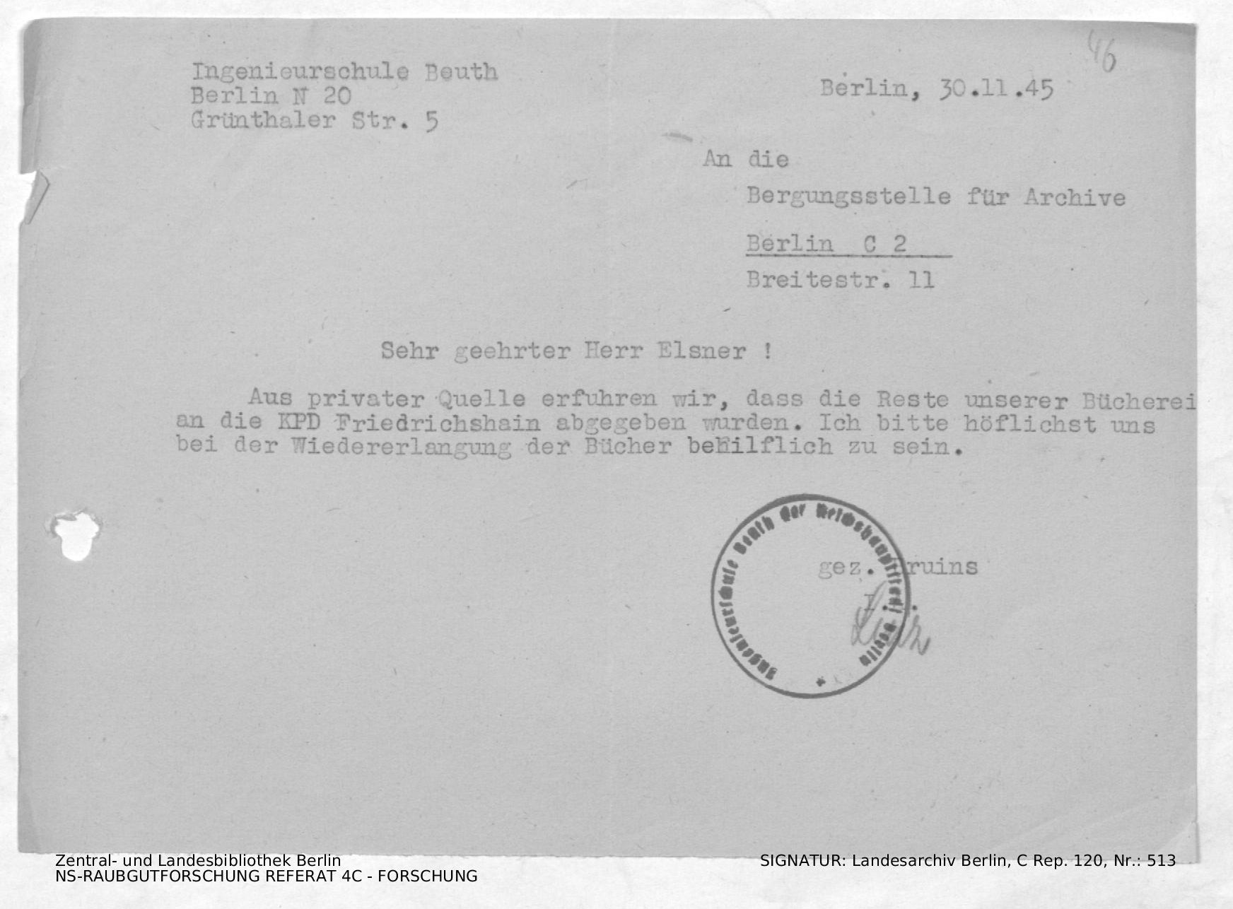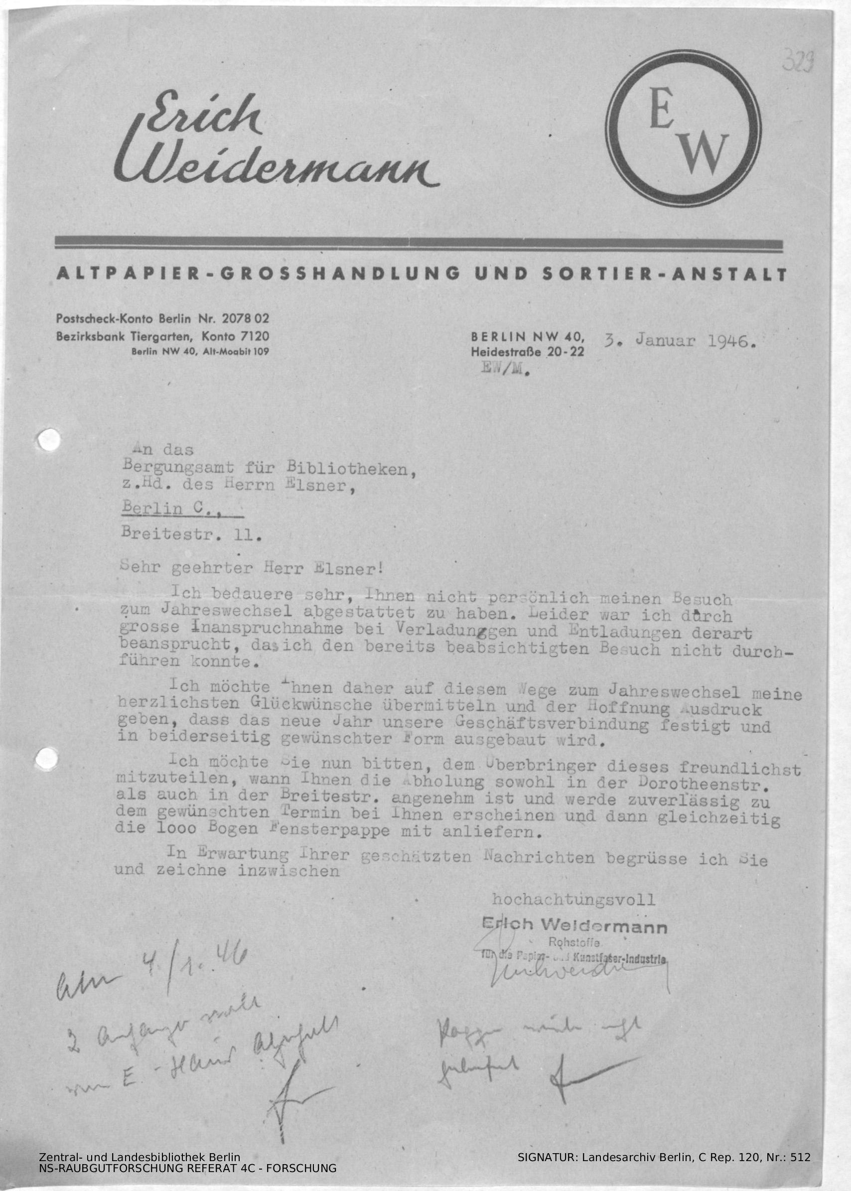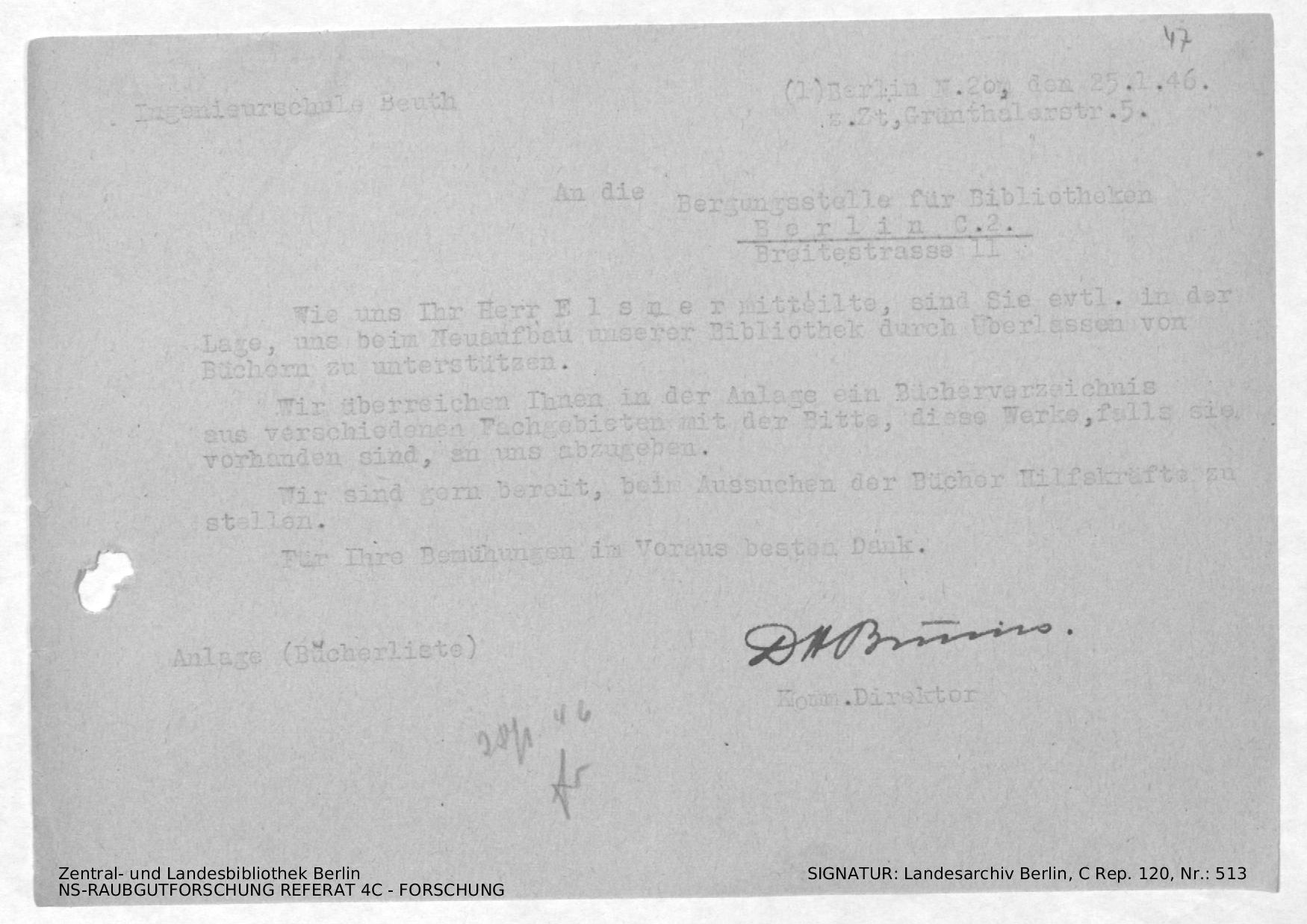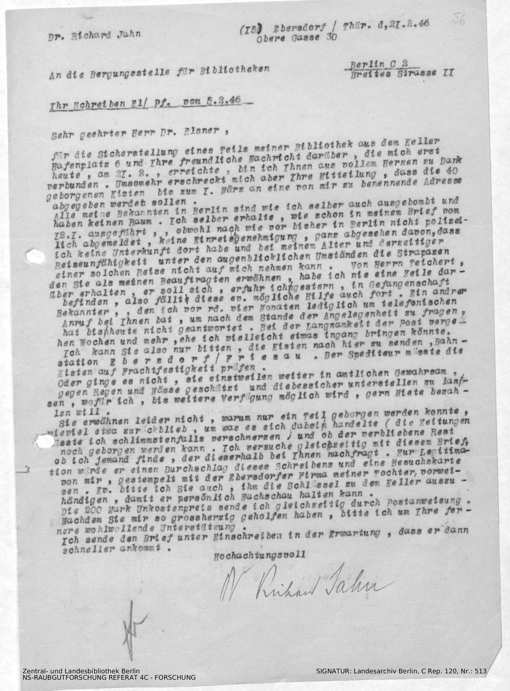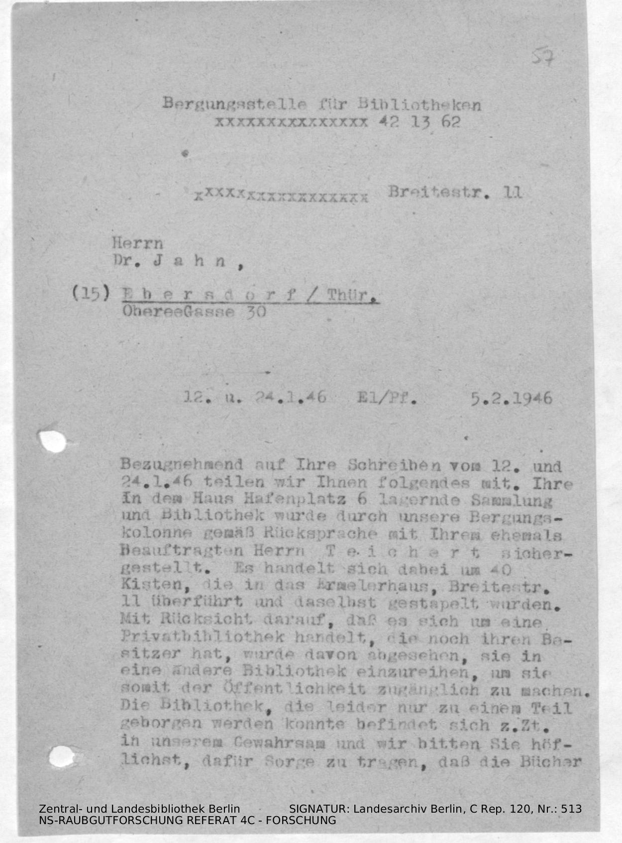 Hinweise zum Verbleib der Bibliothek von Richard Blasig und dem Stand der Dinge sowei zur Sicherstellung der Bibliothek beim "Pg." [Parteigenossen] Brückner. Elsner schreibt ebenfalls, dass die Bergungsstelle inzwischen aufgelöst wurde und er als Unternehmer in der "freien Wirtschaft" weiterhin mit Bergungen von Bibliotheken beschäftigt ist. Abschrift und Original Schreiben von Elsner.