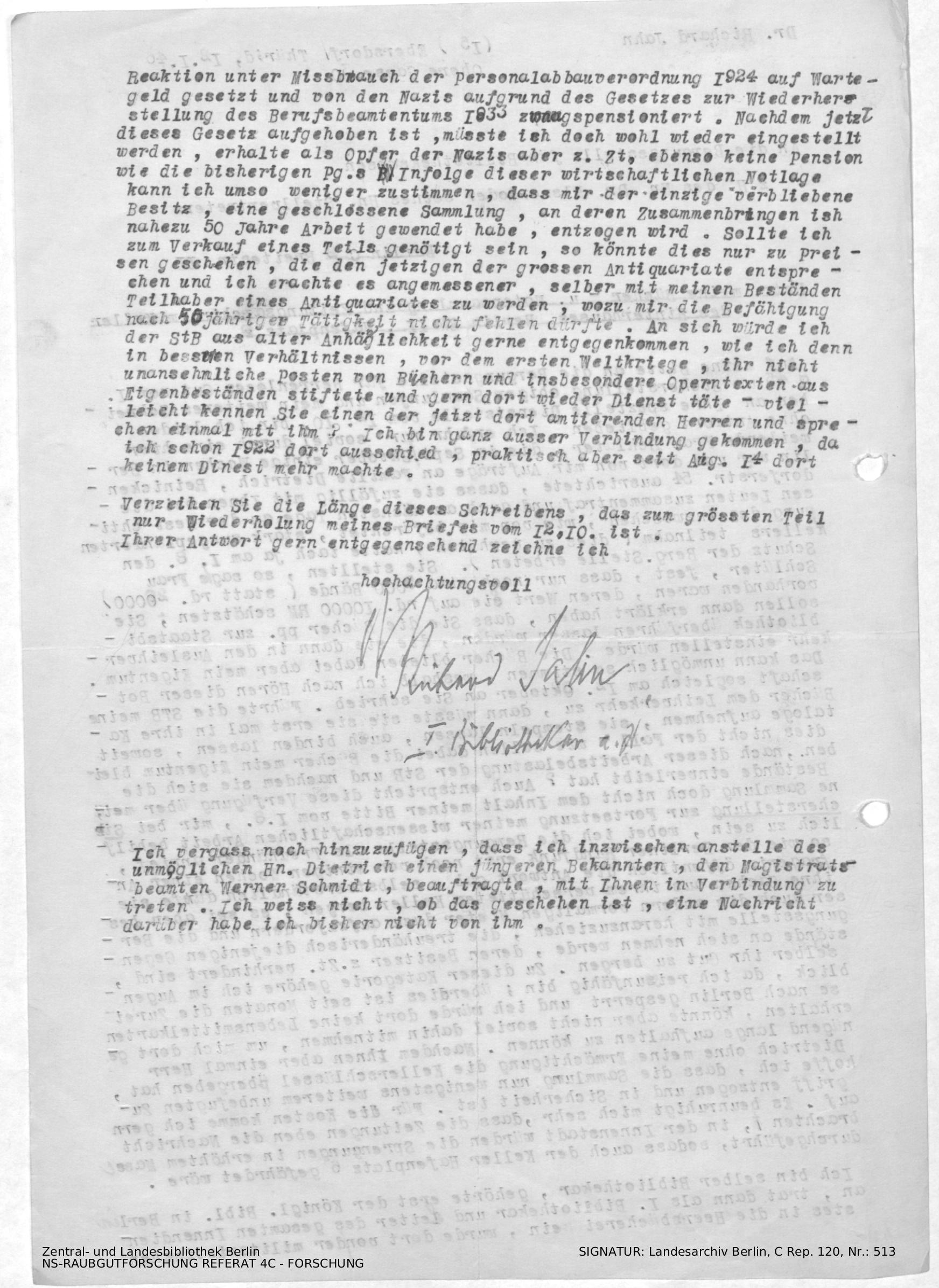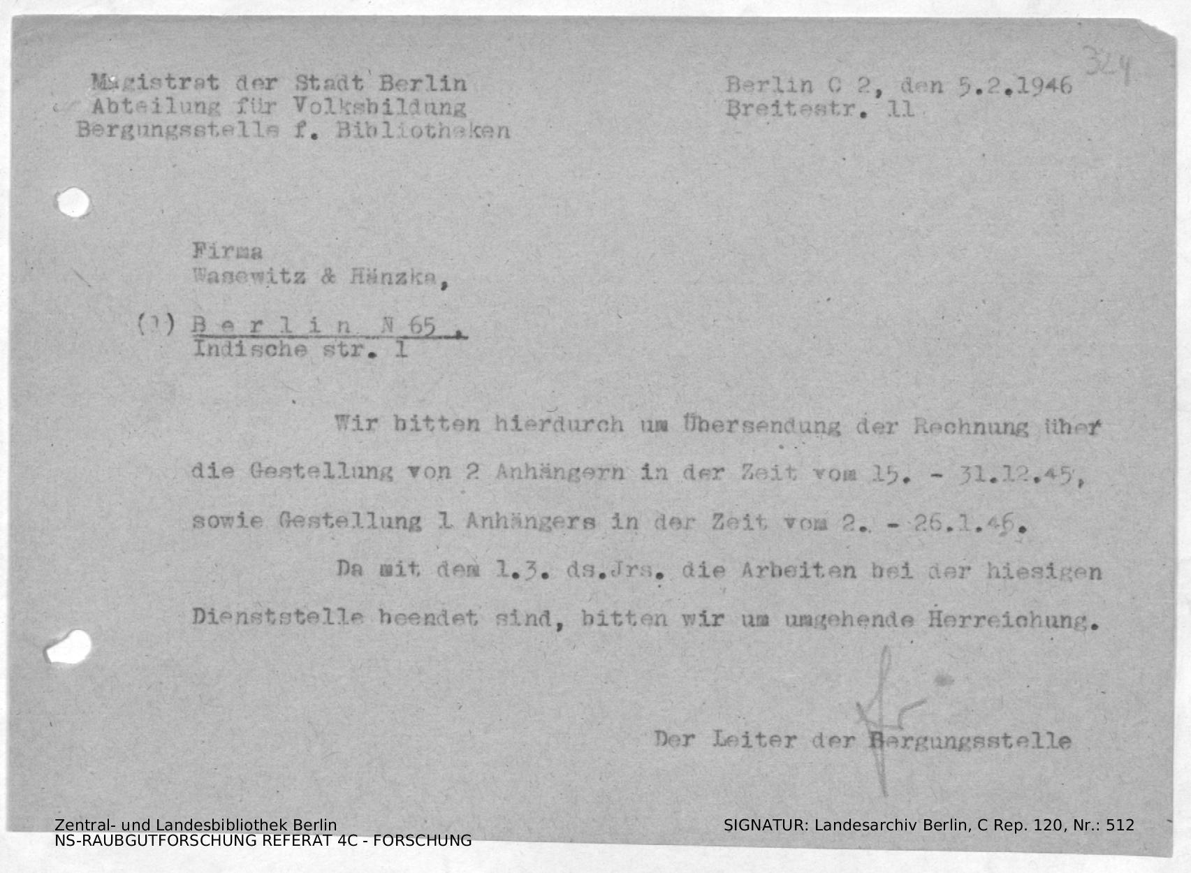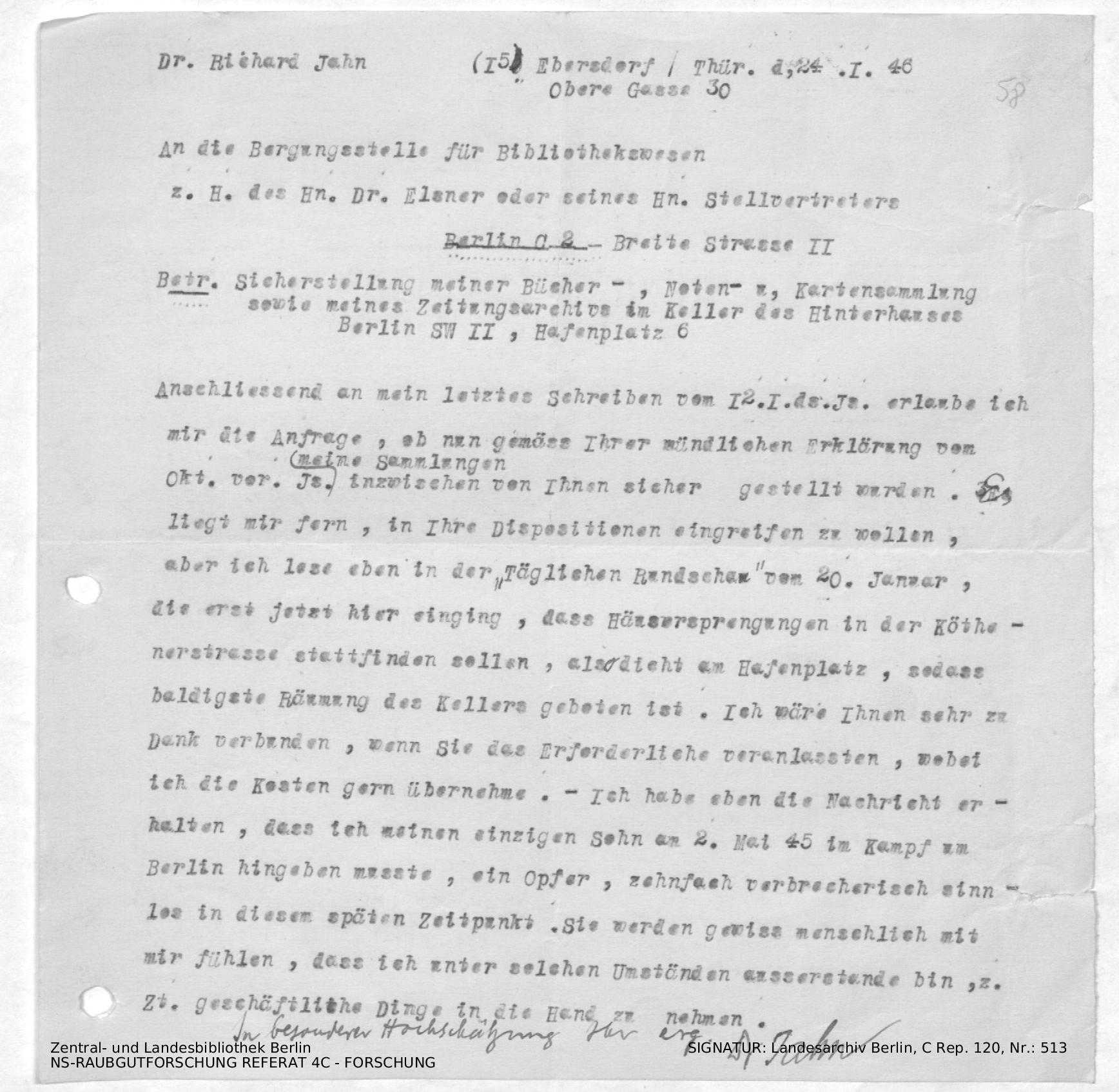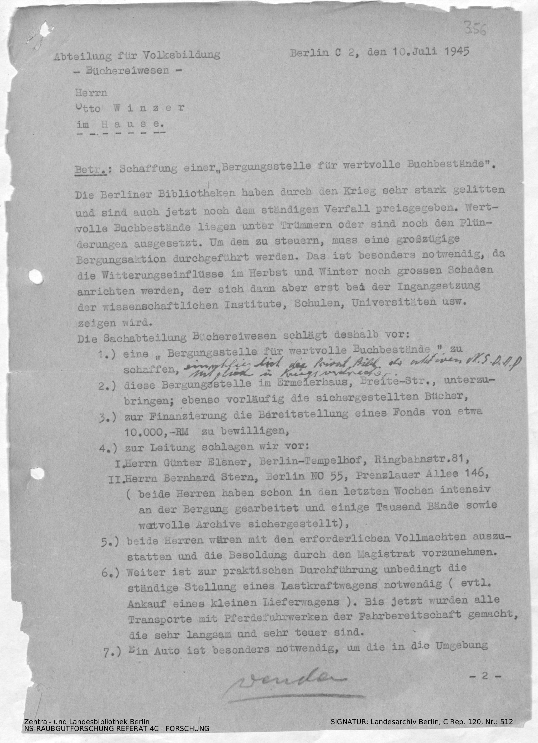 Hinweise zum Verbleib der Bibliothek von Richard Blasig und dem Stand der Dinge sowei zur Sicherstellung der Bibliothek beim "Pg." [Parteigenossen] Brückner. Elsner schreibt ebenfalls, dass die Bergungsstelle inzwischen aufgelöst wurde und er als Unternehmer in der "freien Wirtschaft" weiterhin mit Bergungen von Bibliotheken beschäftigt ist. Abschrift und Original Schreiben von Elsner.
