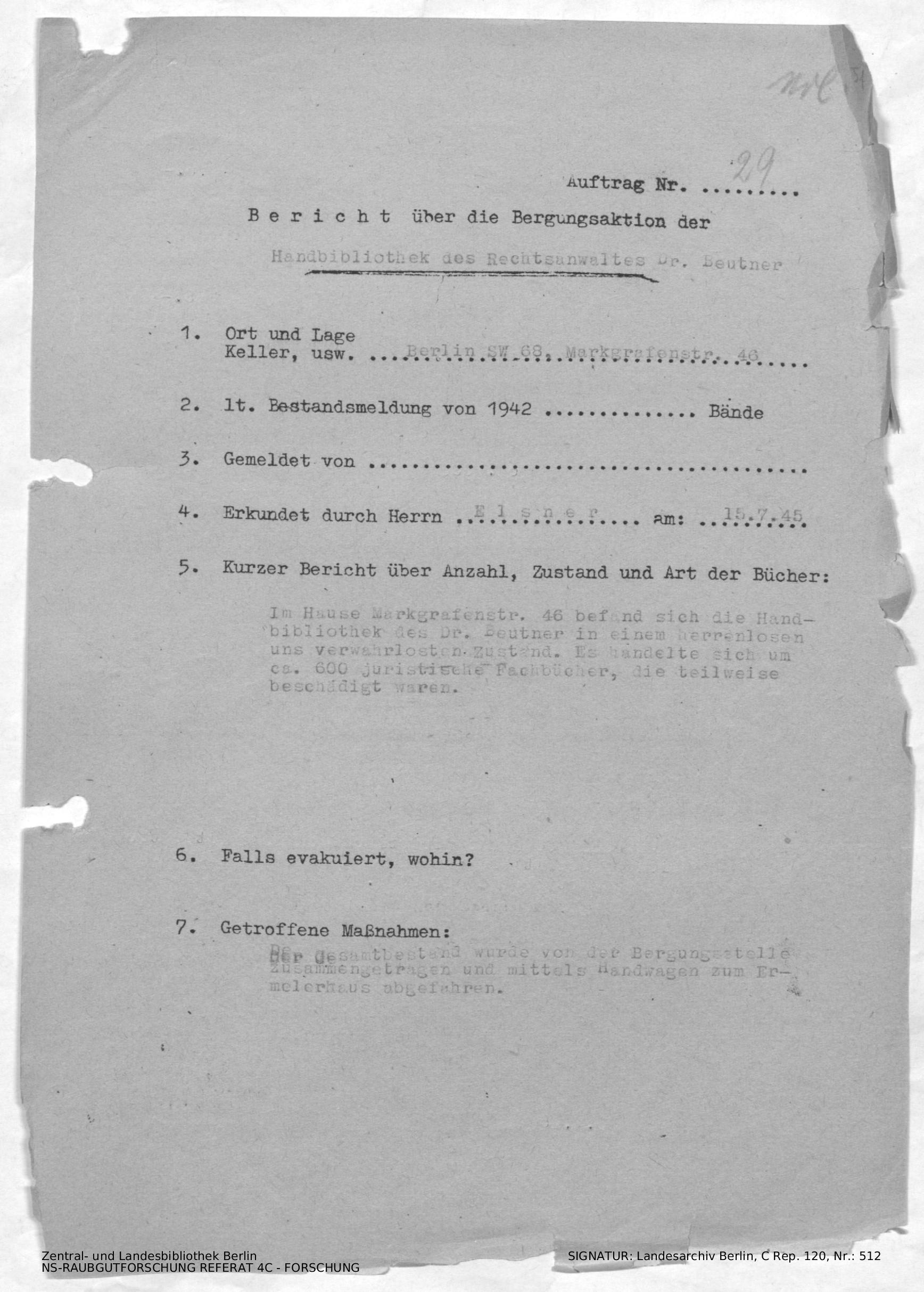 Bericht über die Bergungsaktion der Handbibliothek des Rechtsanwaltes Dr. Beutner