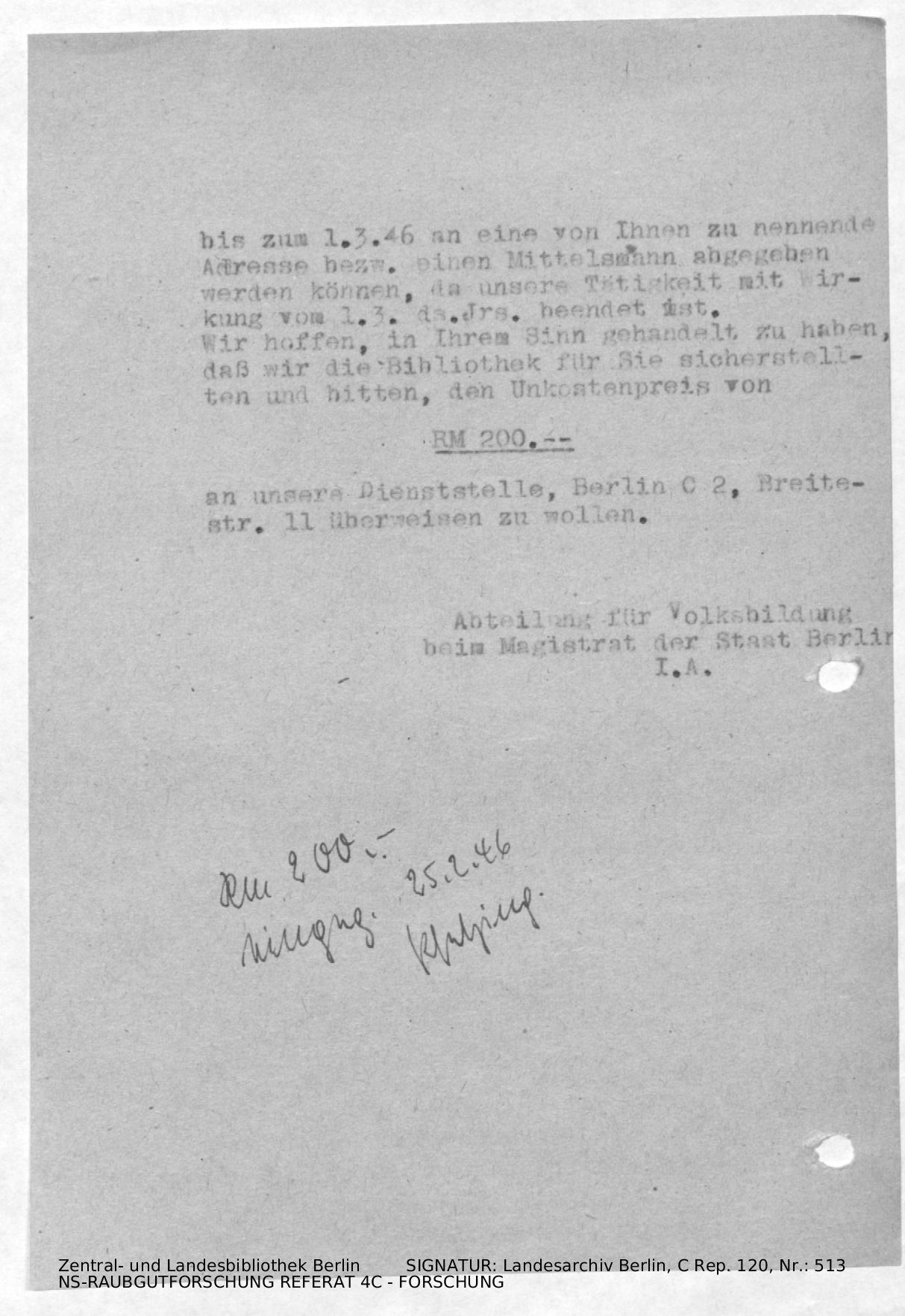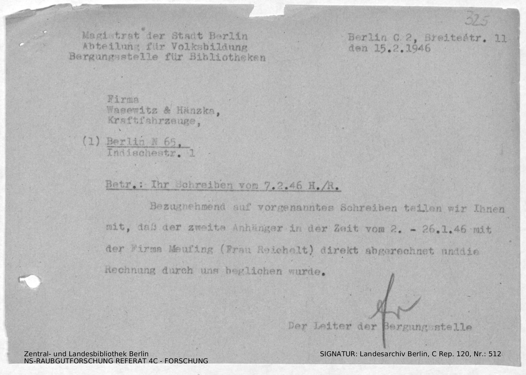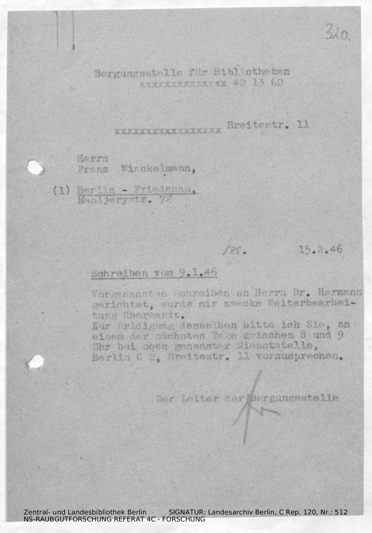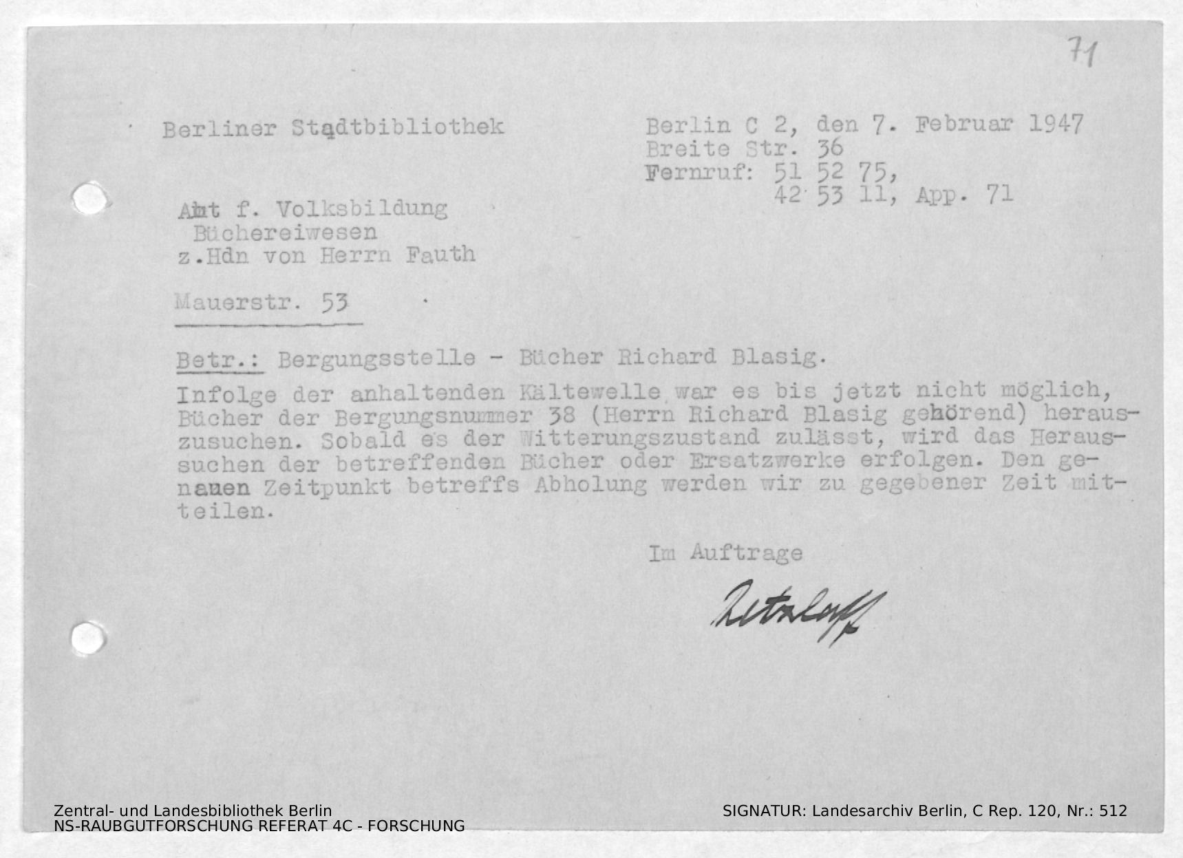 Schreiben zur Rückgabe der Bibliothek von Richard Blasig